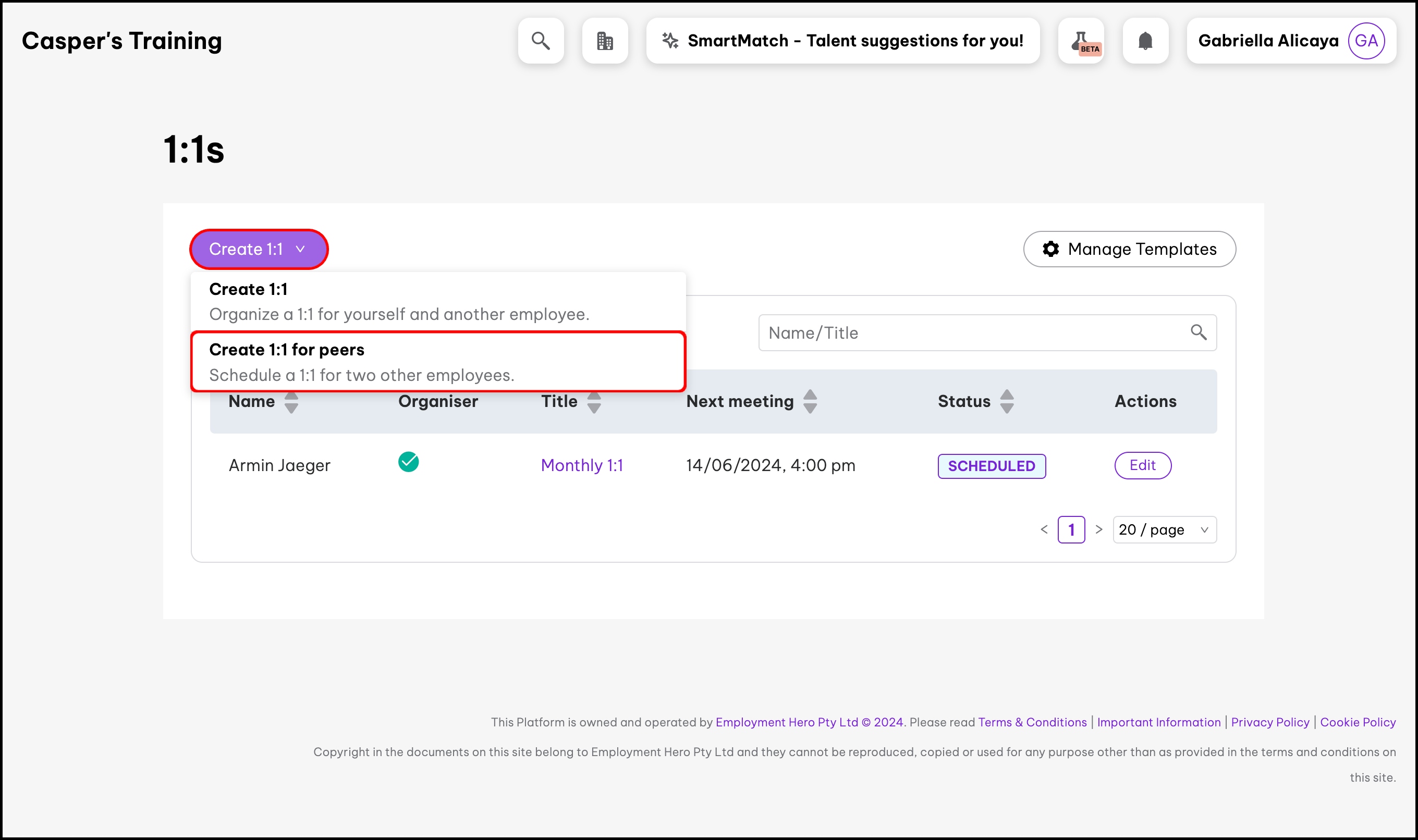 screenshot of the one on ones page, highlighting the create one on one dropdown and create one on one for peers buttons