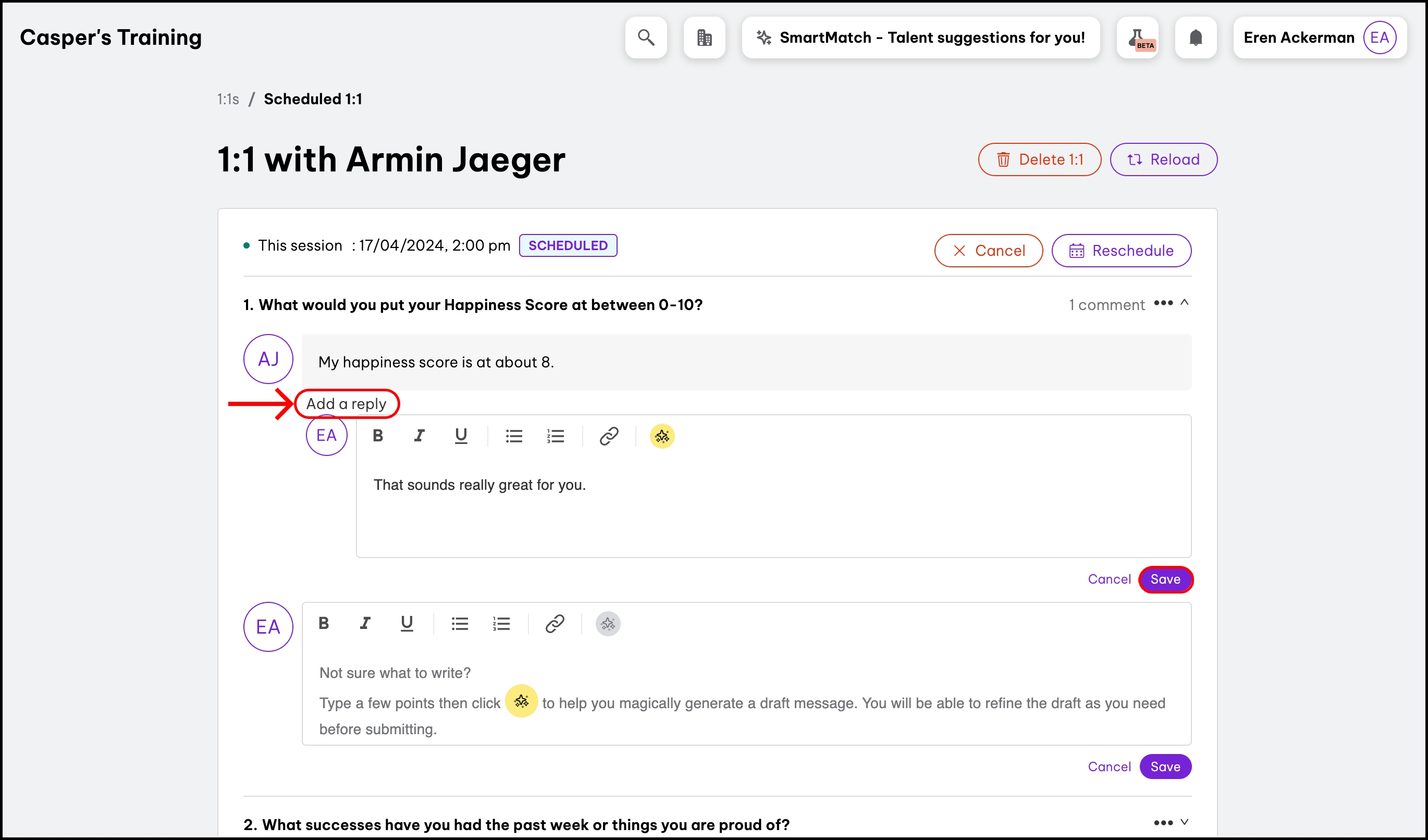 screenshot of the one on one page, highlighting the add a reply and save buttons
