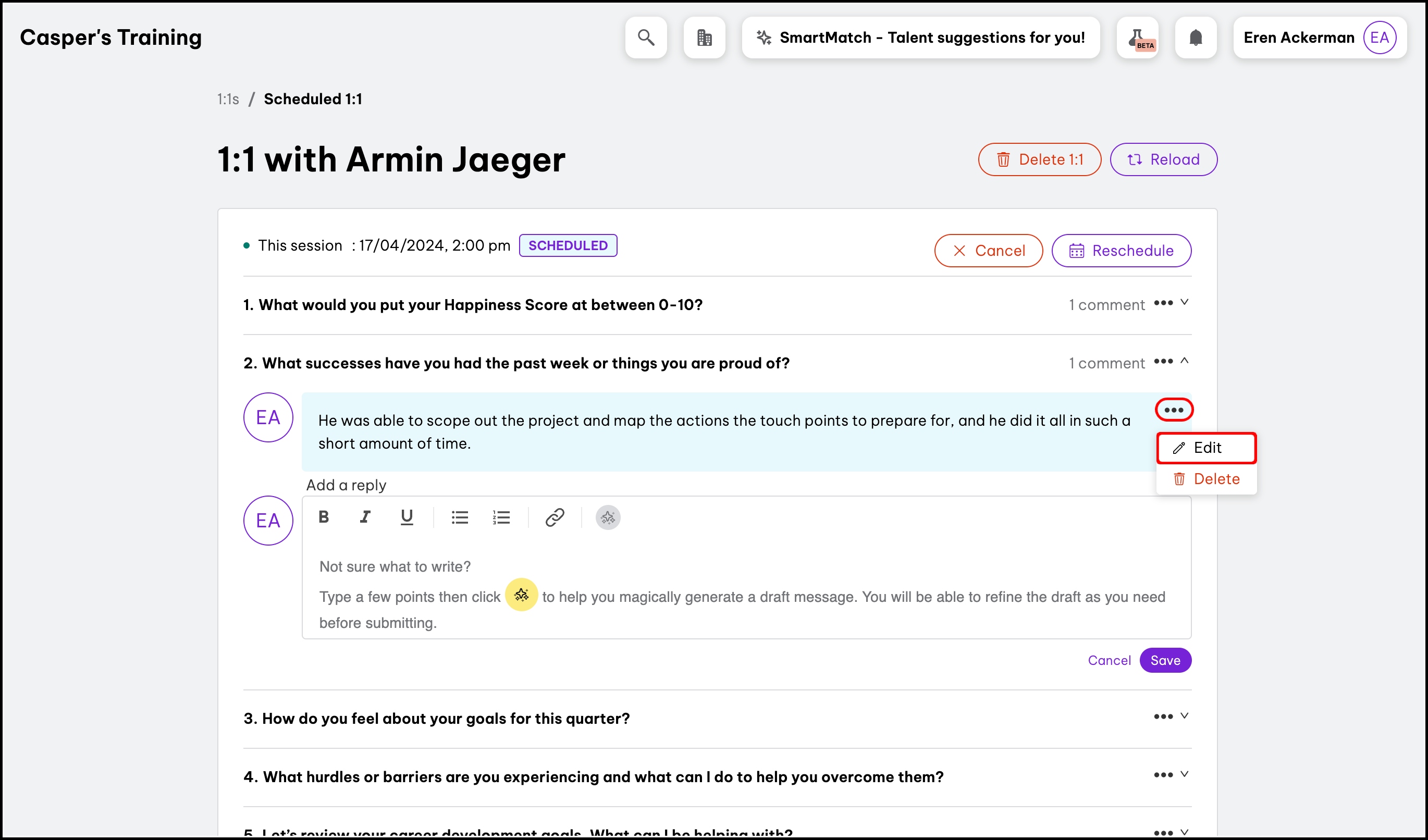 screenshot of the one on one page, highlighting the three dots and edit button for a comment