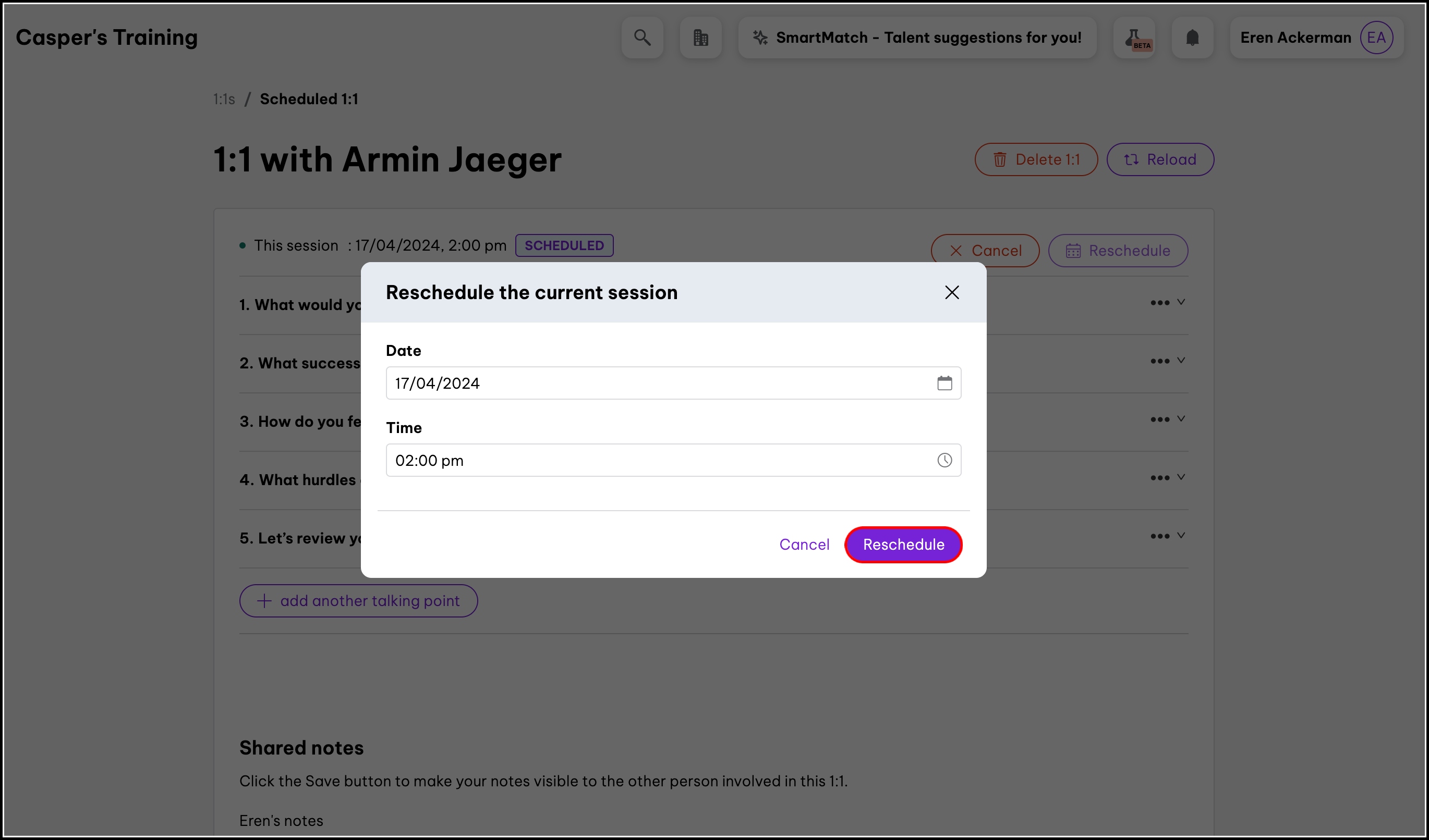 screenshot of the reschedule current session popup, highlighting the reschedule button