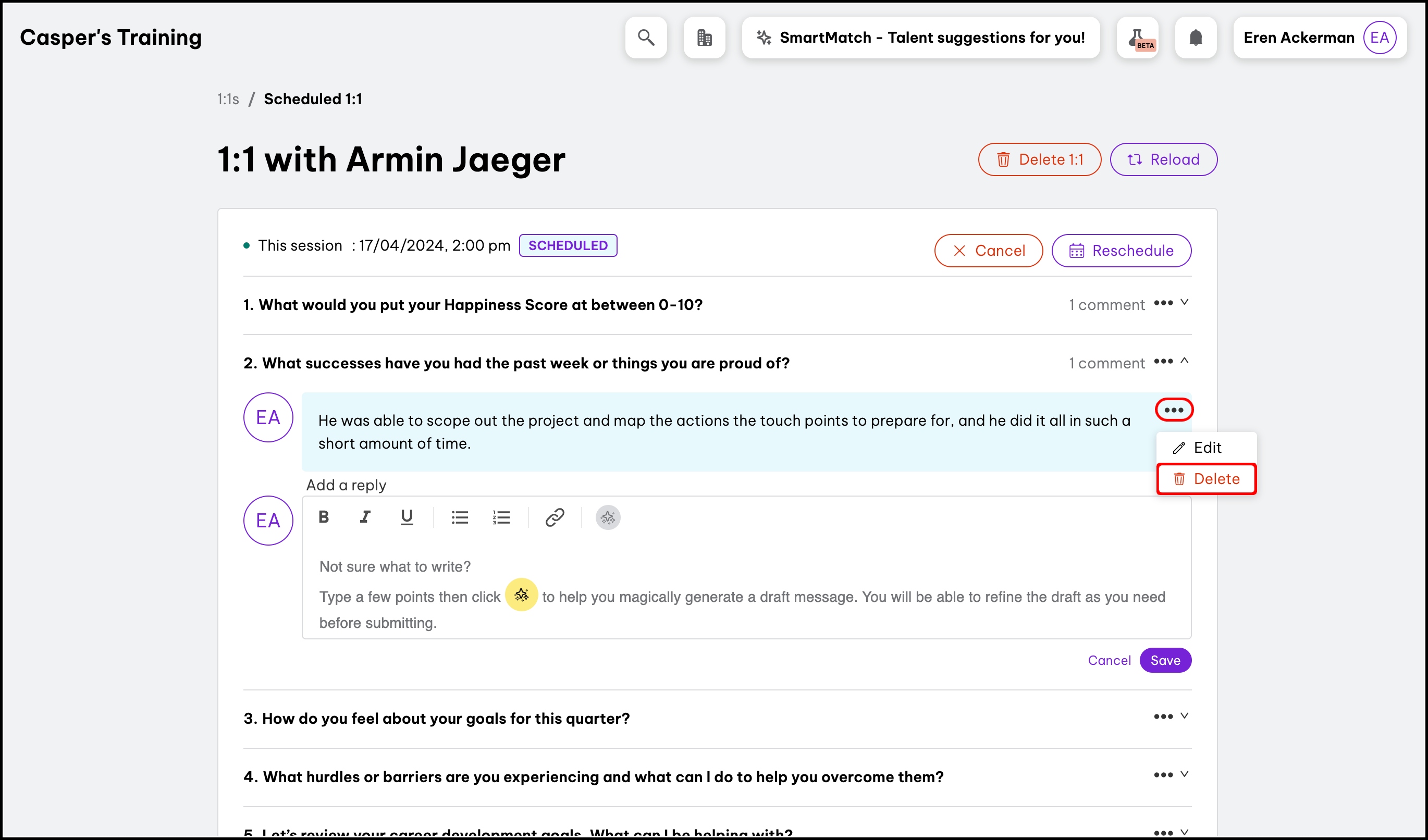 screenshot of the one on one page, highlighting the three dots and delete button for a comment