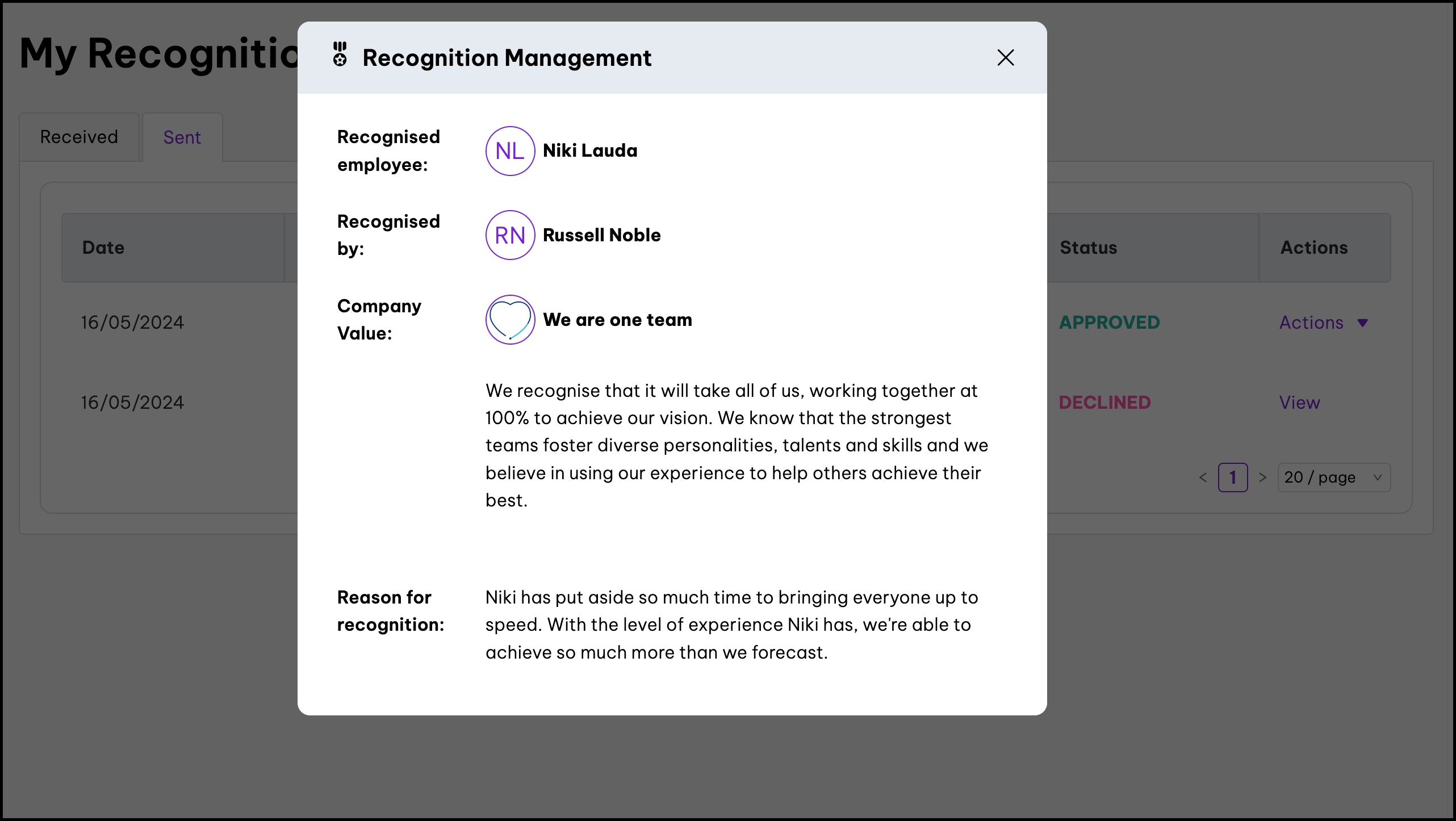 Recognition allows employers to reward employees who go above and beyond in their role. With our HR platform we link each recognition to one of your organisation's company values. This not only celebrates performance but also reinforces company values. The My Recognition feature lets you view and download certificates for all approved recognitions you have received and sent within your organisation.