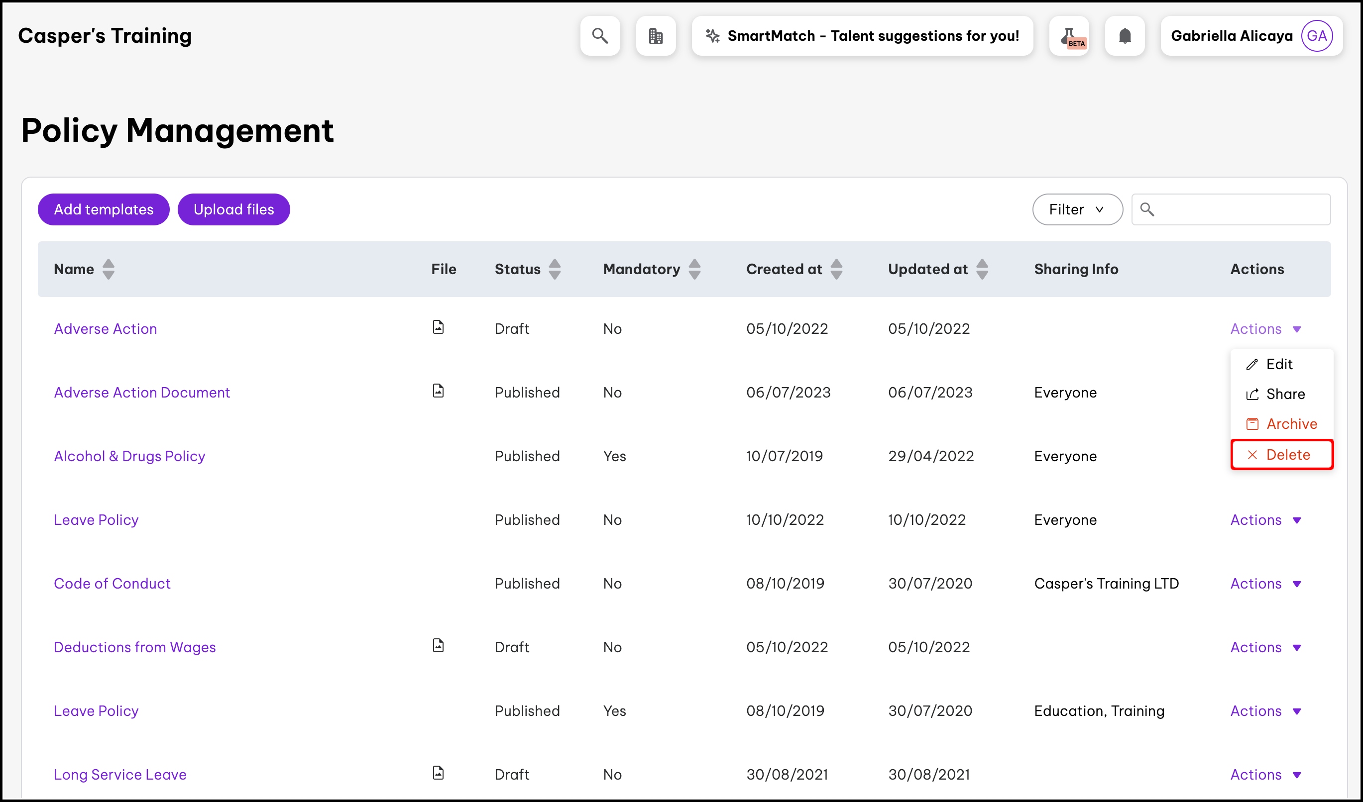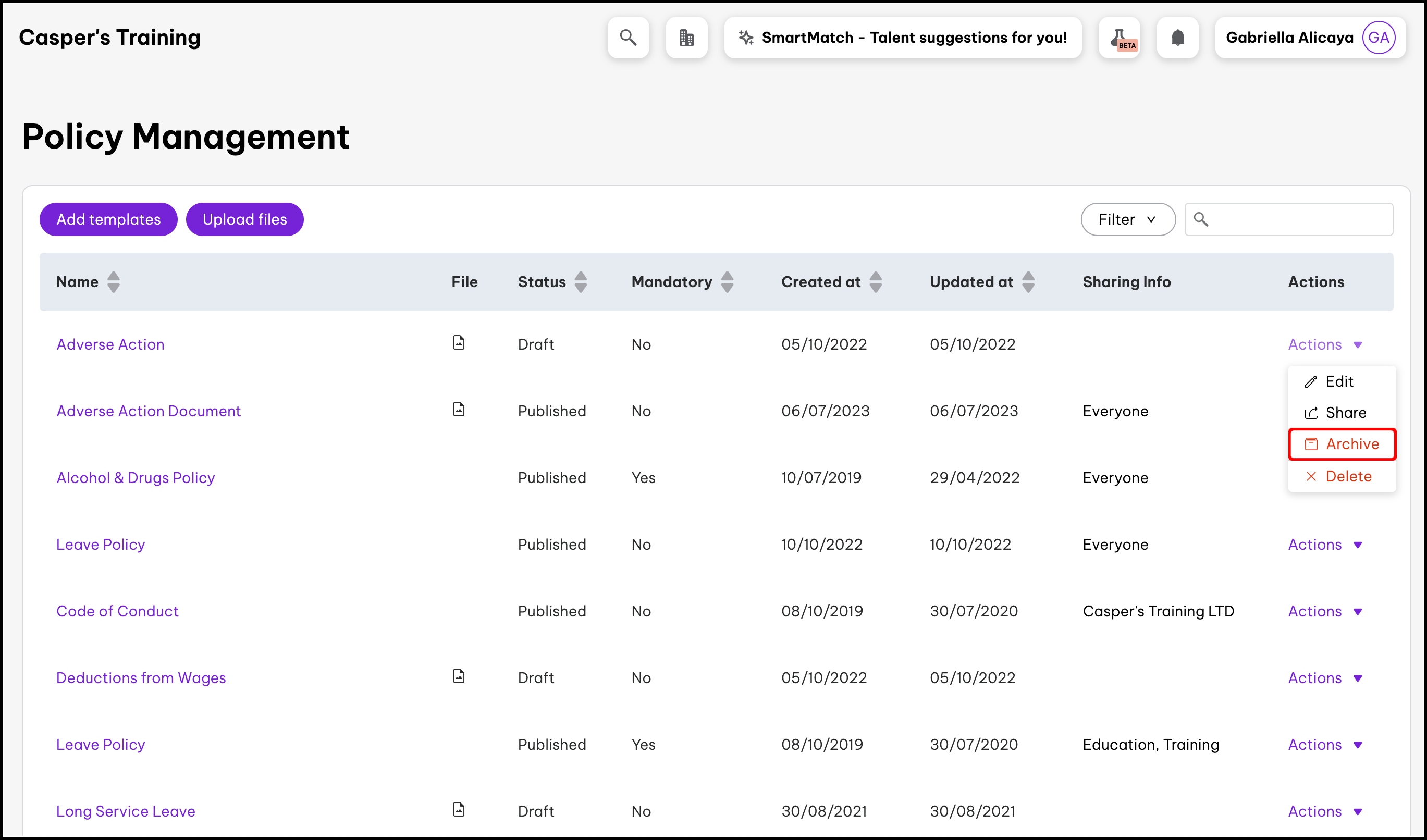 The Policies feature allows you to choose from Employment Hero's pre-made content or upload your own documentation and then share the content with your employees. You can also use this feature to edit the information if it changes, archive a document you no longer need and/or delete a policy. Once a policy shows the status of archived, an employee can no longer acknowledge it.