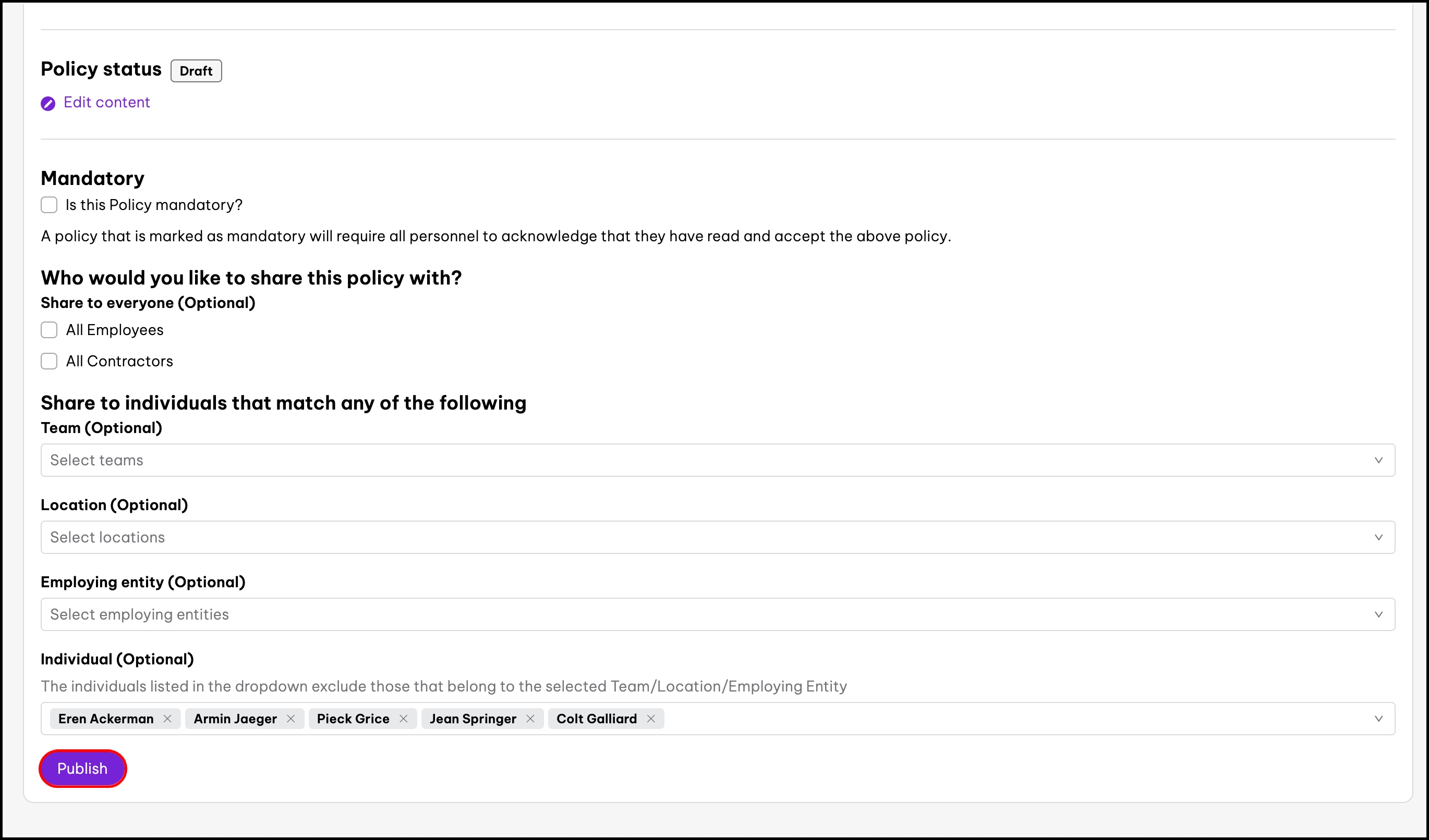 - Click the Is this Policy mandatory? checkbox if all employees must acknowledge this policy.