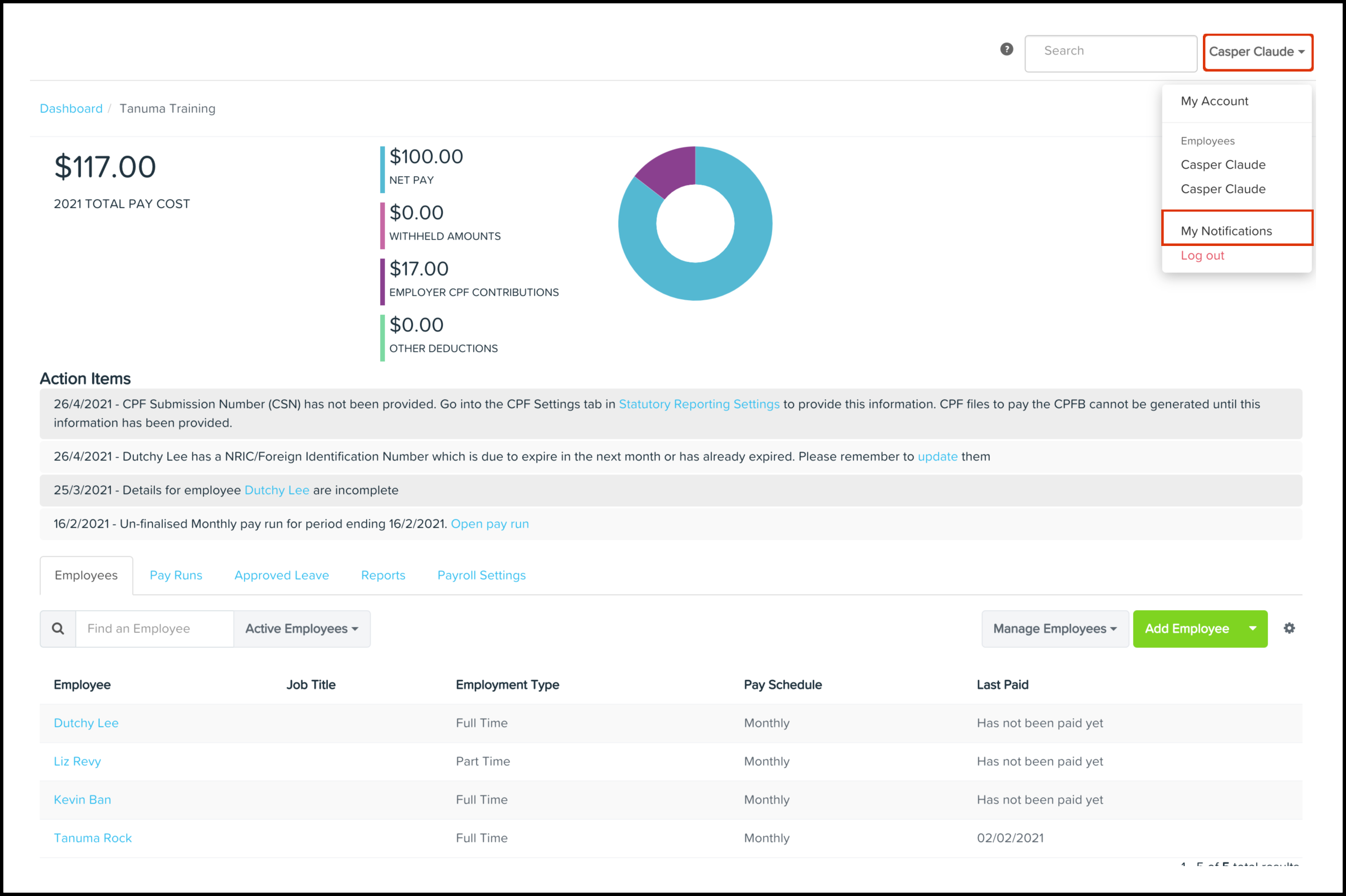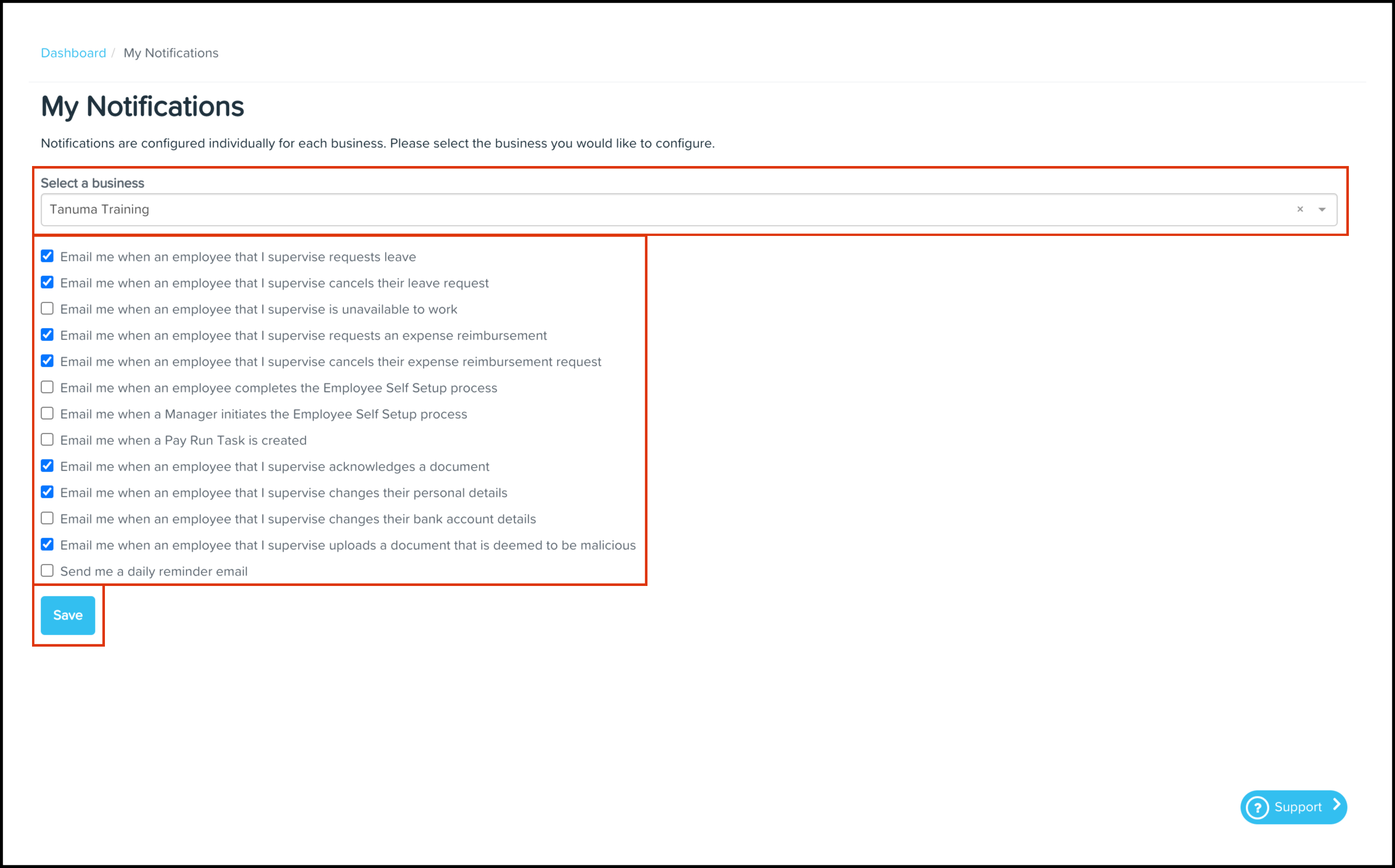 The My Notification feature allows you to turn on or off what email notifications you receive from the payroll platform. These email options cover areas such as expense reimbursements, lodgement errors, pay events and more, giving you control over what messages you receive.