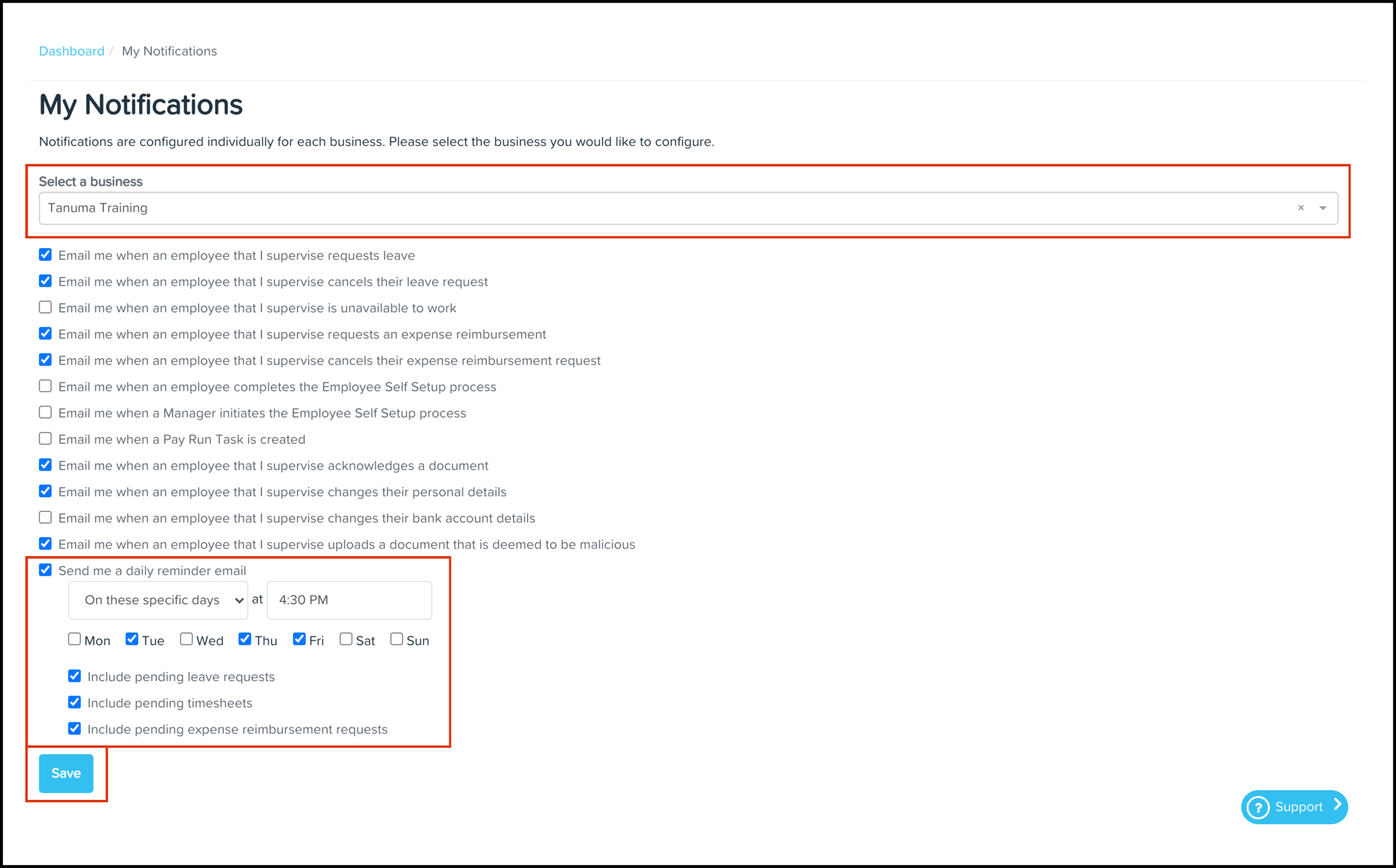 This feature also allows you to create a daily reminder email that will give you an overview of the activities undertaken within your payroll platform. You can select what topics the platform will include in these emails and what day and time you will receive them.