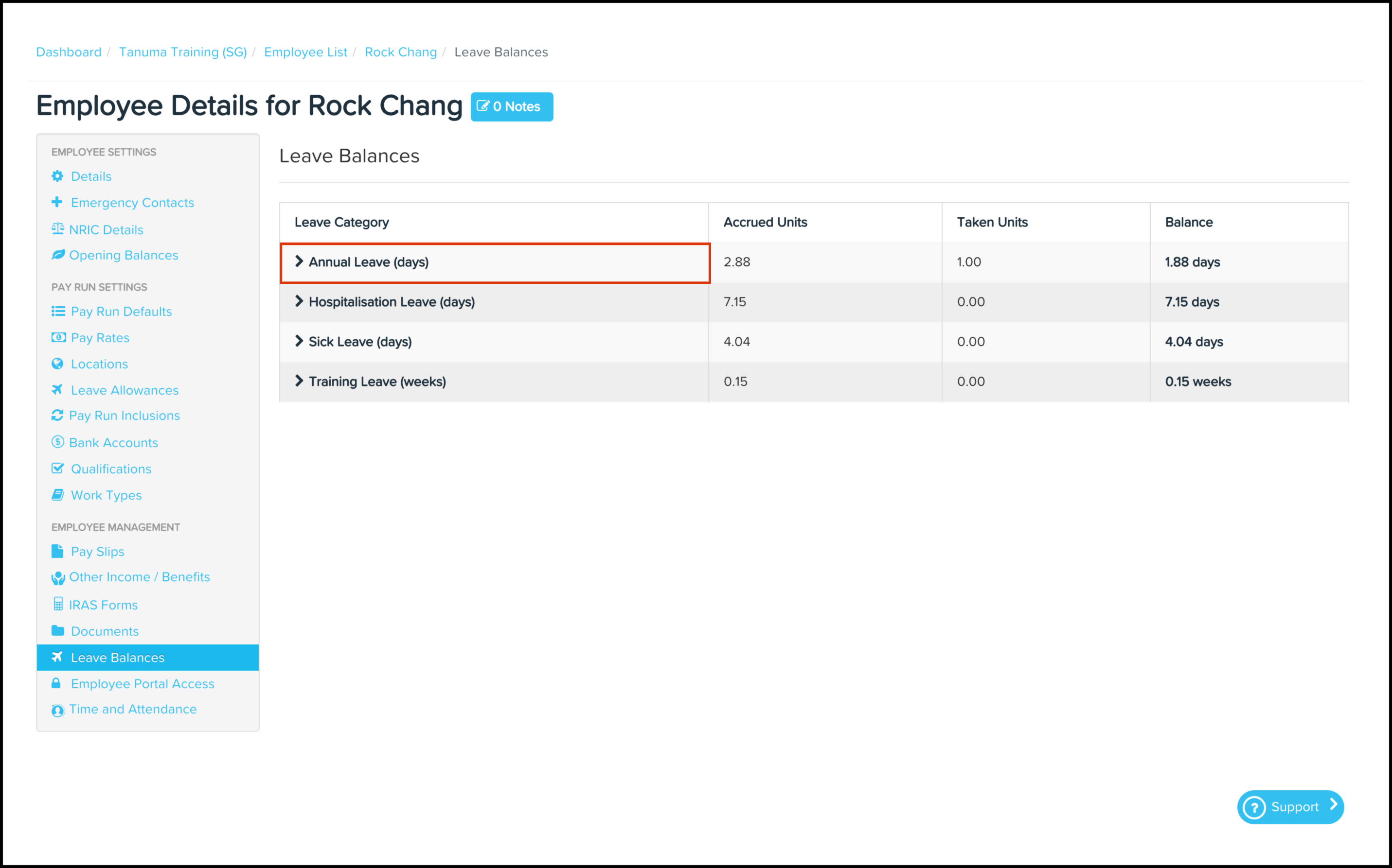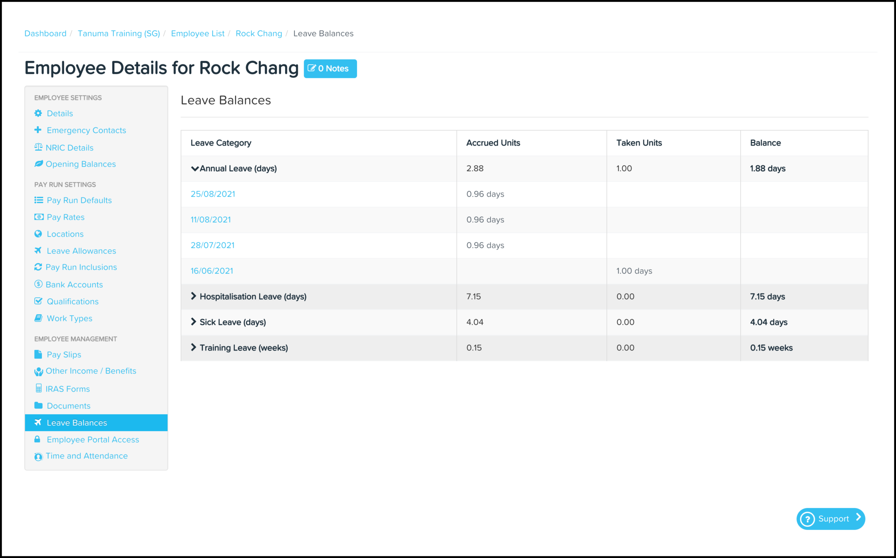 You will now see on your screen the employee's opening leave balance and the pay runs where the employee accrued this leave category.