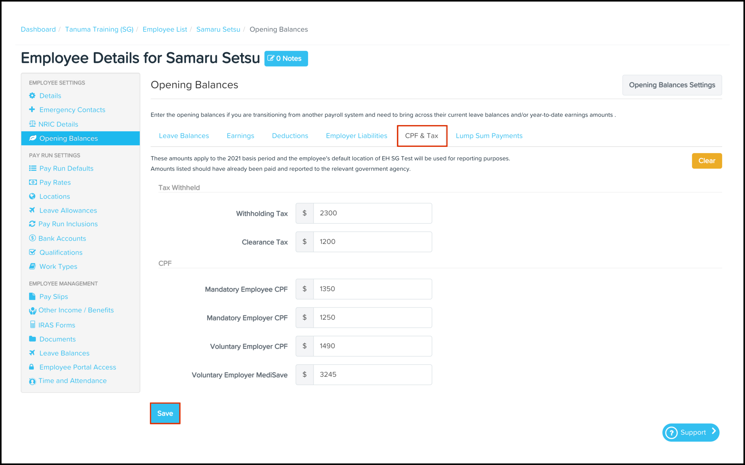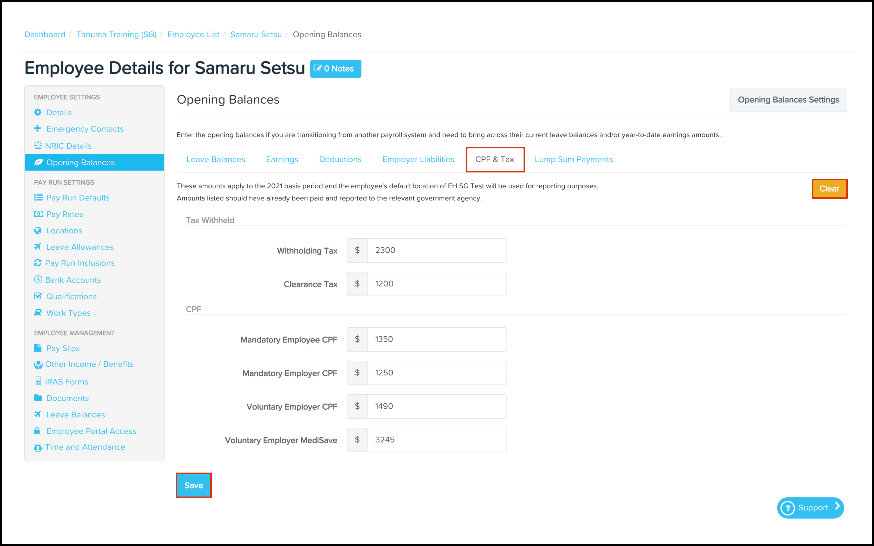 When you move from another payroll provider to Employment Hero's payroll platform, you may have employees who have already paid their CPF and Taxes for the year. The Opening Balances CPF and Tax Opening Balances feature allows you to select an employee's file and enter their accrued YTD CPF and Tax amounts. You can also use this feature to clear the opening balances if you entered the wrong YTD figures into their employee file.