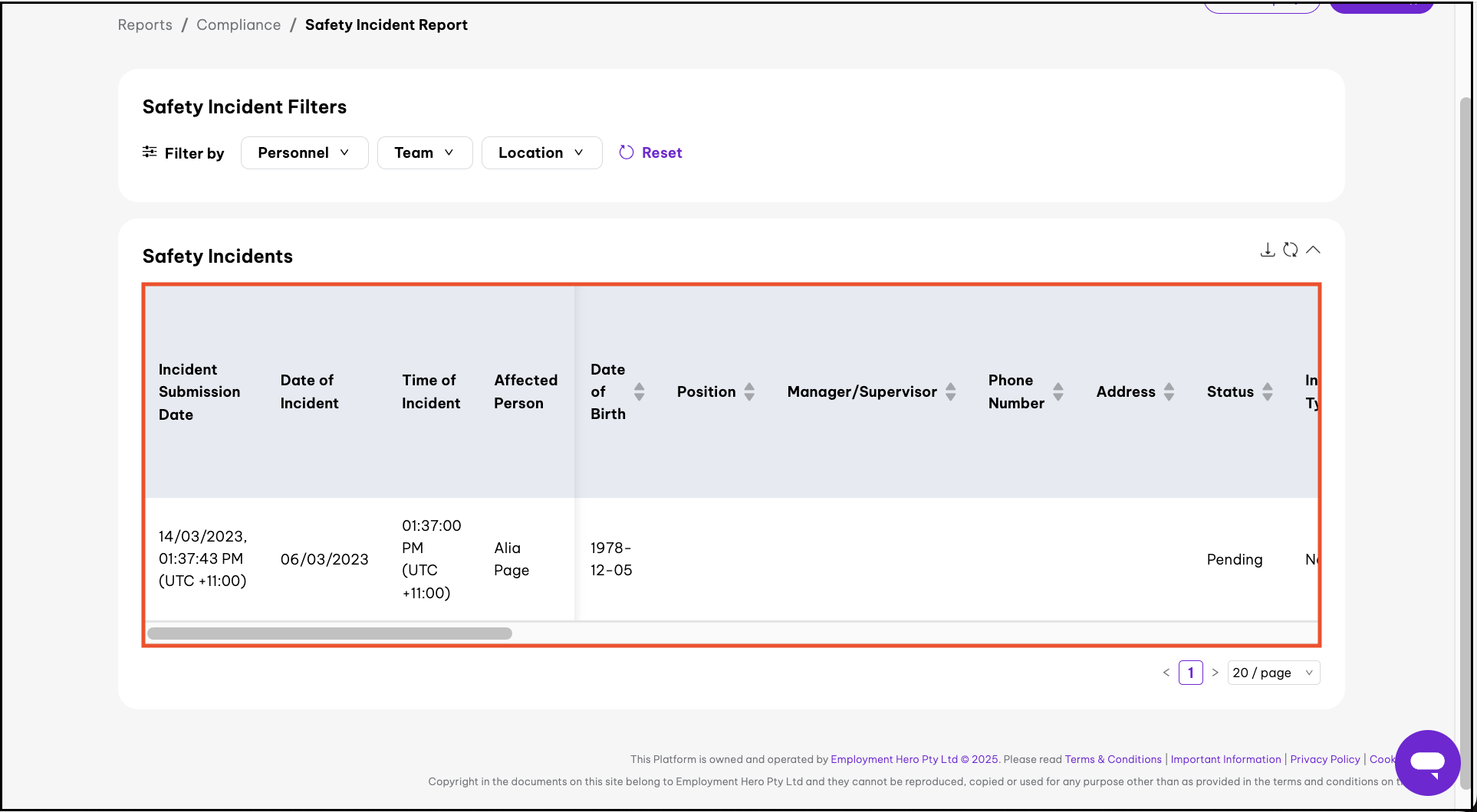 The Employment Hero platform offers the Safety Incident Report, which allows you to view the specifics of safety incidents reported by both employees and contractors in your company. Additionally, you have the option to download a CSV version of the report for viewing when not connected to the internet.