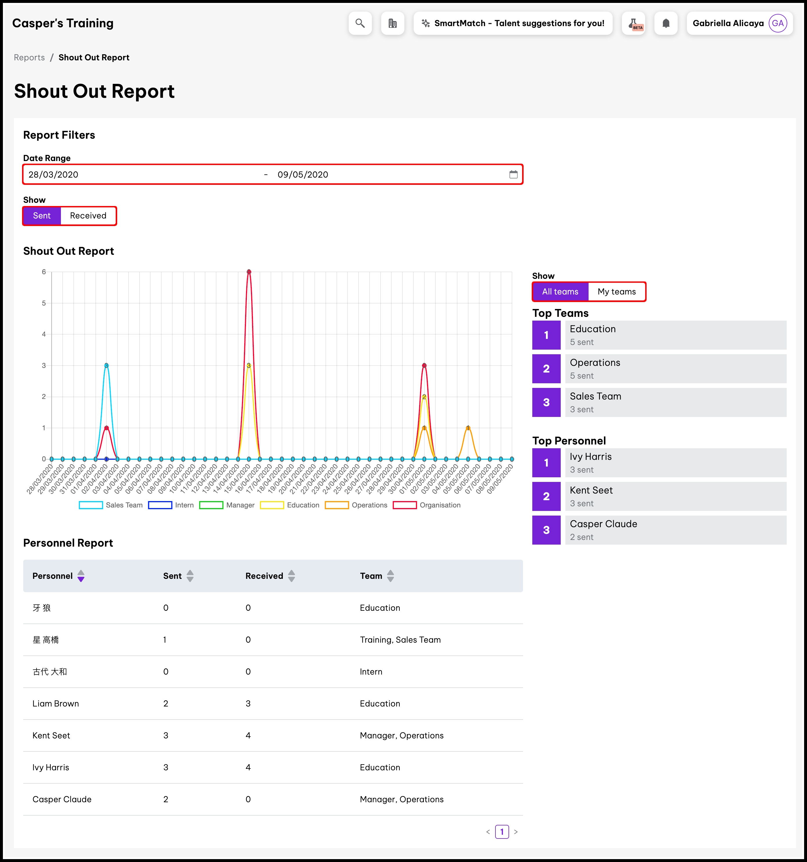 The Shout Out Reporting feature allows you to create a report that you can use to analyse the top teams and employees within your organisation at sending and receiving shout-outs. You can drill this data down based on a customised date range, giving you full insight into the teams and employees who are using the Shout-Out feature within the company feed.