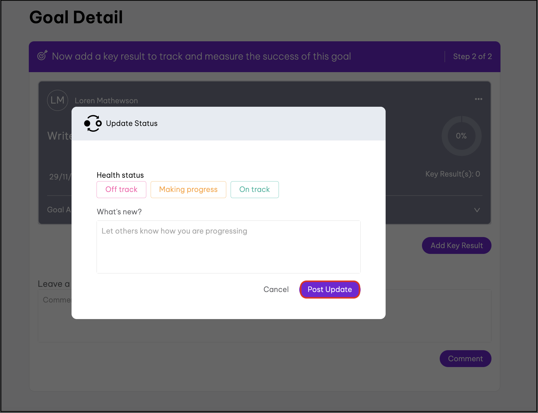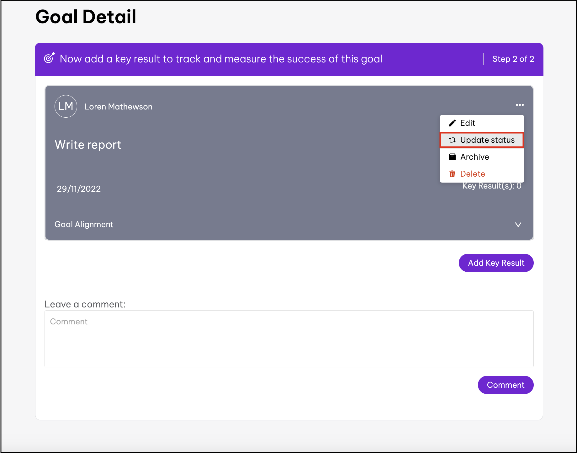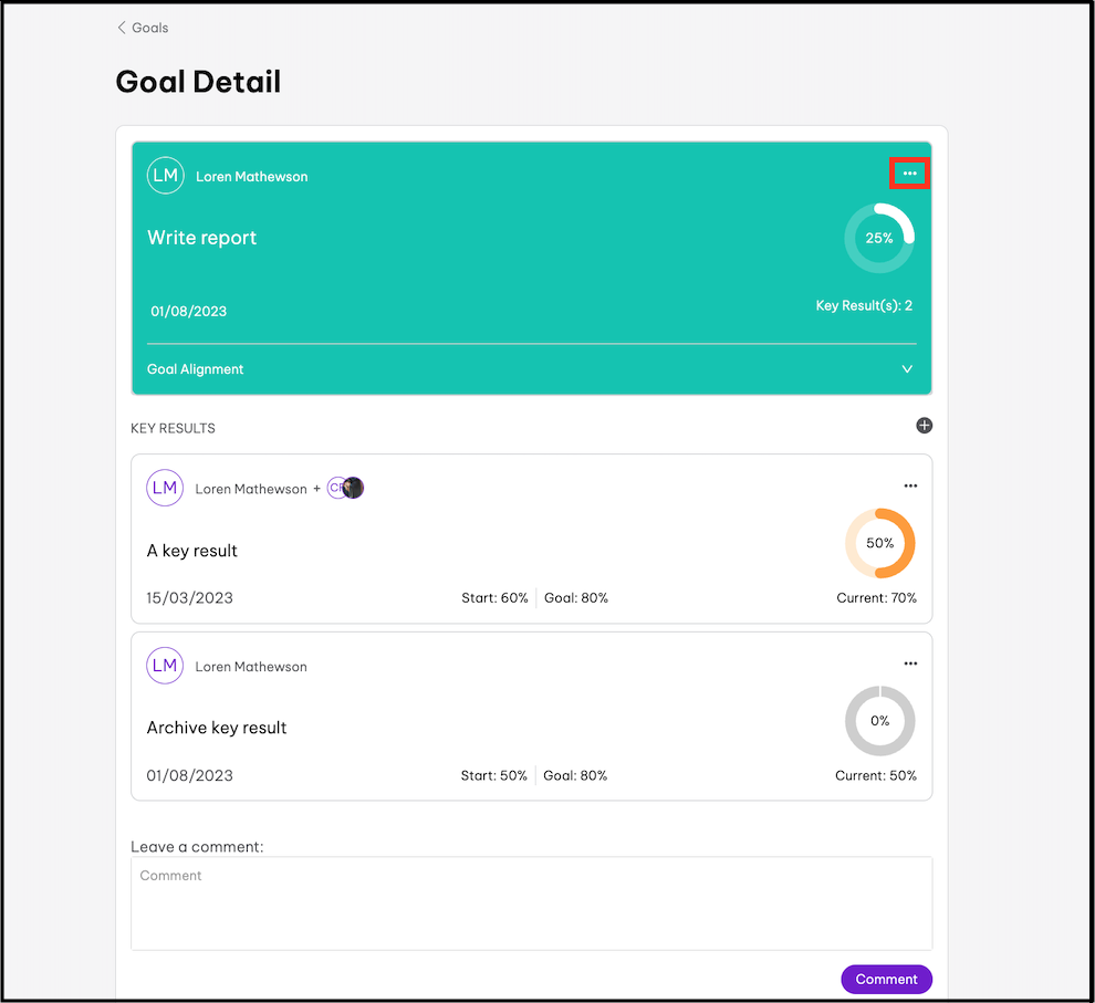 - Click the goal that needs a comment added.