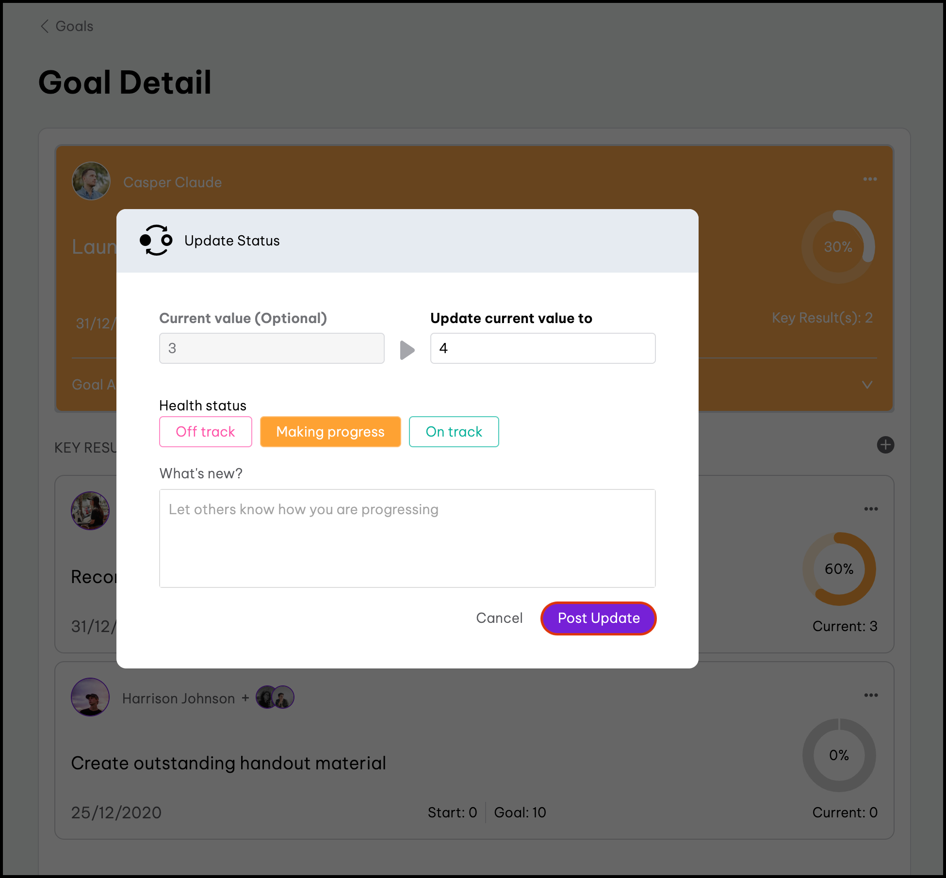 | Participants | Goal owner, key result owner, key result collaborators and their relevant managers (primary, secondary and indirect). |