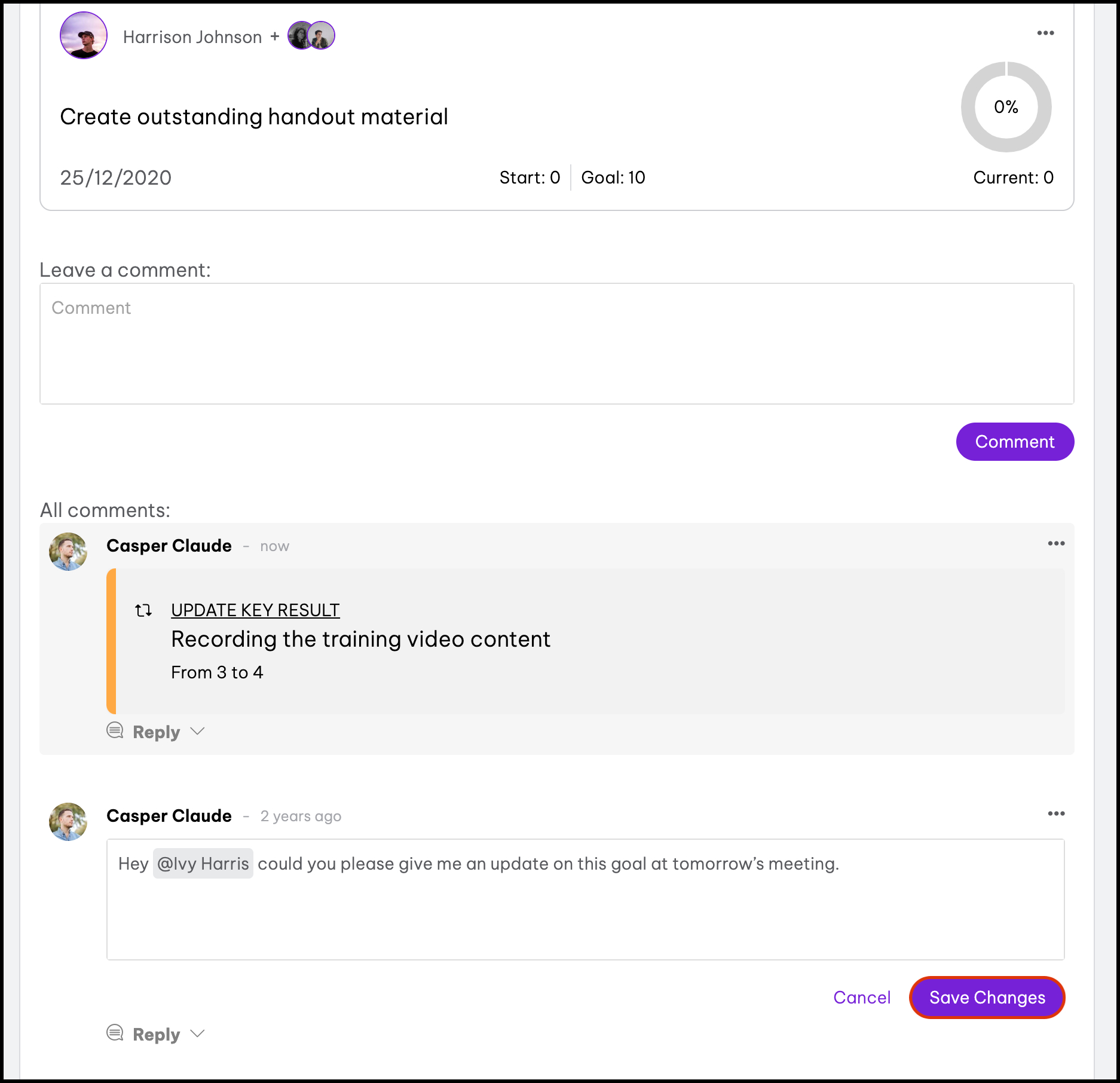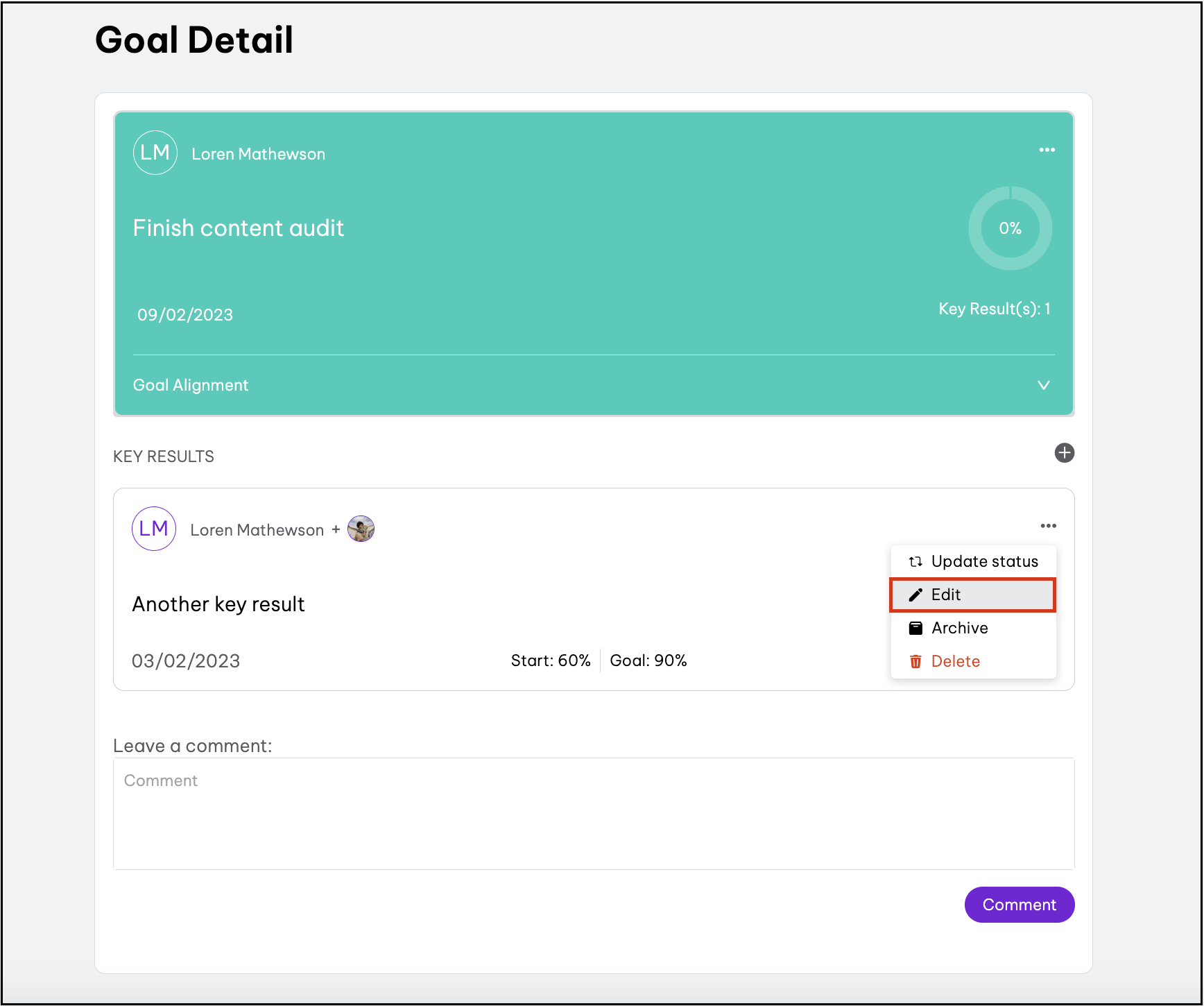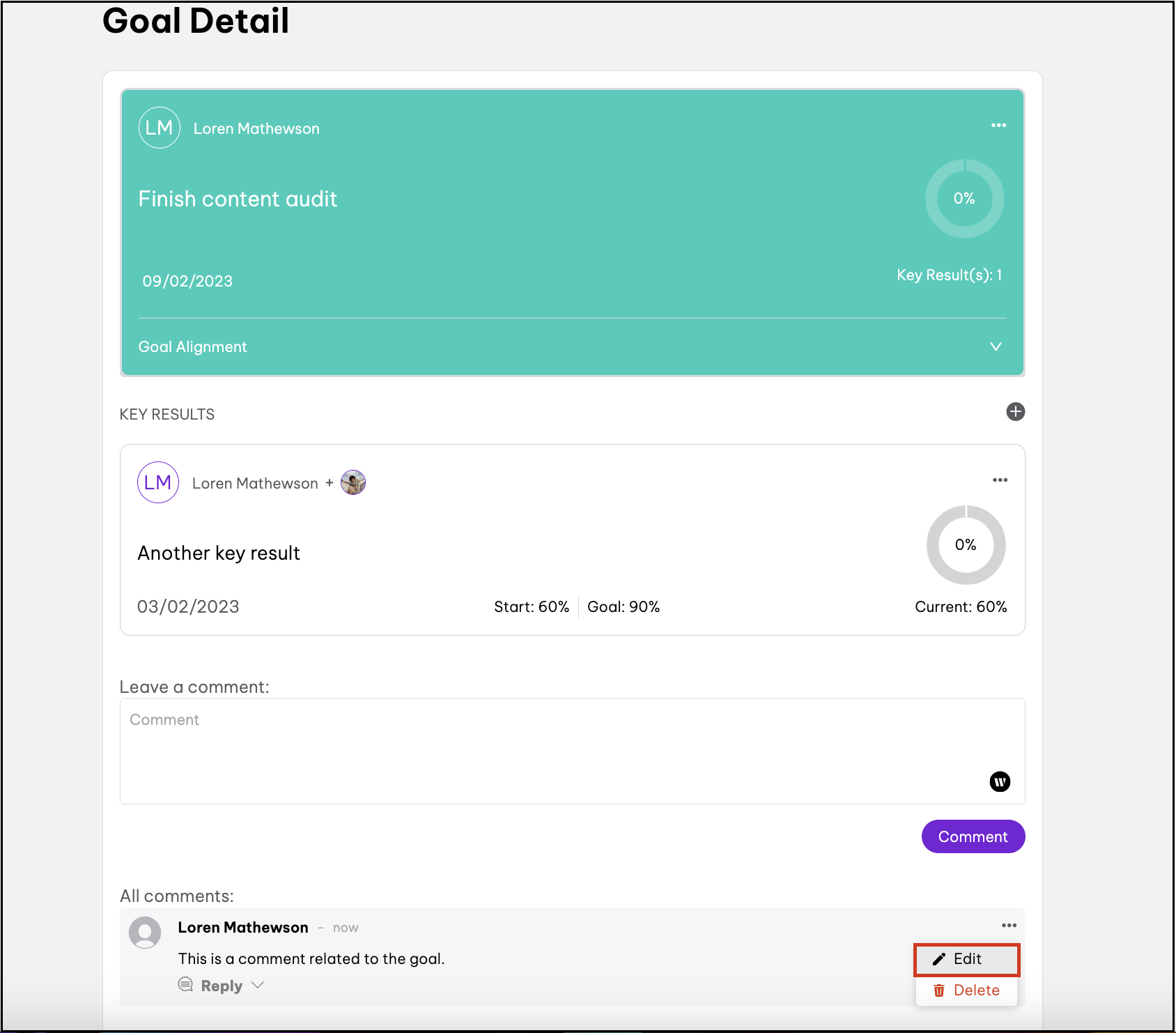 - Click the goal that needs a comment edited.