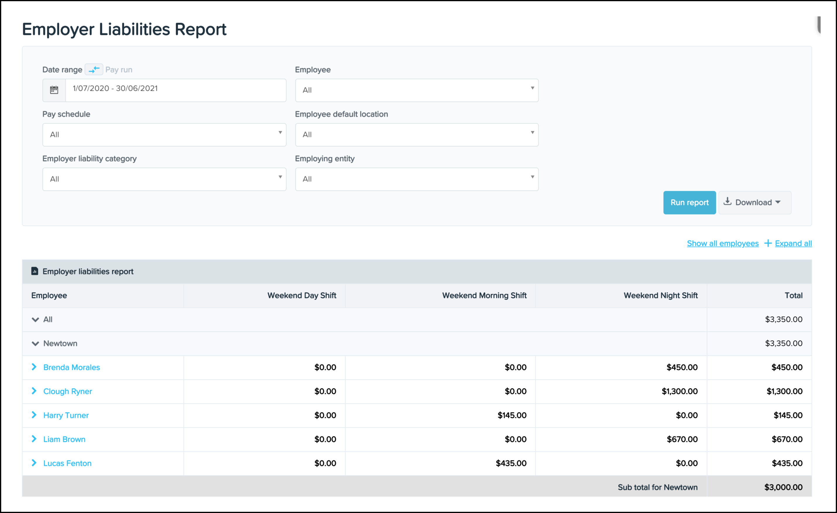 Showing the Employer Liabilities Report with data filtered and displaying results