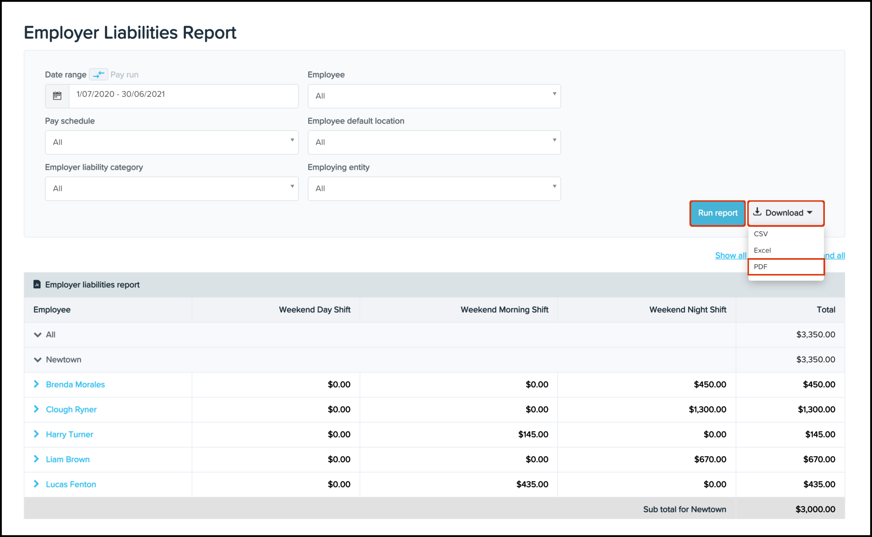 Showing the Employer Liabilities Report with the Download as a PDF button highlighted