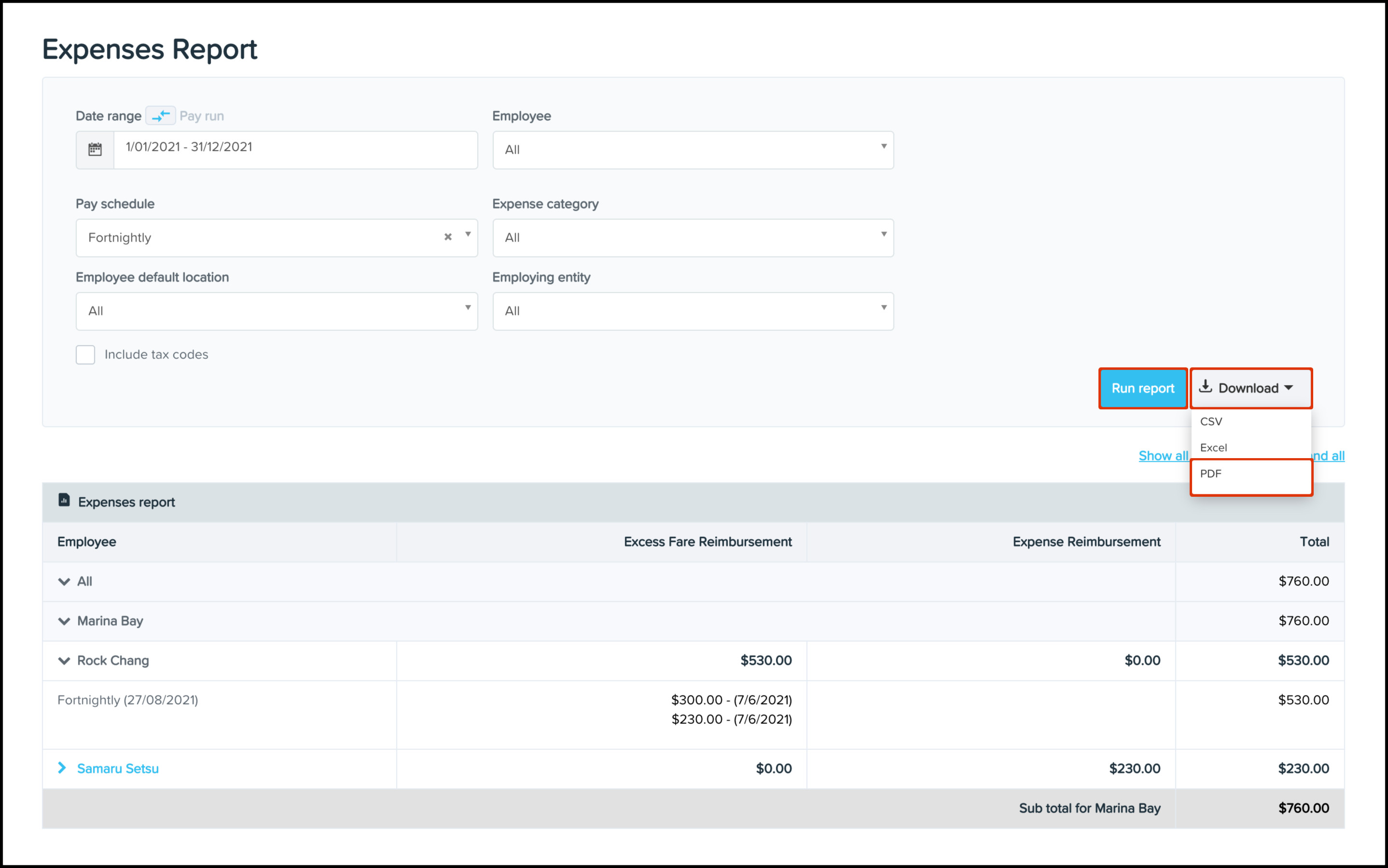 The Claim Reimbursement Reporting feature allows you to create a report that you can use to analyse employee claims processed in a Pay Run within your business. It includes the ability to narrow down the data by employing entity, claim category, and pay schedule. You can also use this feature to download an Excel file of the data and save the information in a printable PDF format.