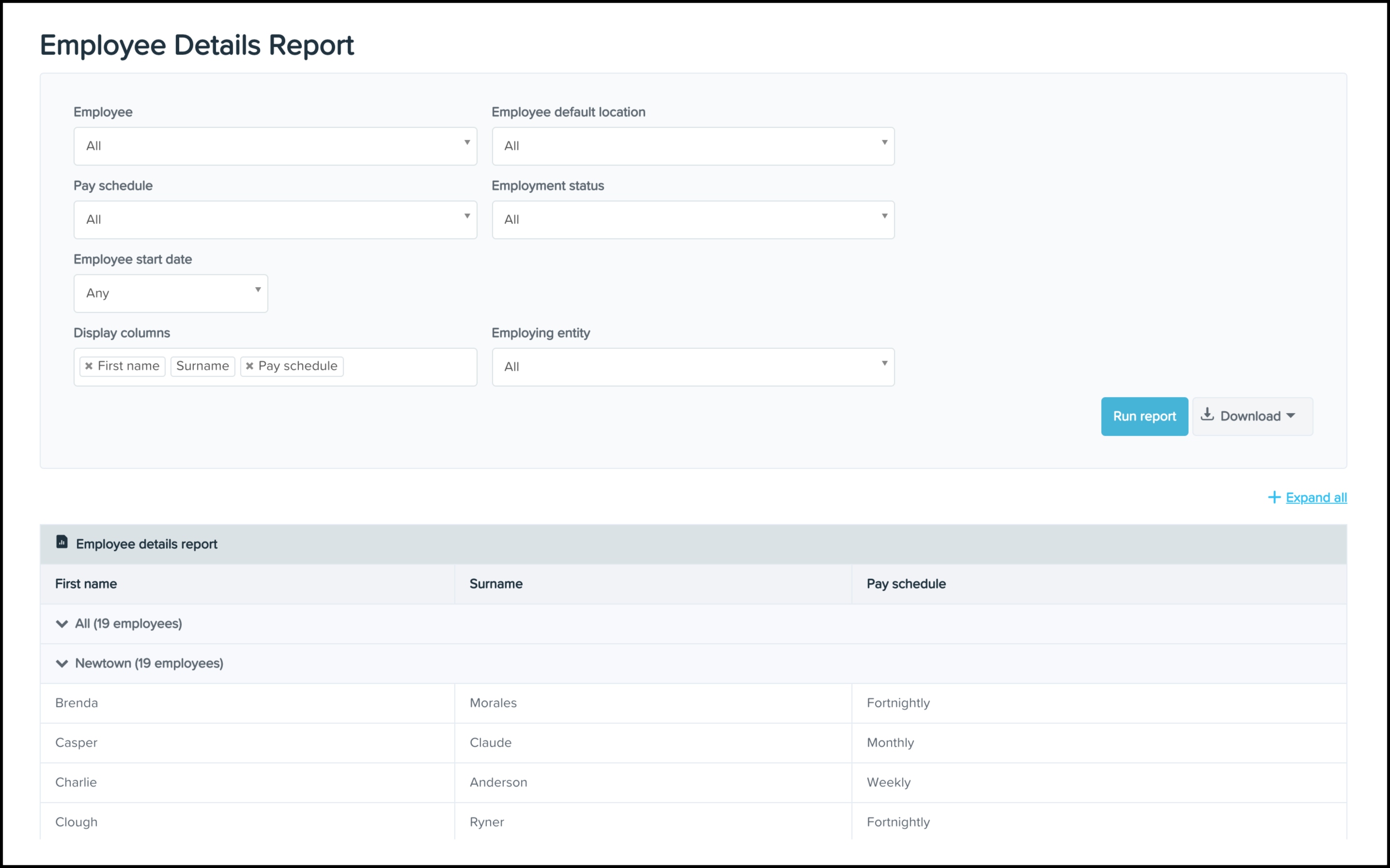 You can use the Employee Details Reporting feature to construct a report on the pay schedules assigned to your employees within your payroll platform.
