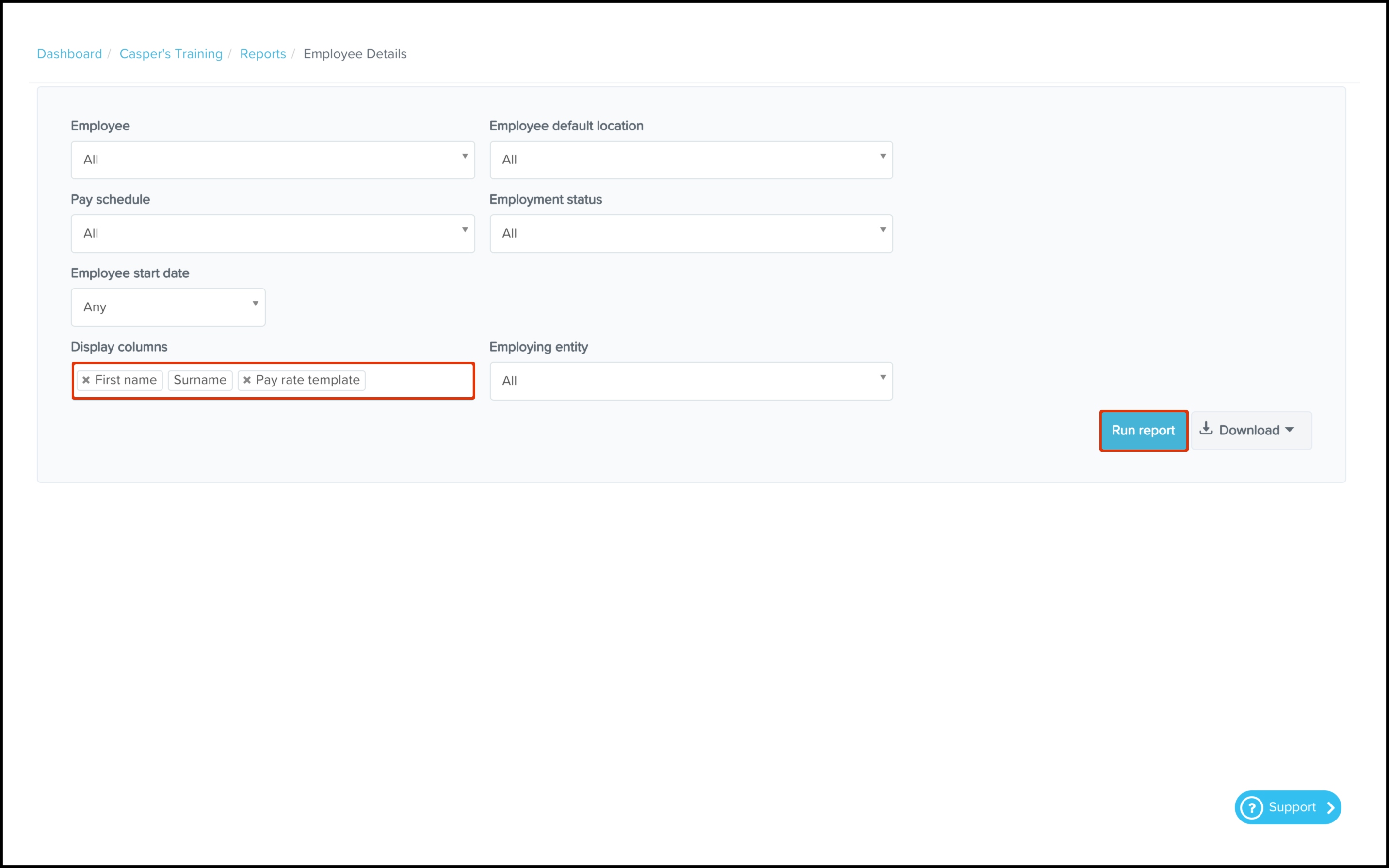 You can use the Employee Details Reporting feature to construct a report on the pay rate templates assigned to your employees within your payroll platform.