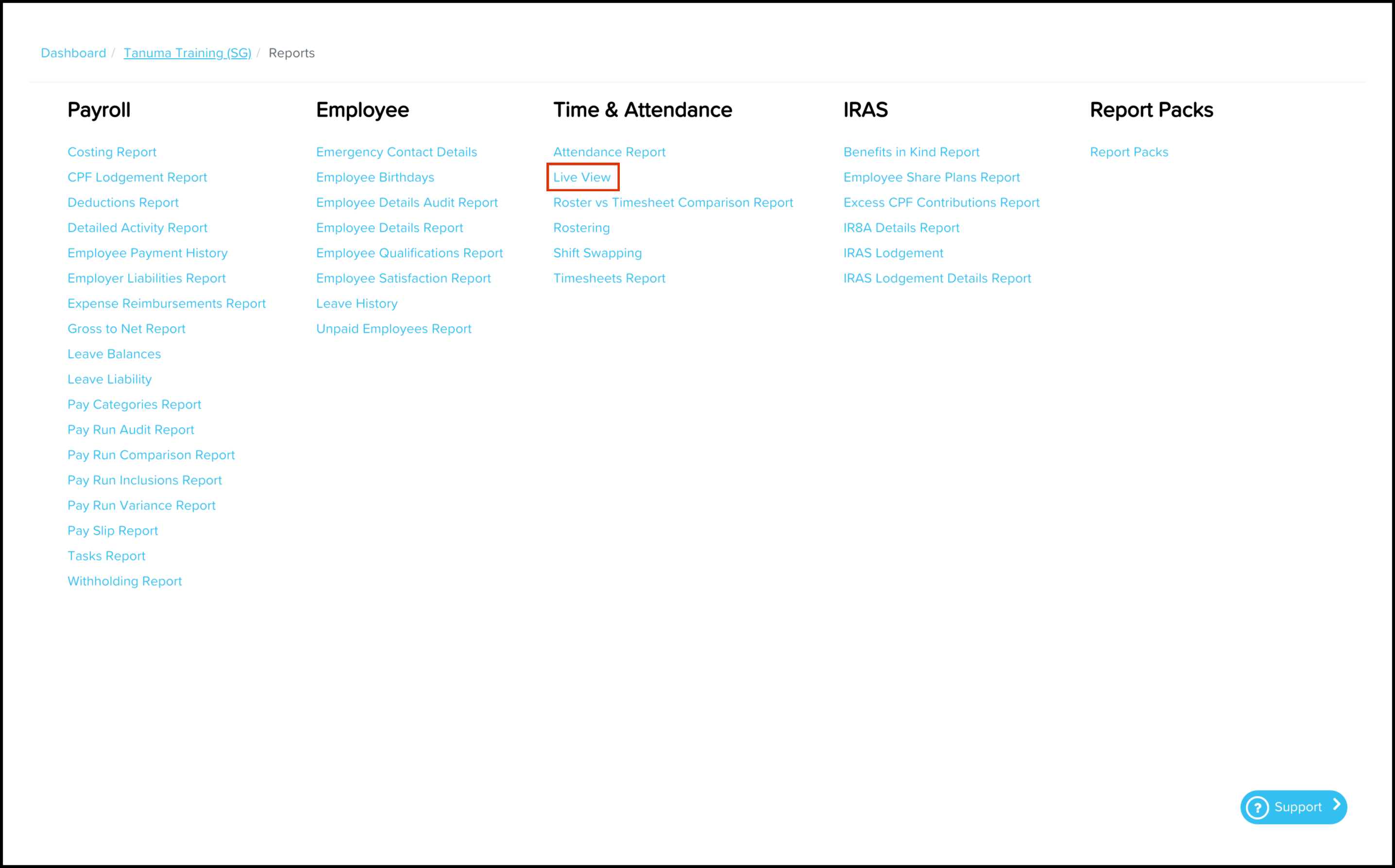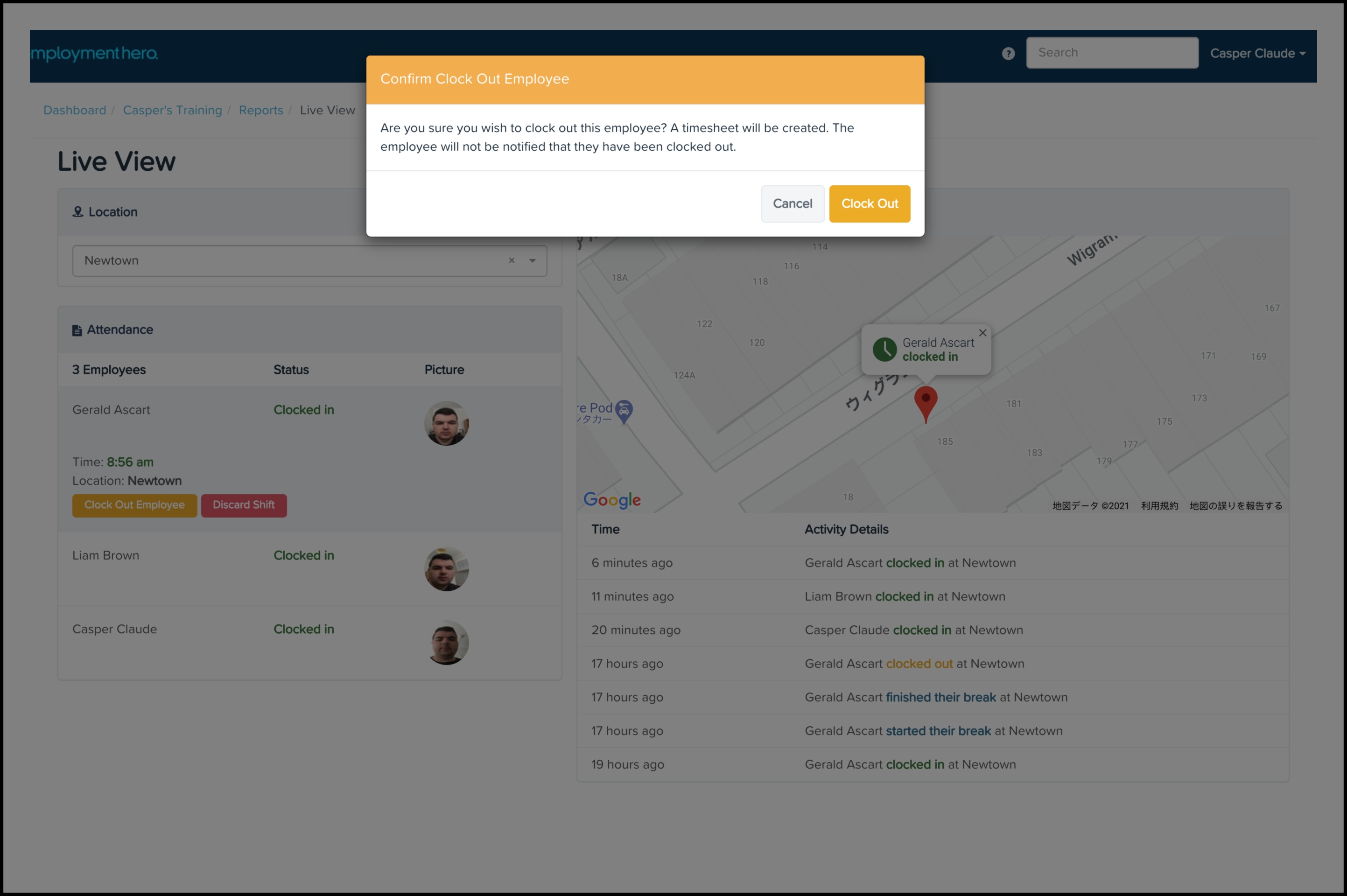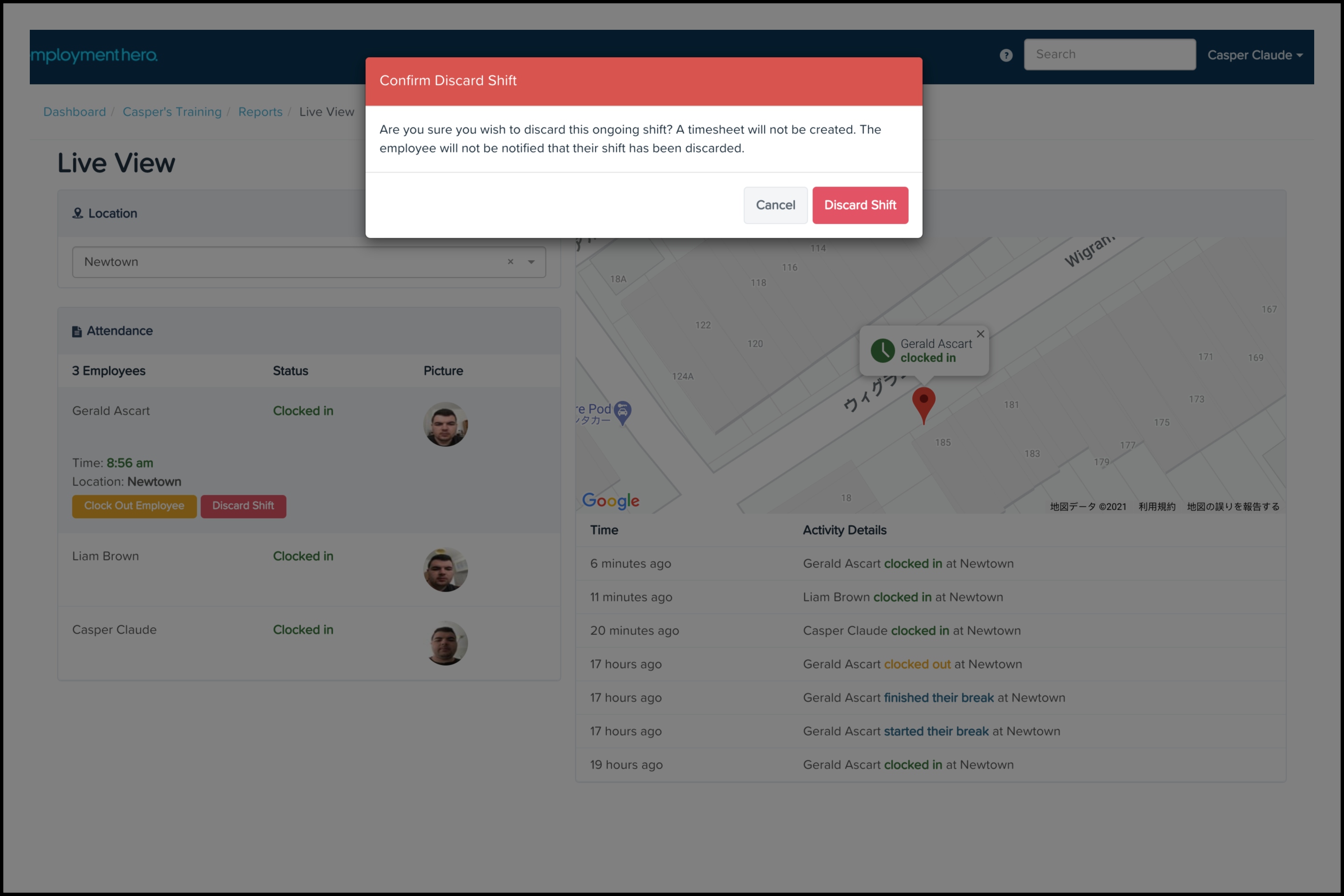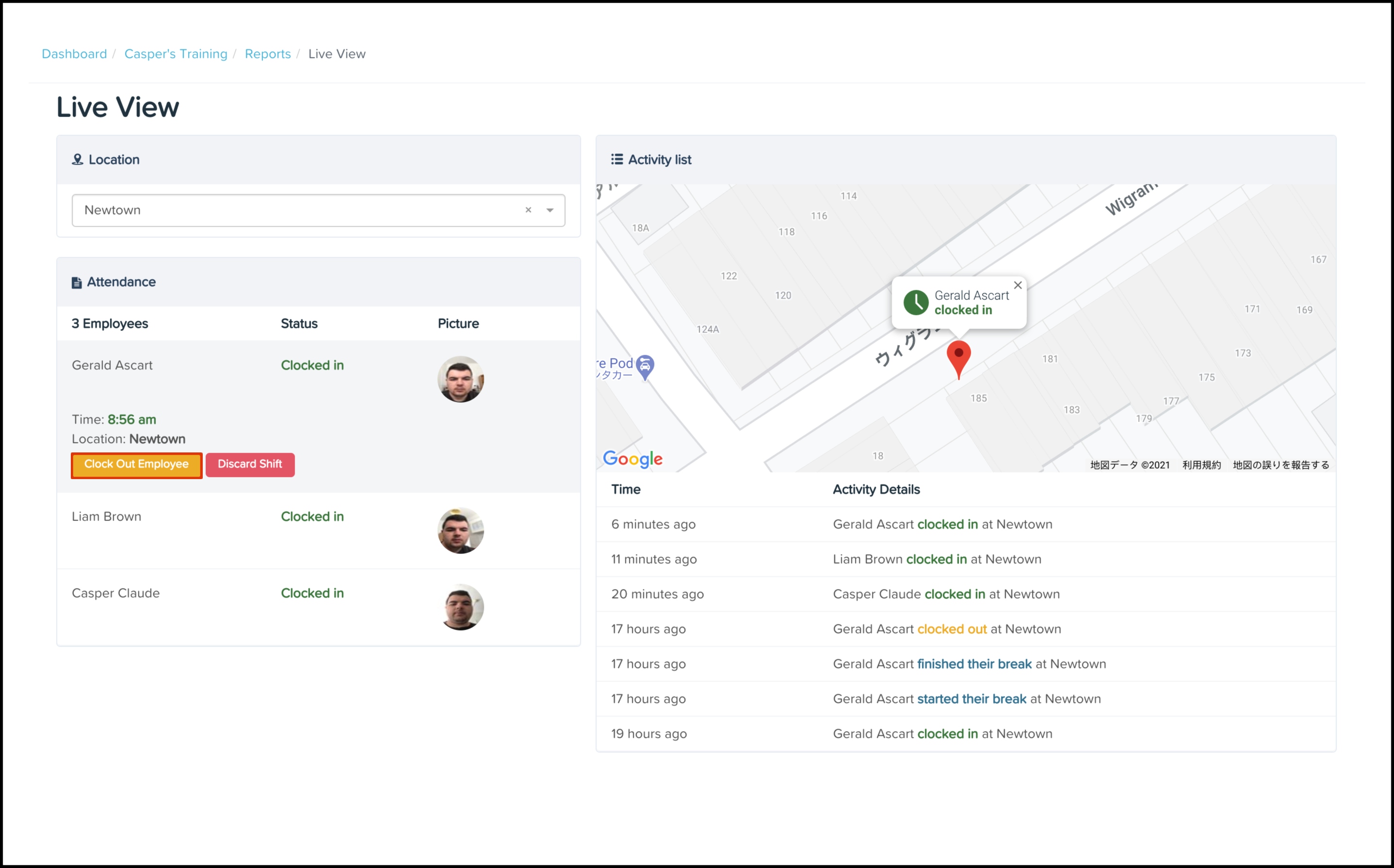 The Live View report displays real-time clock-in activity generated via Clock Me In (CMI) and Employment Hero Work (to view the CMI app, visit the App Store). You can see the status of an employee's clocking activity, i.e. are they clocked in on a break, back from break or clocked out and a map location of all clocking activities. You can also see the work location and type chosen by an employee and any photos taken by an employee when they clock in.