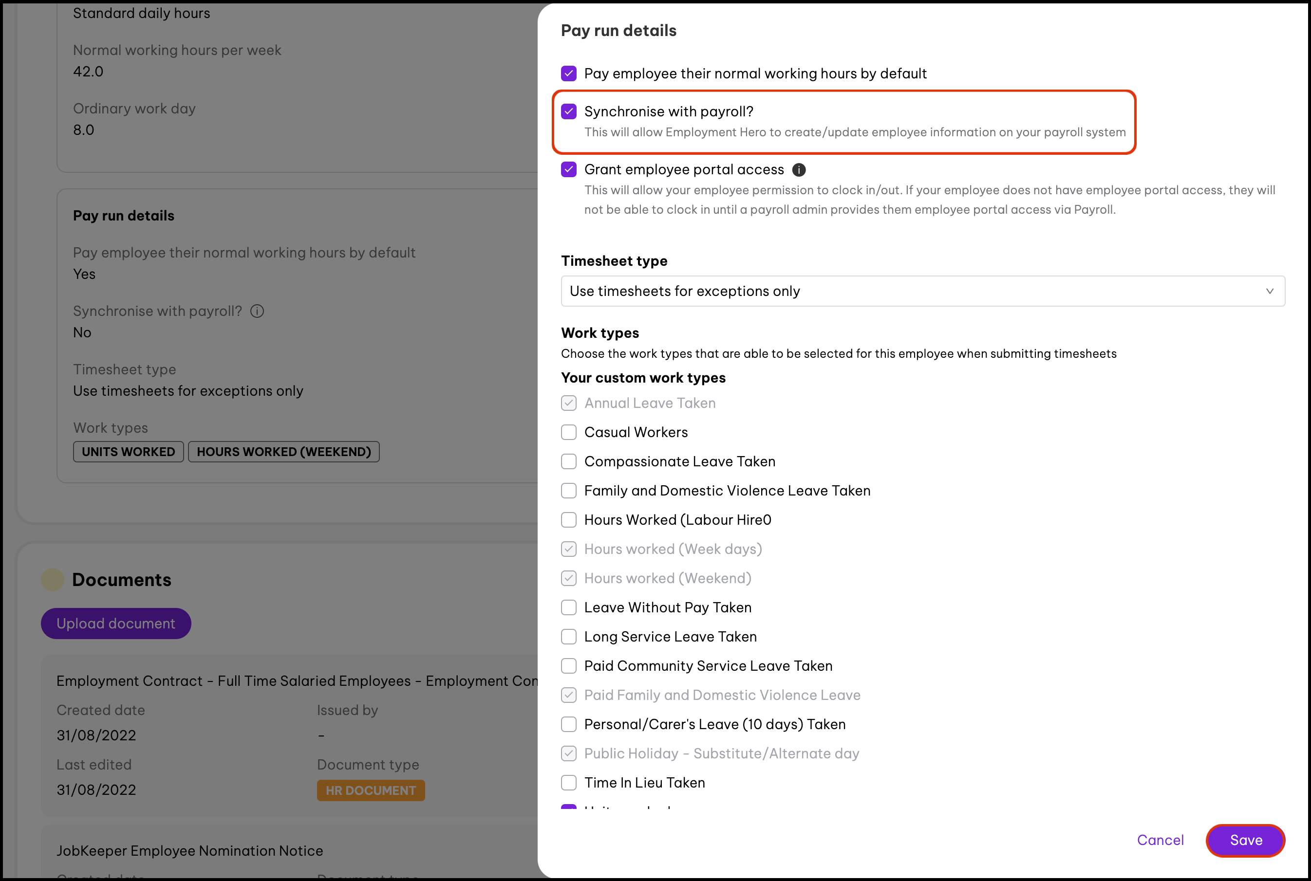 If the automatic conditions are met and the employee still cannot access their pay slip, verify that there is an active connection to your chosen payroll platform. You can check this connection through their employee file under the Pay Run Details tab. The steps to do this are: