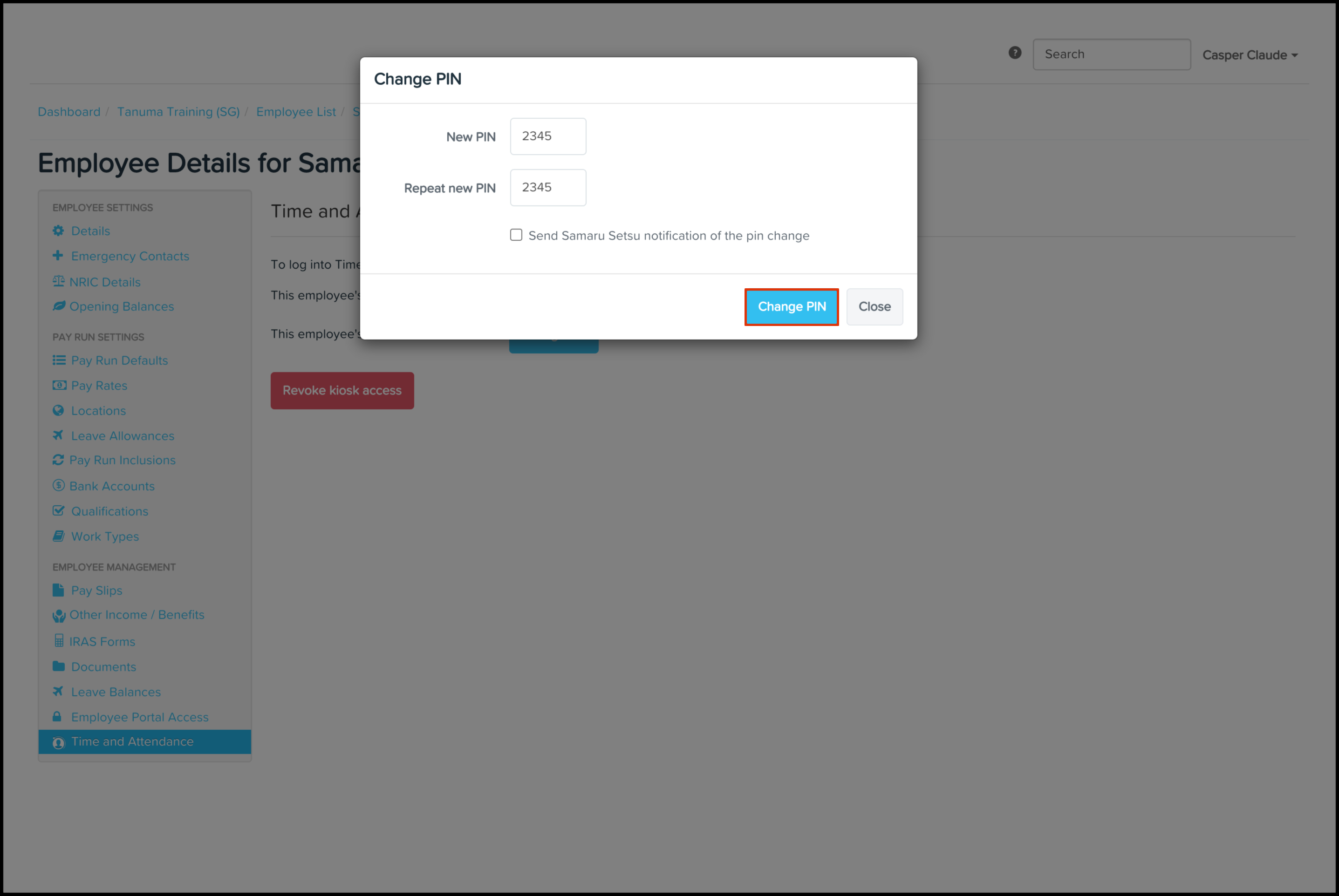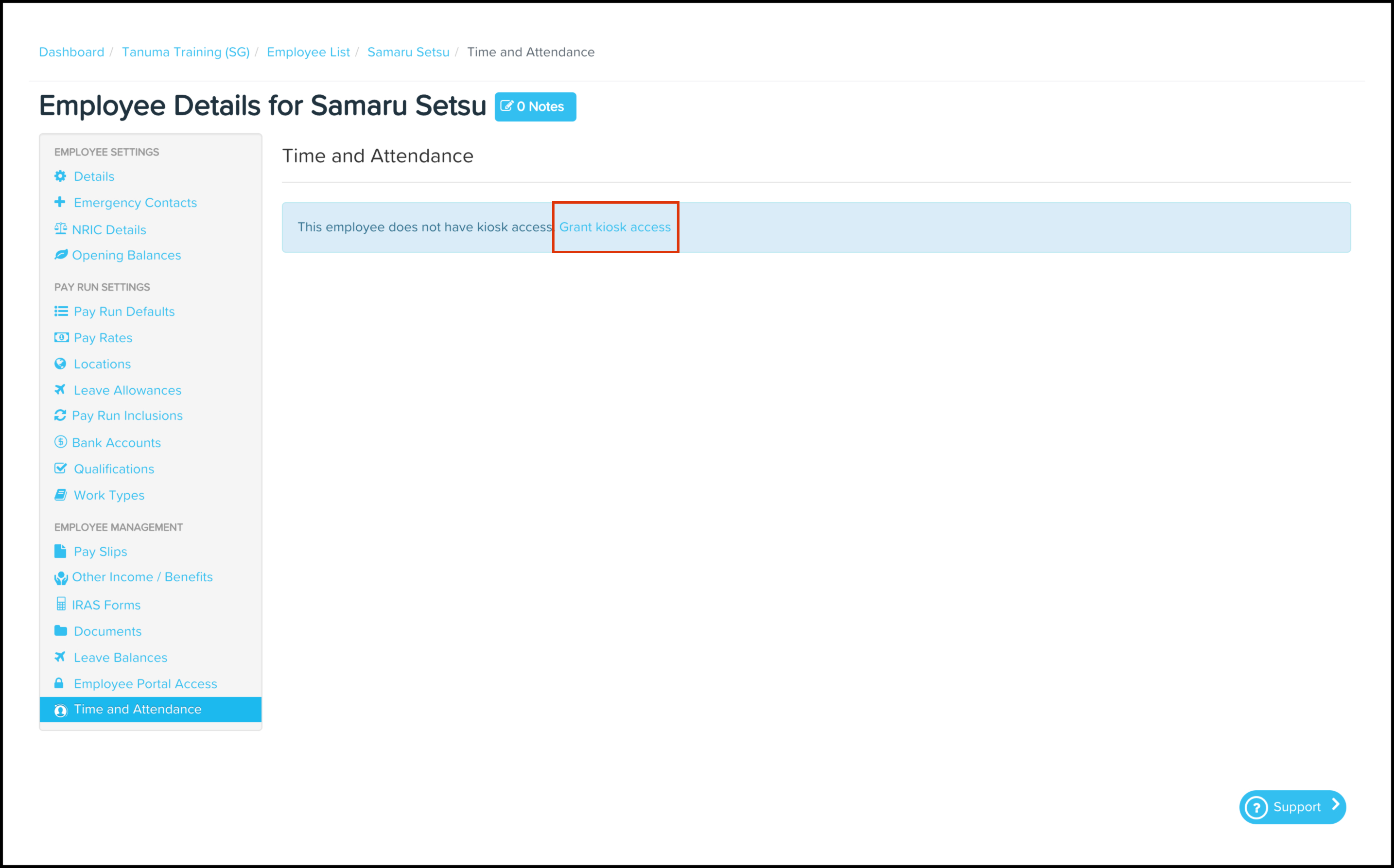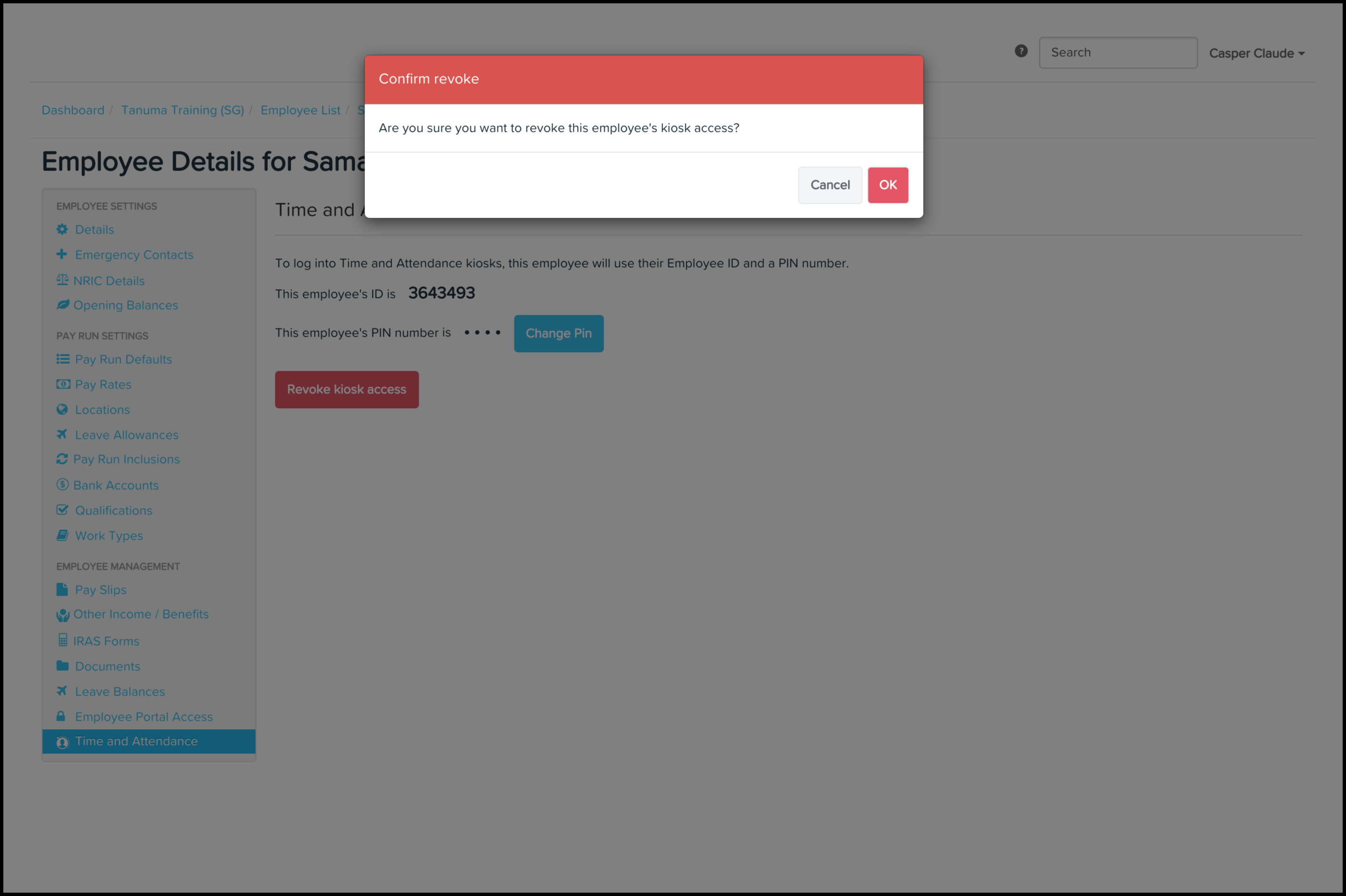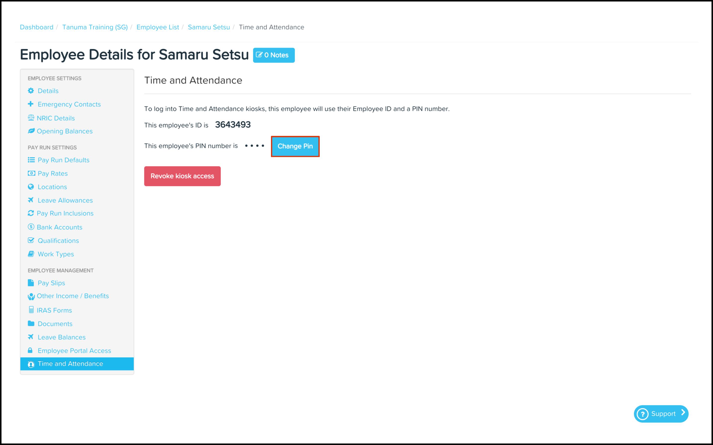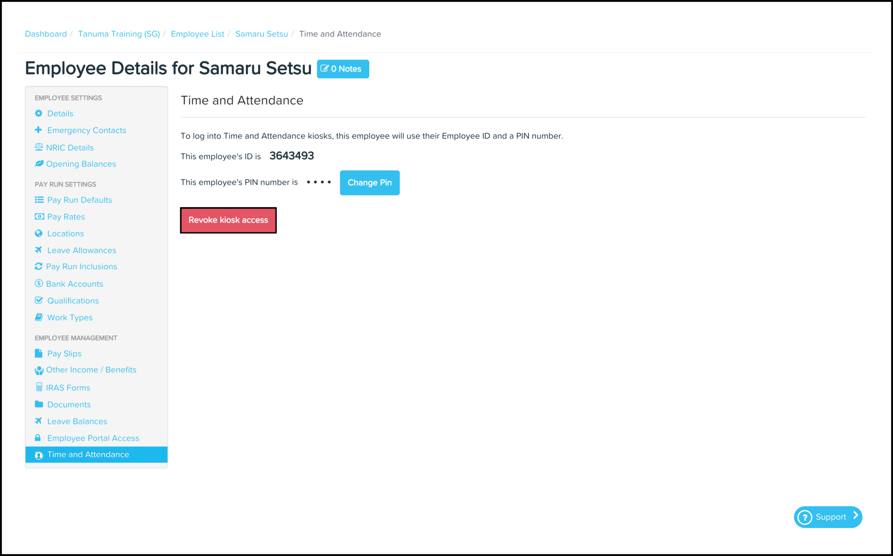 The Employee Time and Attendance Access feature allows you to grant access to a specific employee with the ability to use the Clock Me In app (downloadable for iPad users on Apple's App Store). You can also use this feature to change an employee's assigned kiosk access pin if they have forgotten their original code and revoke access if the employee does not need to use this app anymore.