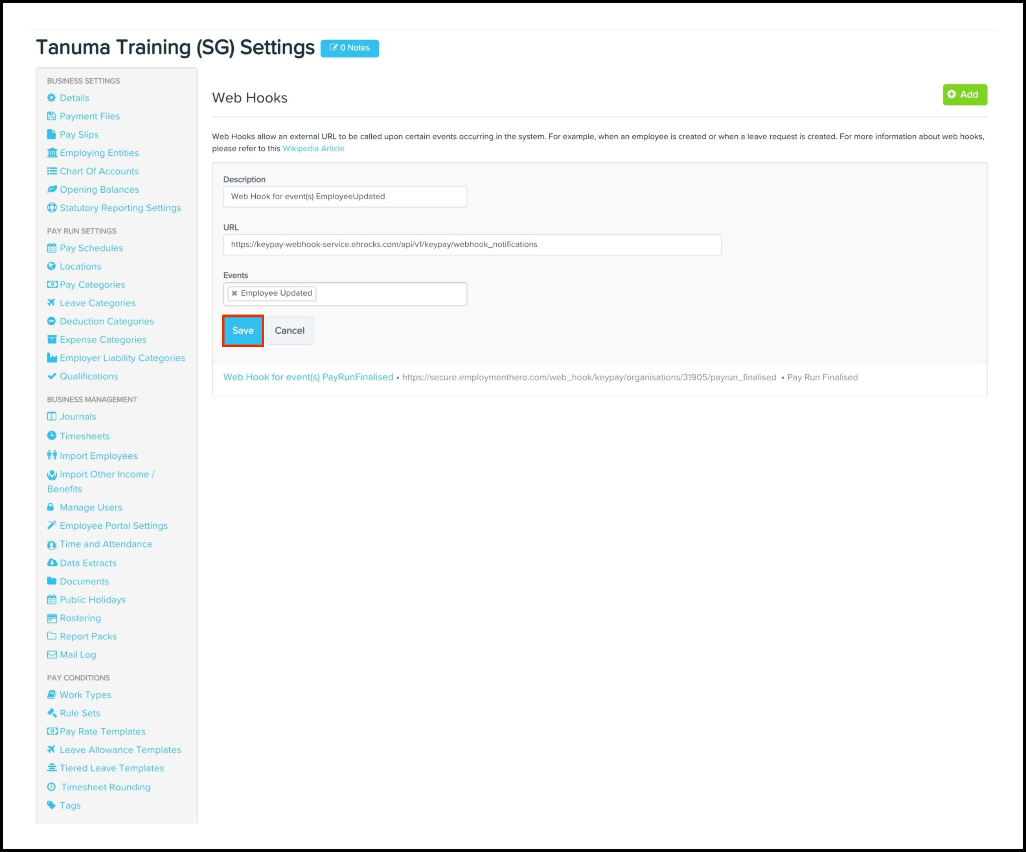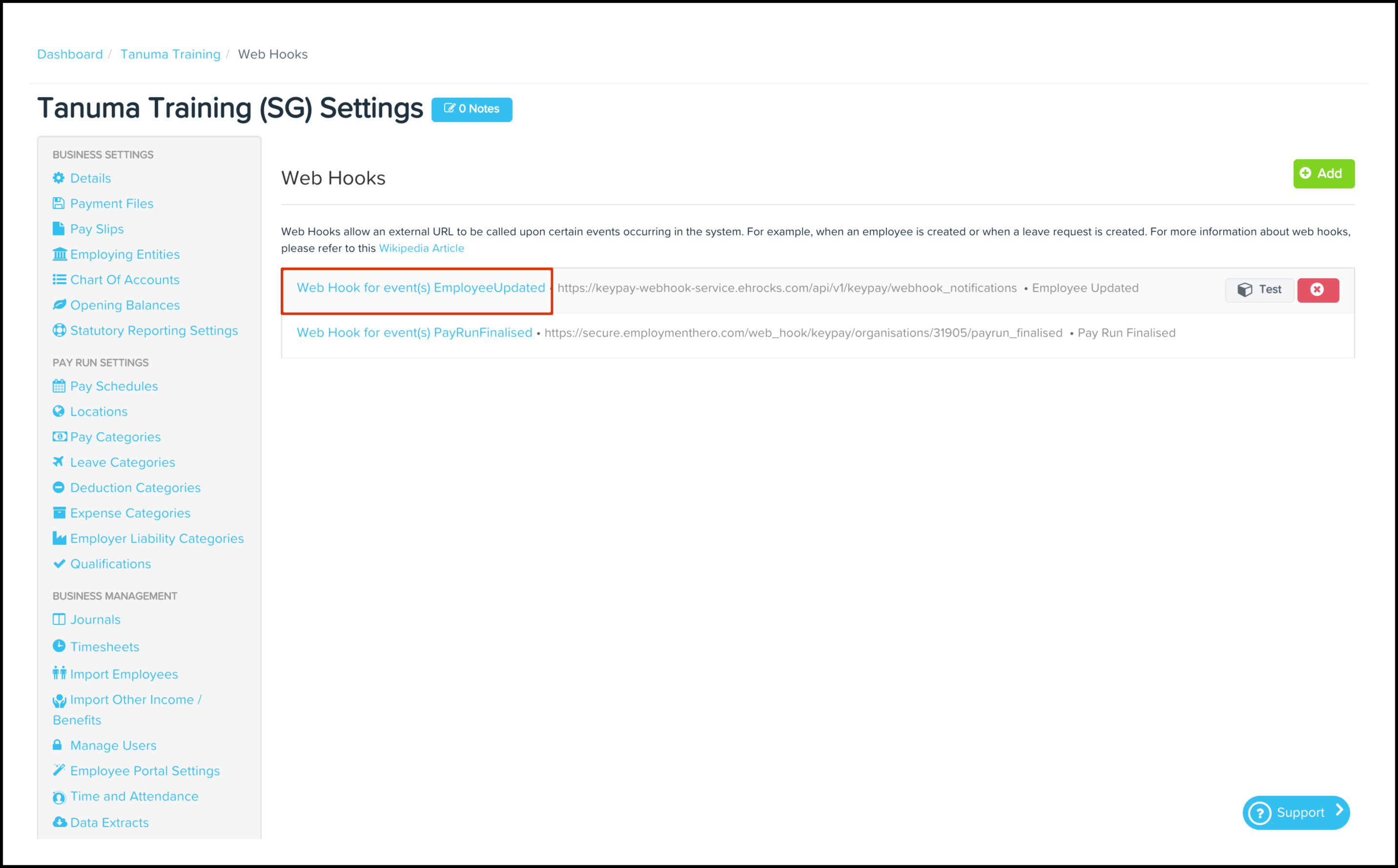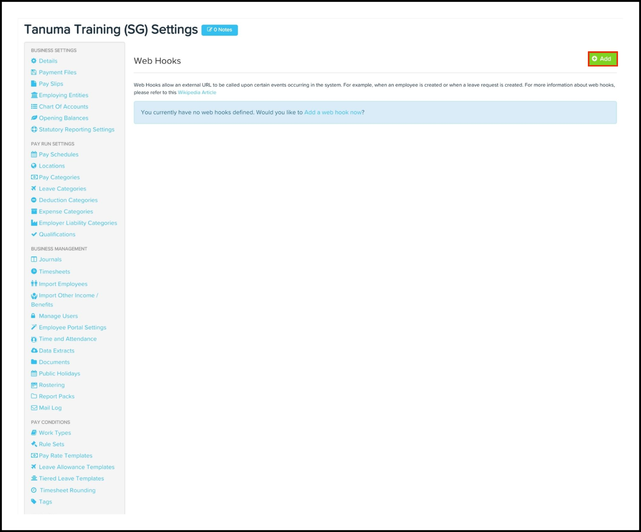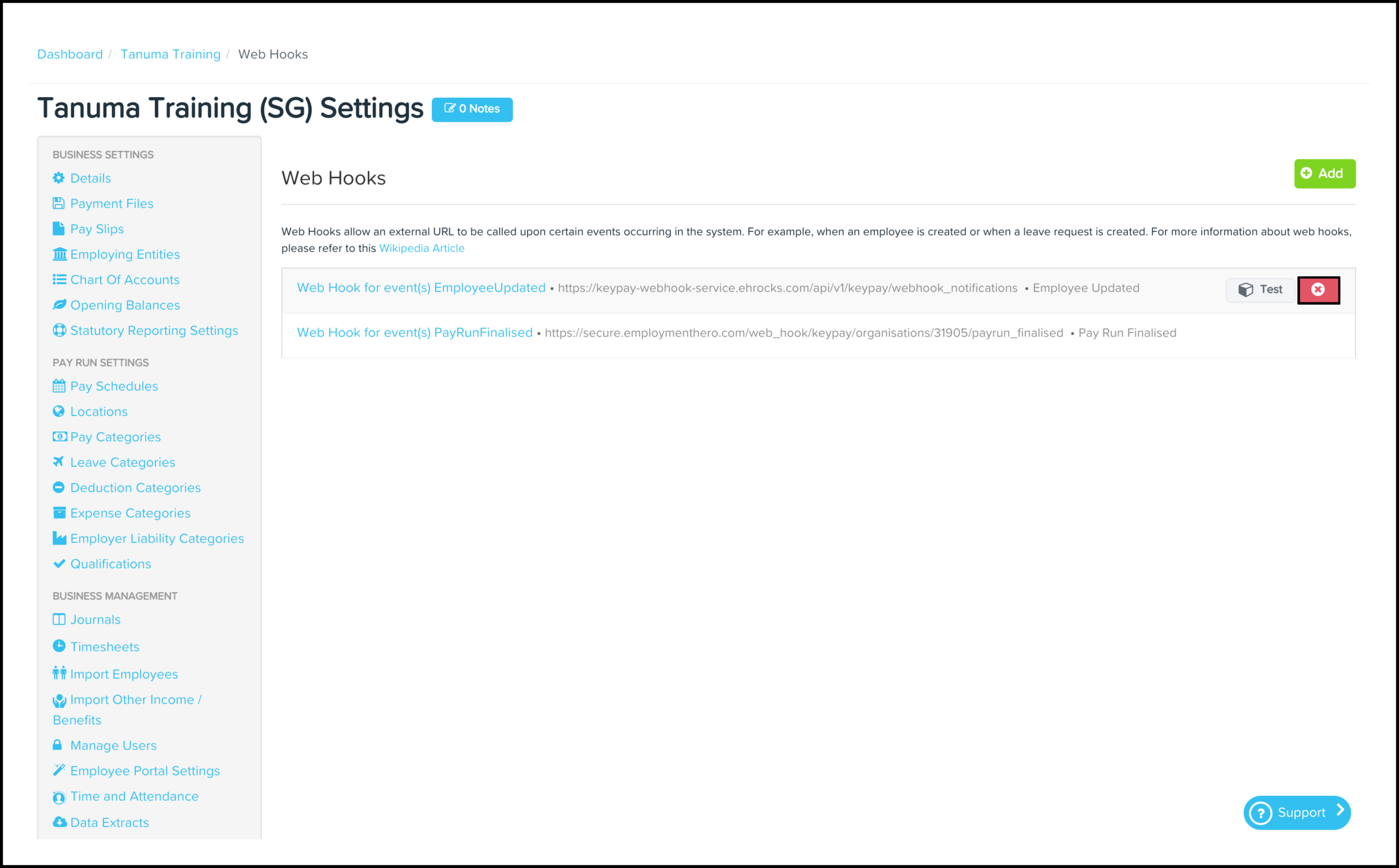 You can use the Payroll Webhooks feature to add a new Webhook to your organisation's payroll platform and then test this data source out to make sure it works as intended. You can also use this feature to edit any information if it changes and delete a record if it is no longer required.
