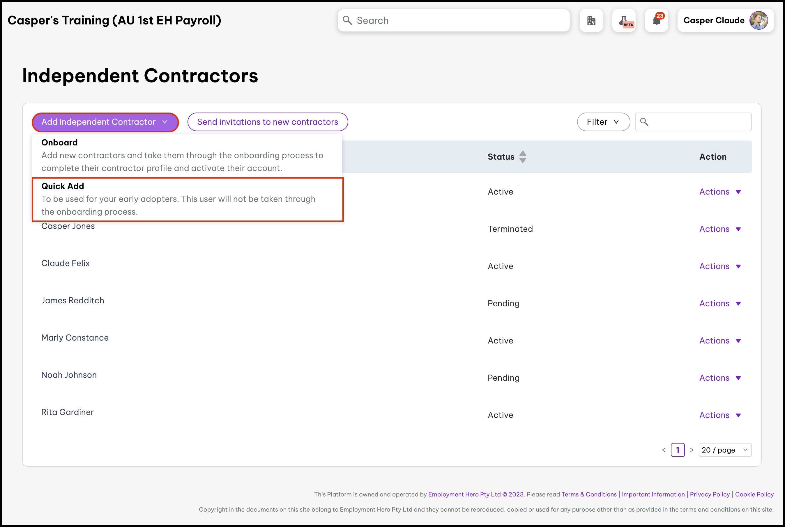 The Quick Add feature allows you to quickly add a new contractor to your Employment Hero Platform.
