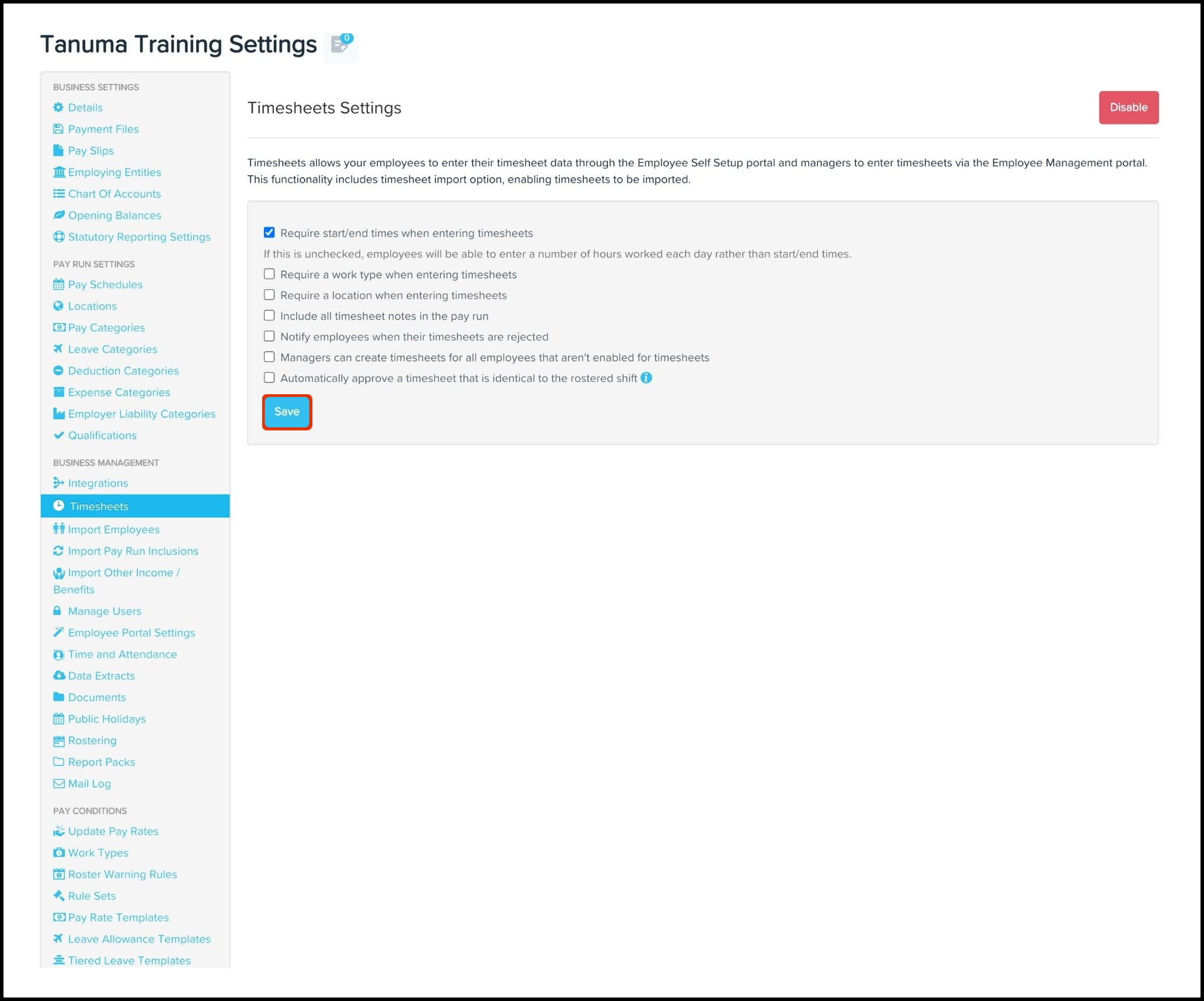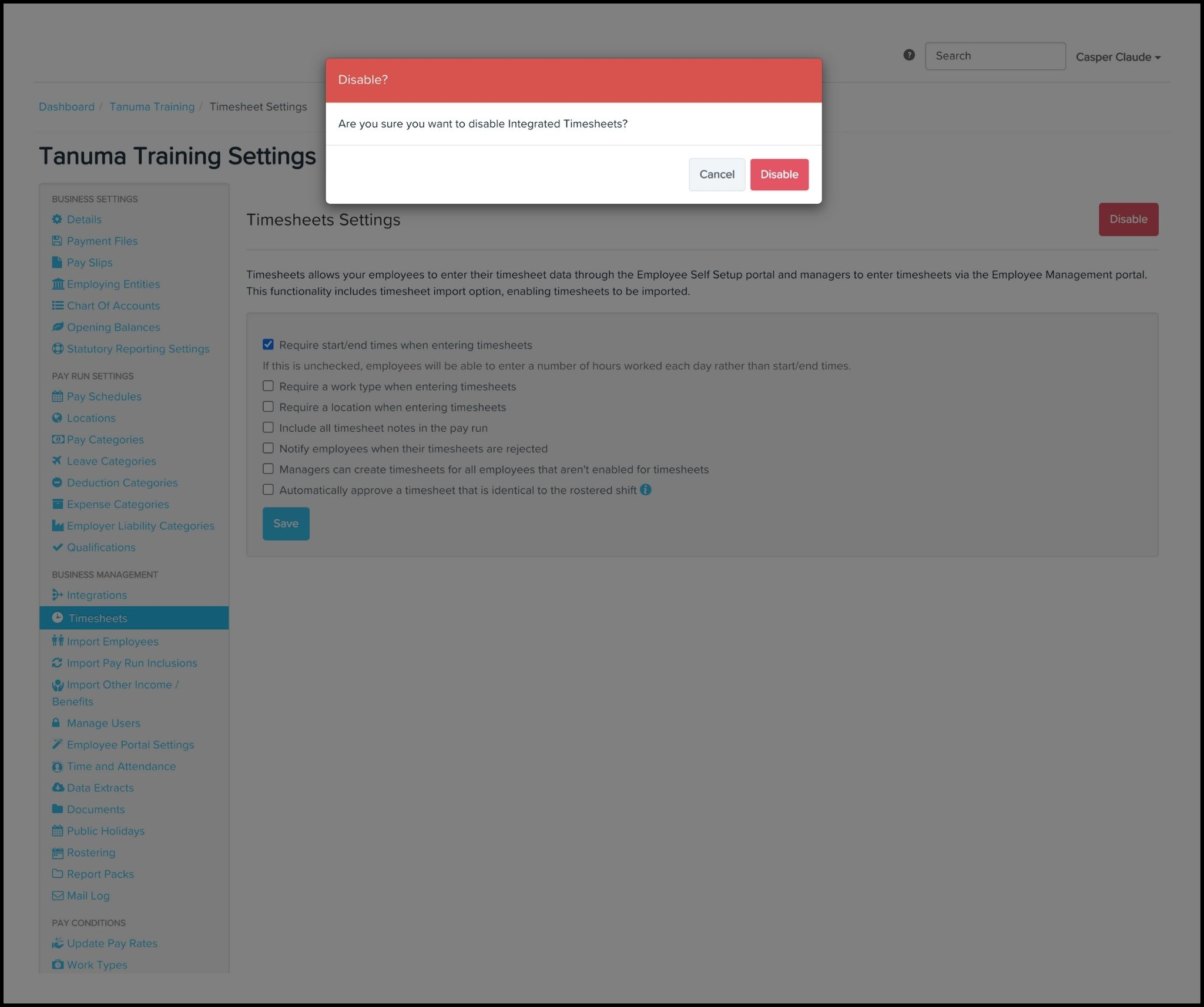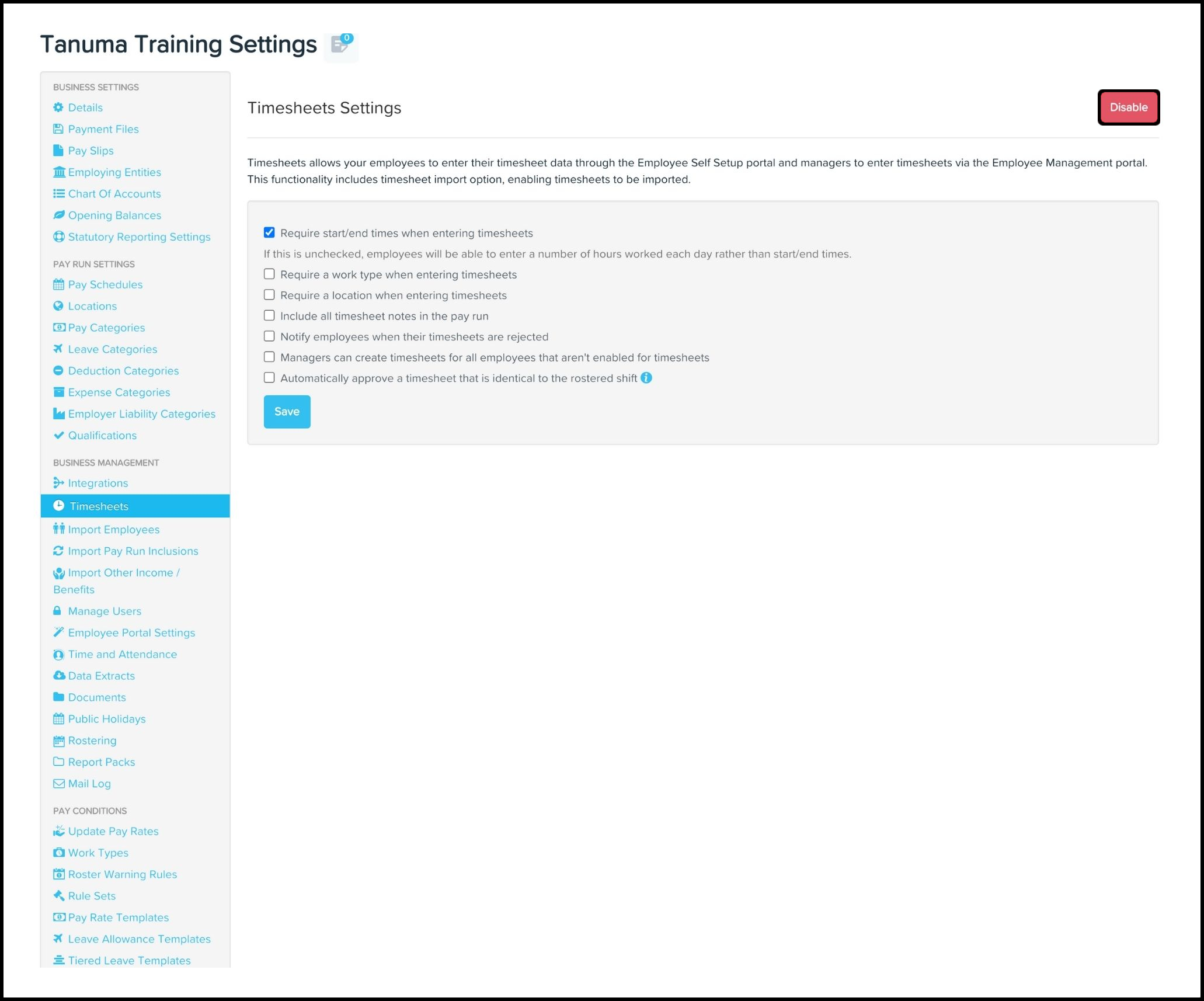 The below premise will walk you through how to edit your organisation's timesheet setting and/or disable timesheet integrations within your payroll platform.