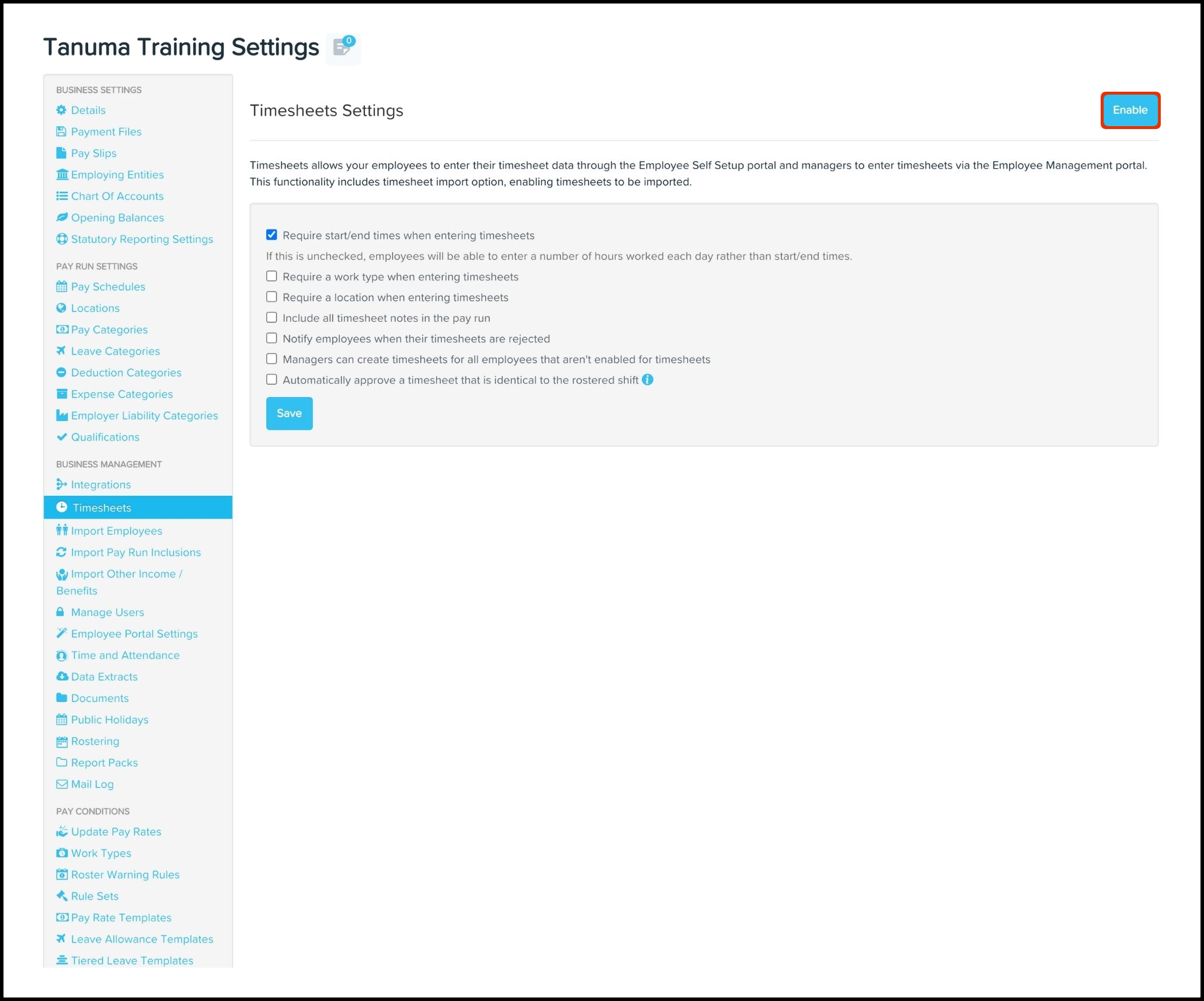 The Timesheet Settings feature enables you to customise your Payroll timesheet feature, such as by setting up the requirement for employees to enter a work type and/or location when they submit a timesheet. You can also use this feature to turn off timesheet integrations within your Payroll platform if you do not want to use an external timesheet provider within your Payroll platform.