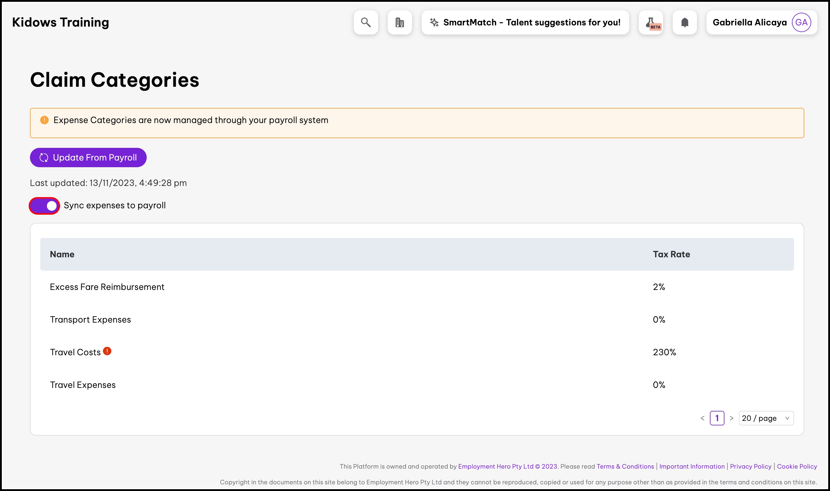 You have now disabled the option to sync your claims to your payroll platform. The switch is grey when the sync option is disabled, as shown in the photo below. To enable the feature again, you can simply toggle the switch on.
