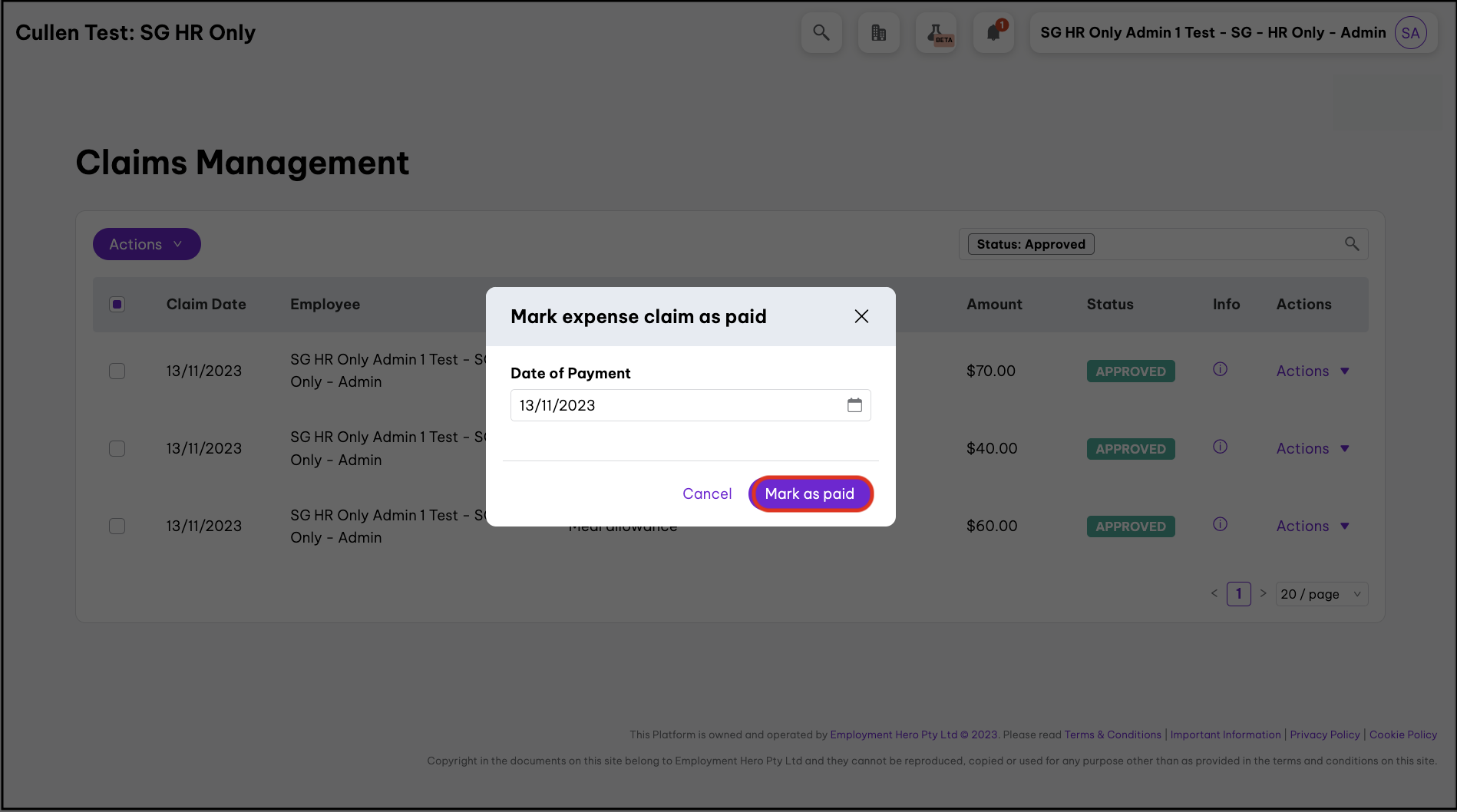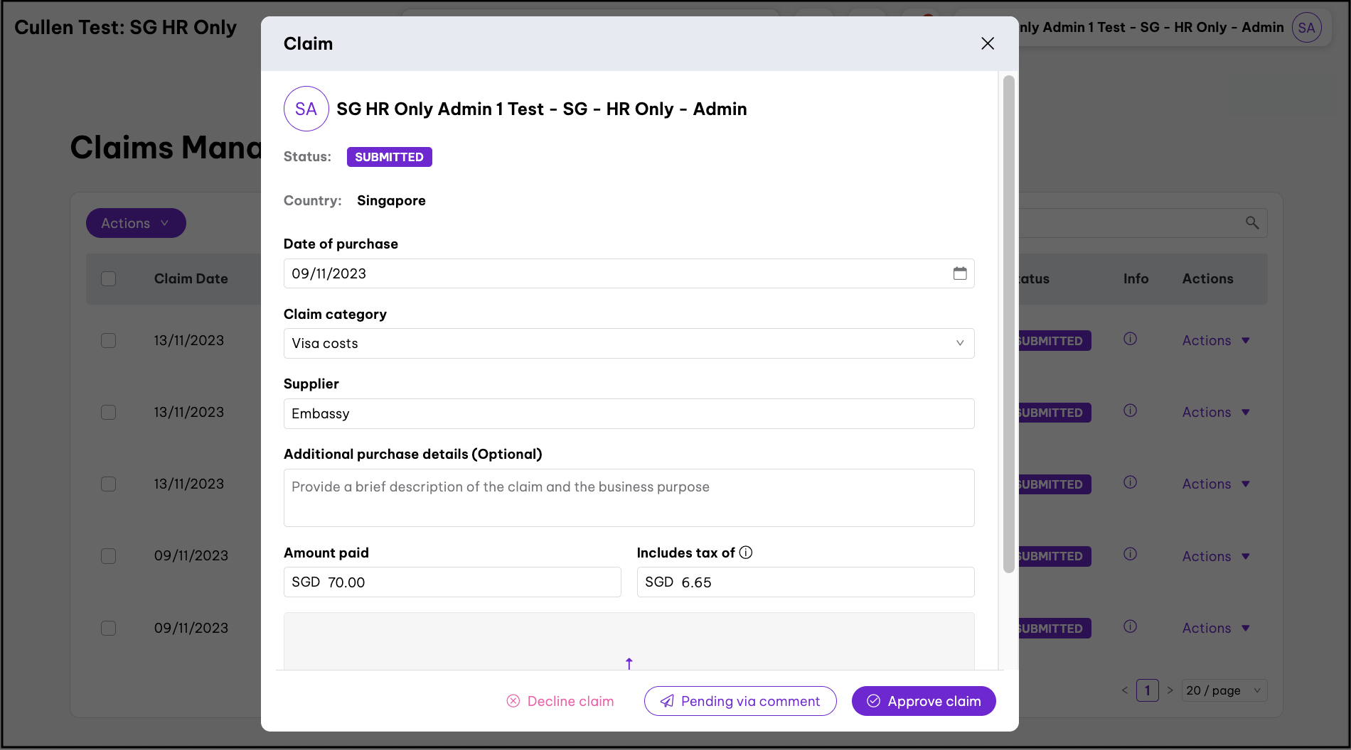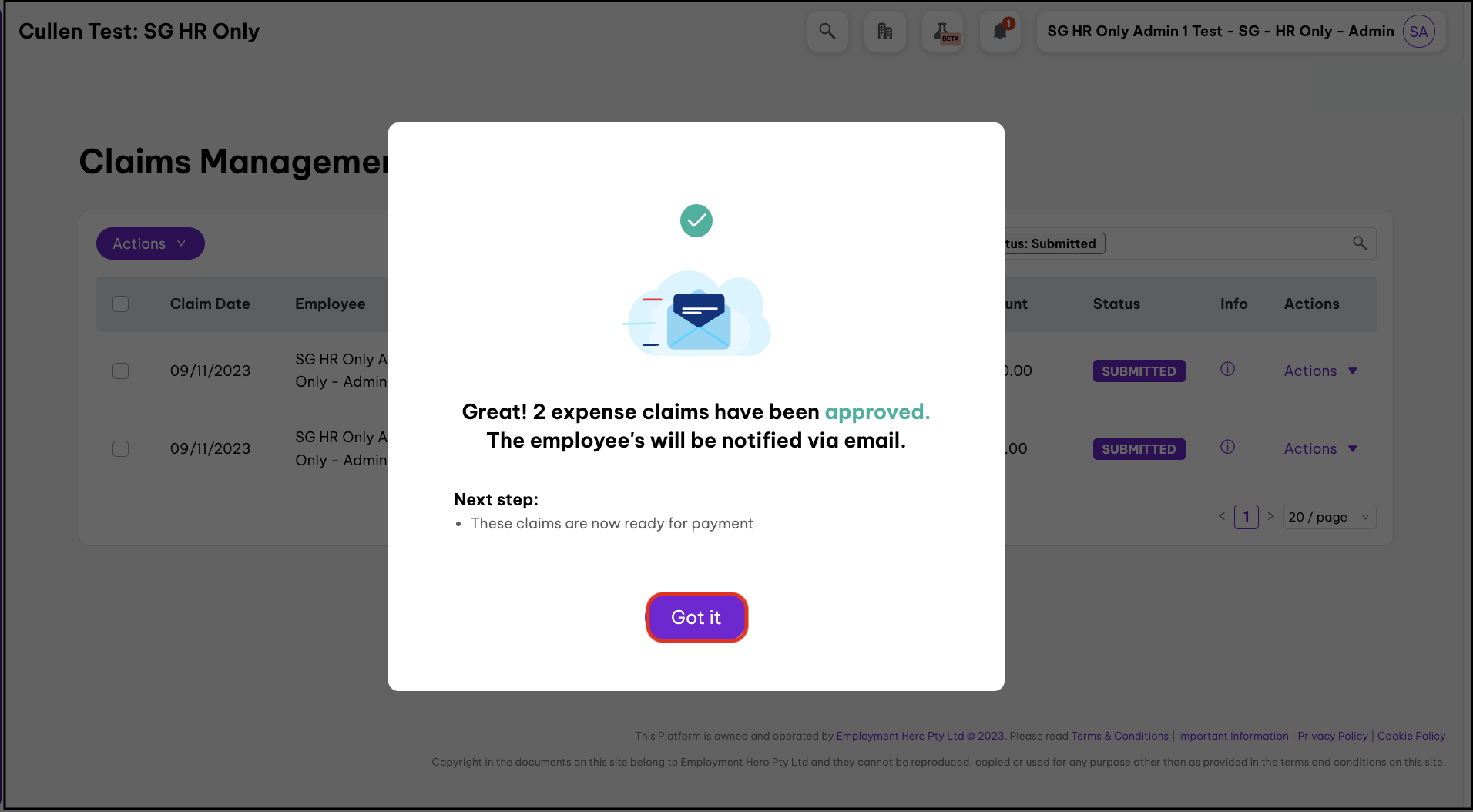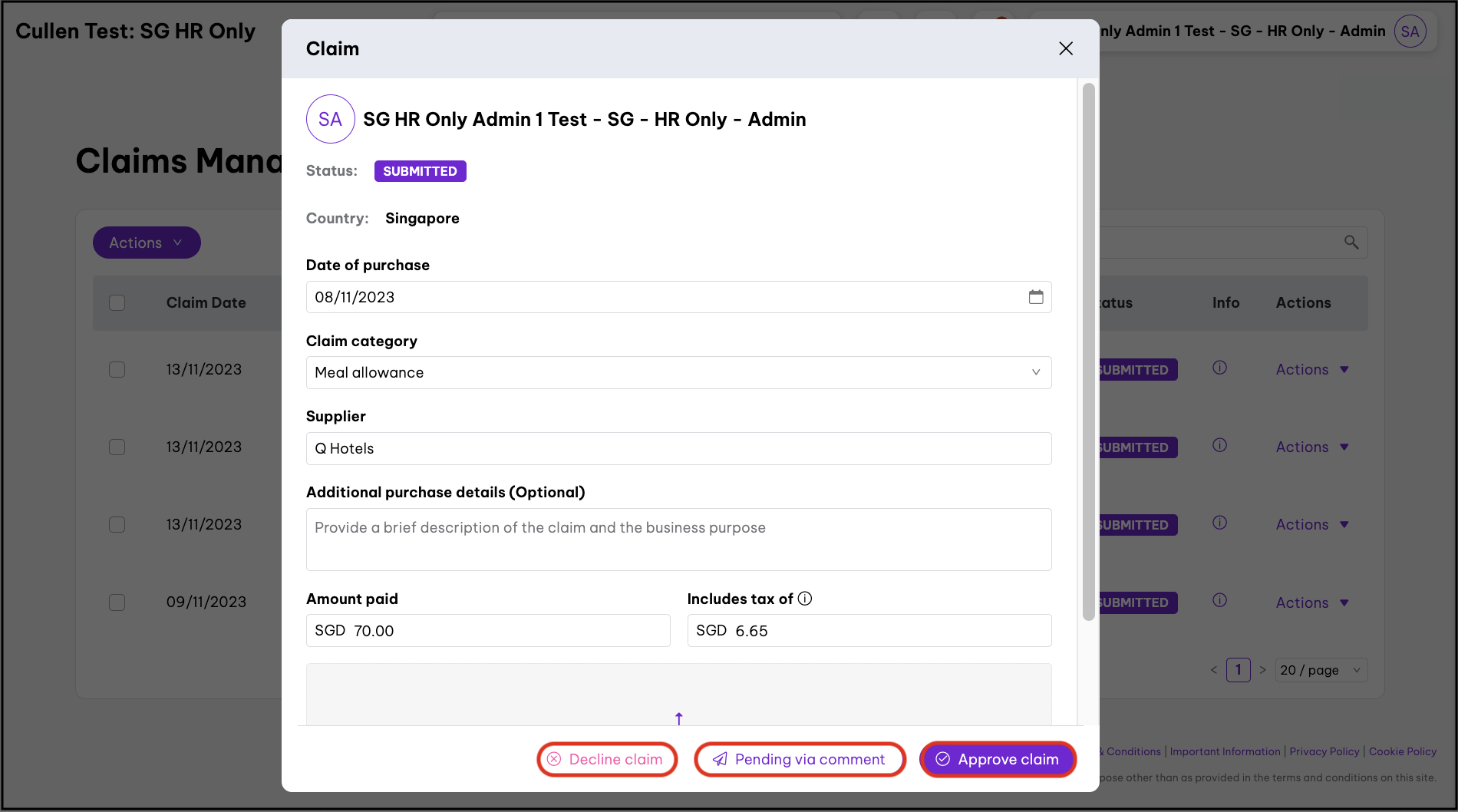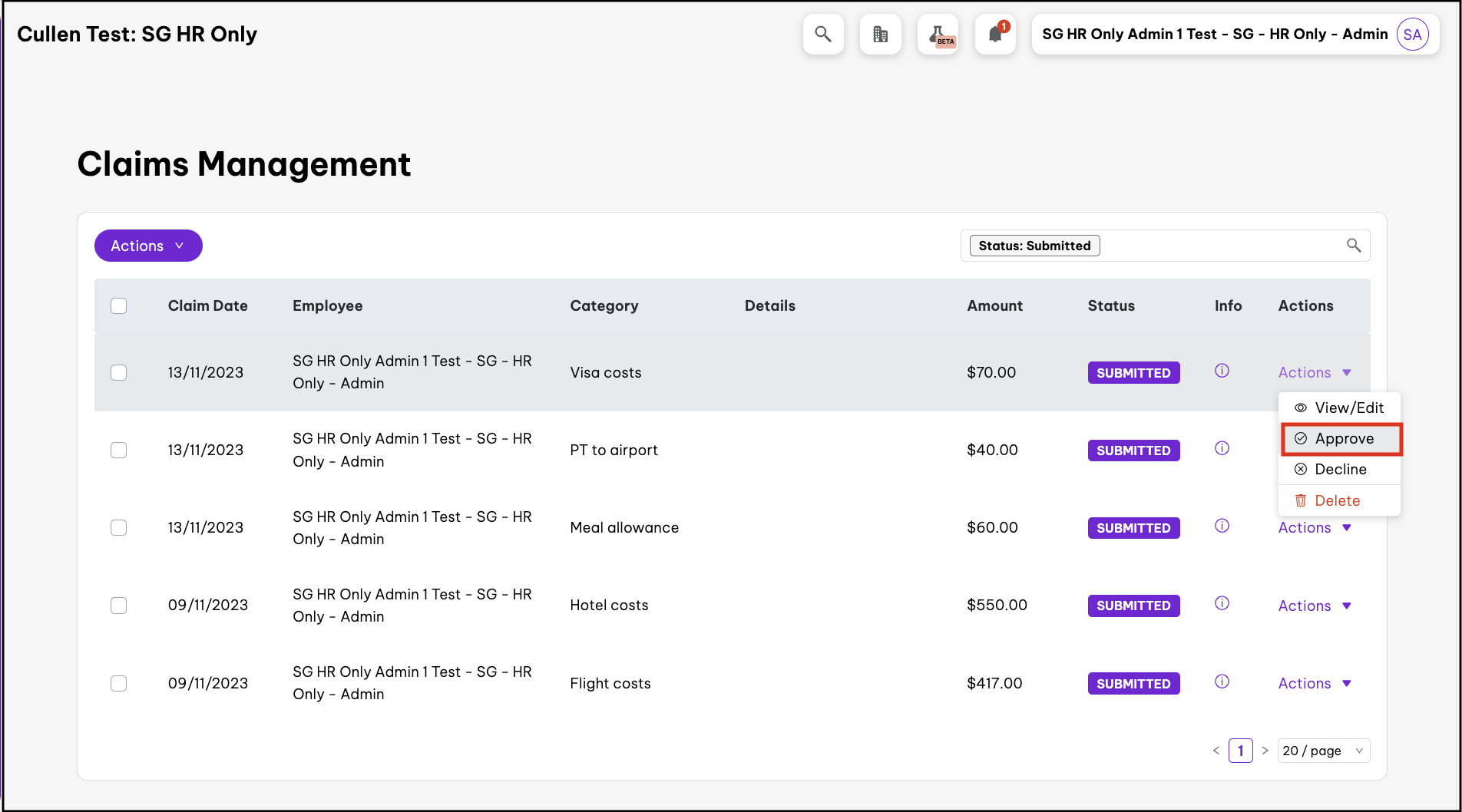 The Claim Management feature allows you to review and approve employee-submitted claims, either individually, or in bulk, and approve expenses that require additional information before being processed. You can also mark claims as paid, download a CSV file of your claims, edit the information provided, and delete any unnecessary submissions.