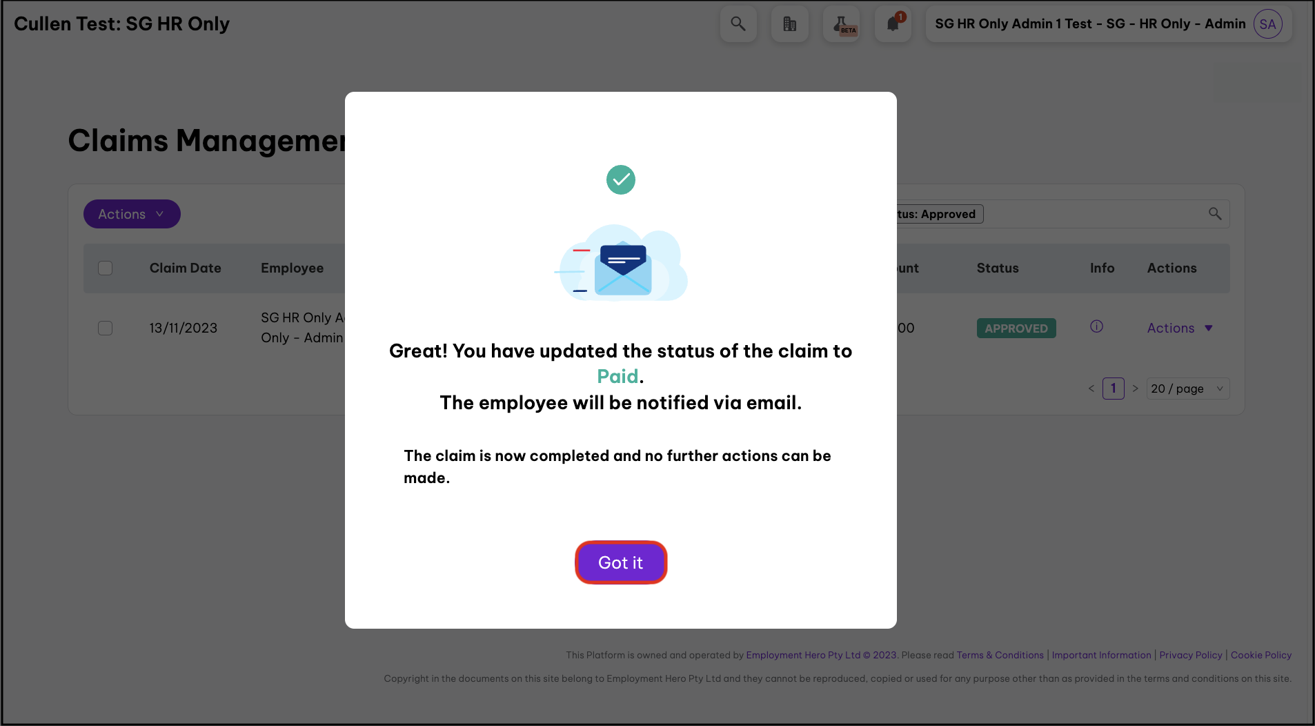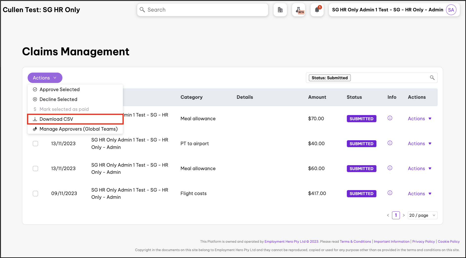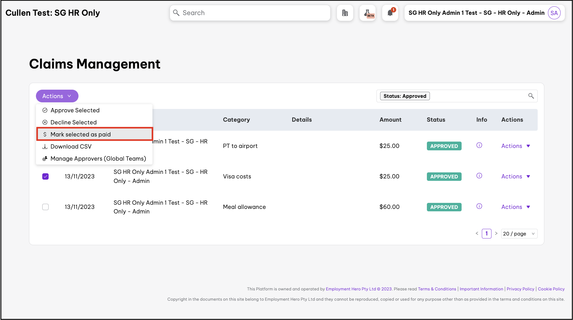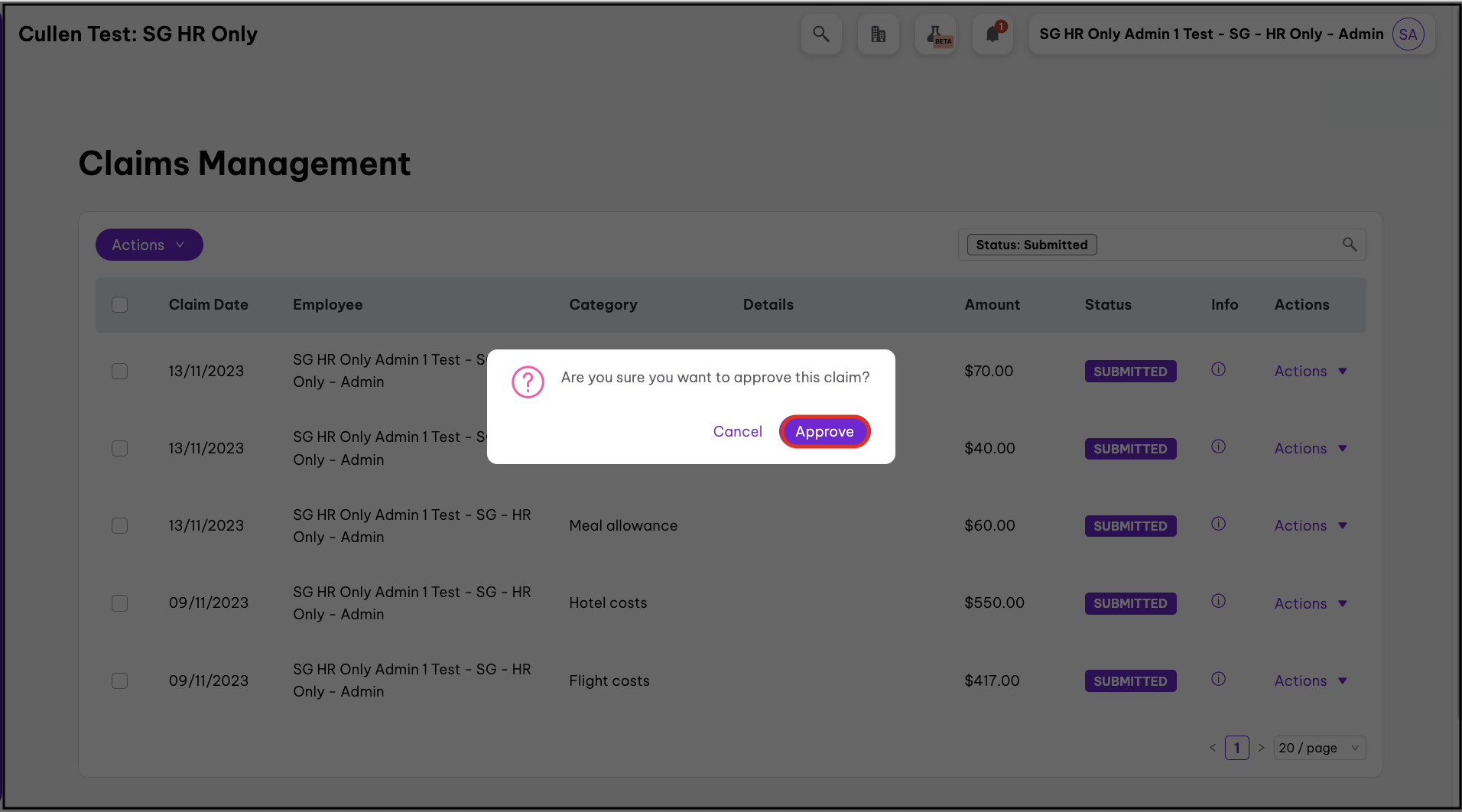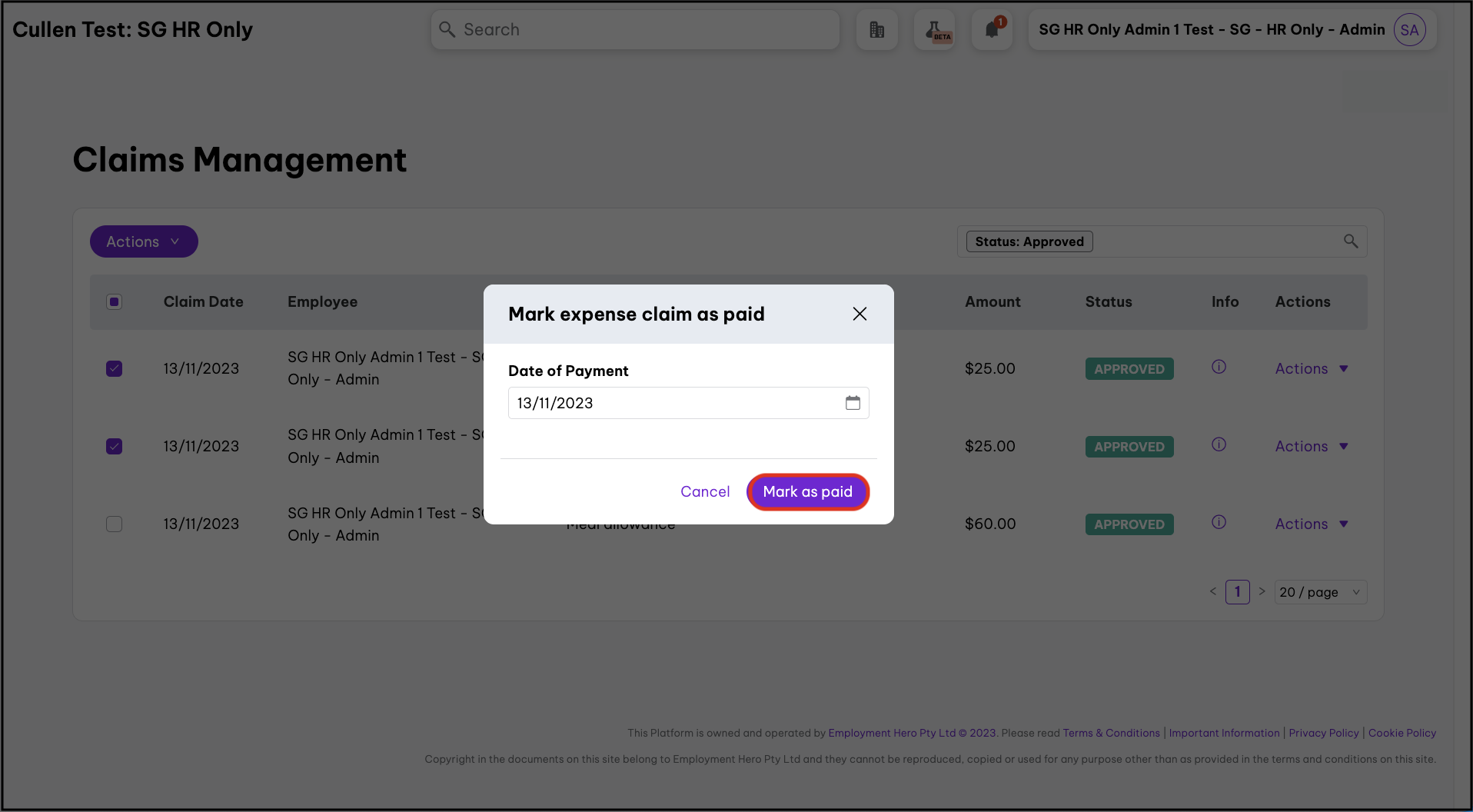 The Claim Management feature allows you to review and approve employee-submitted claims, either individually, or in bulk, and approve expenses that require additional information before being processed. You can also mark claims as paid, download a CSV file of your claims, edit the information provided, and delete any unnecessary submissions.
