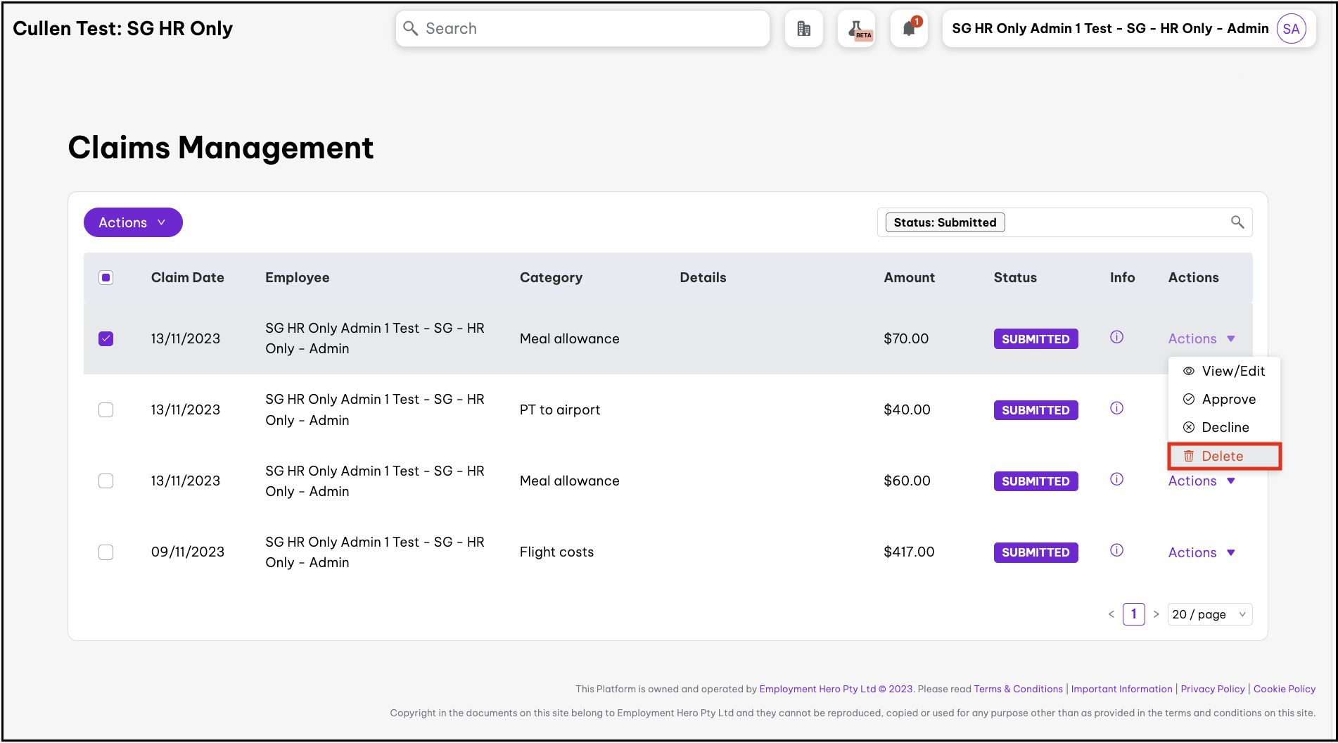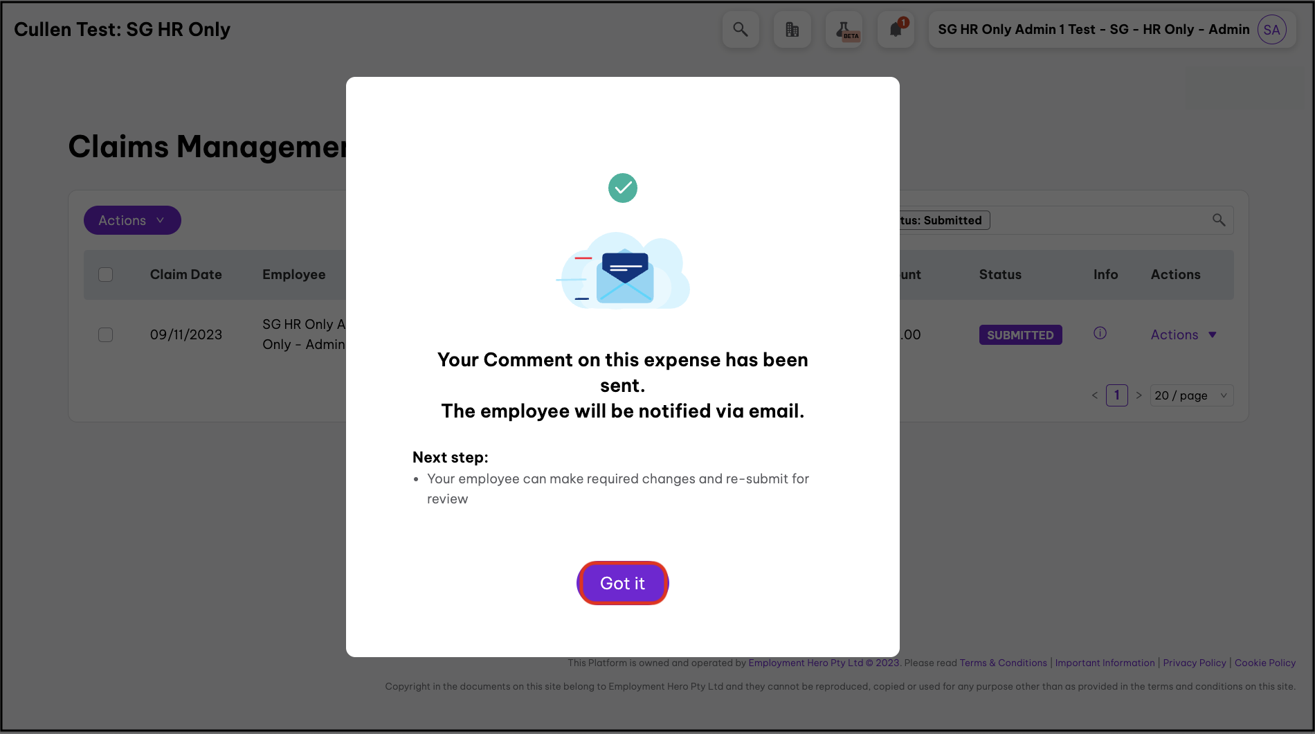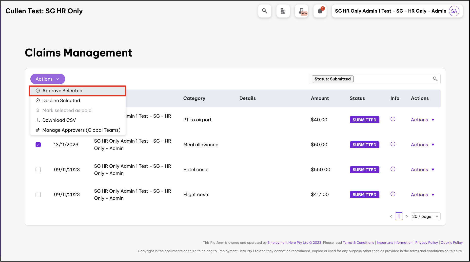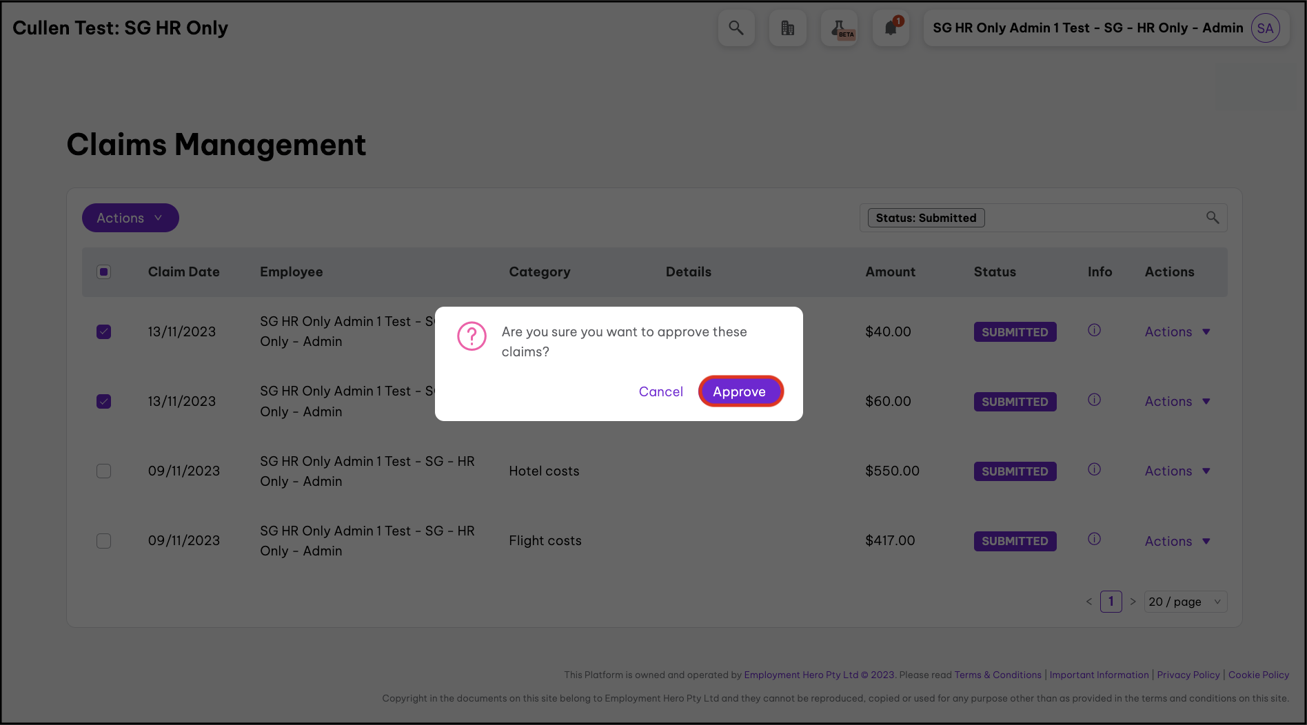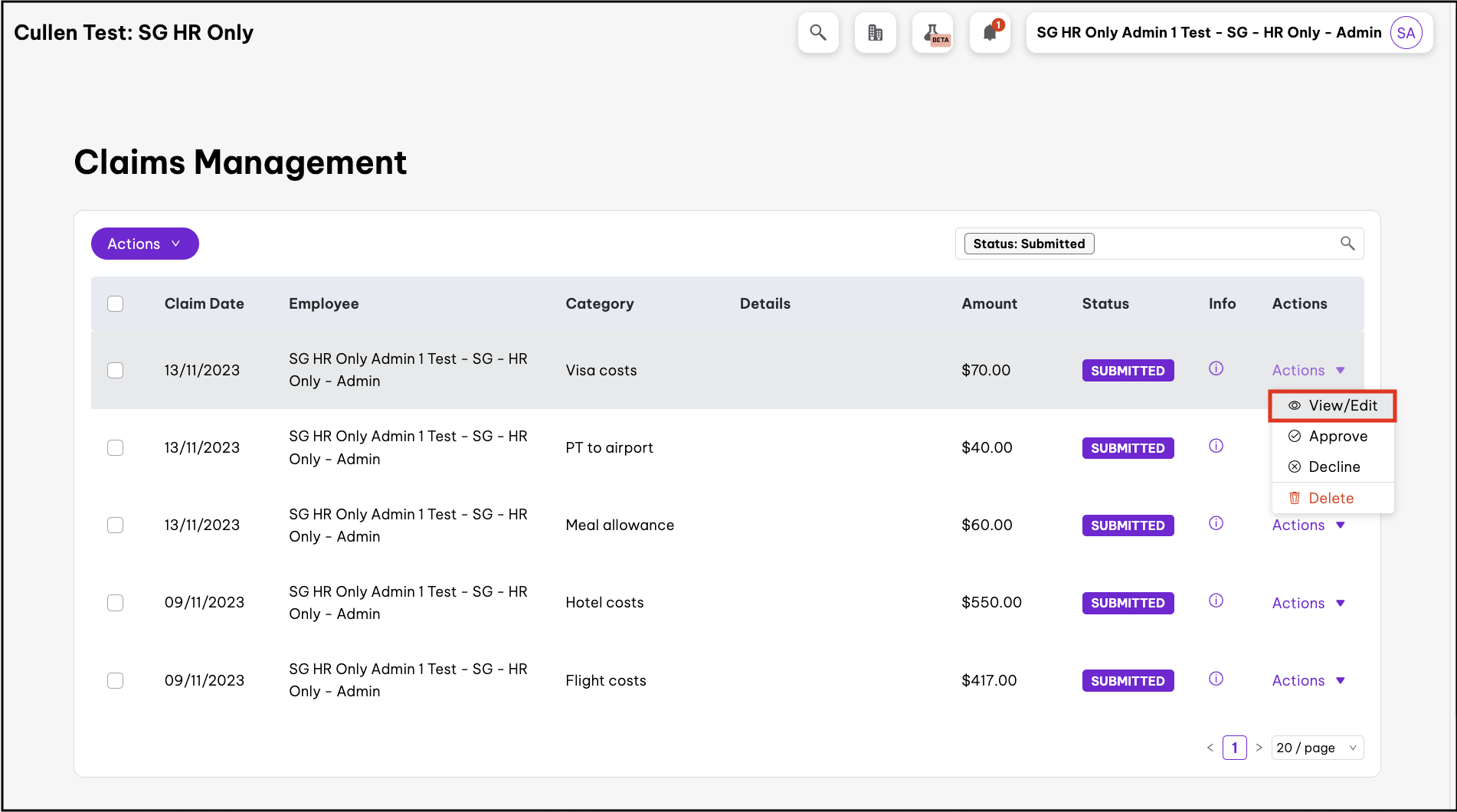The Claim Management feature allows you to review and approve employee-submitted claims, either individually, or in bulk, and approve expenses that require additional information before being processed. You can also mark claims as paid, download a CSV file of your claims, edit the information provided, and delete any unnecessary submissions.