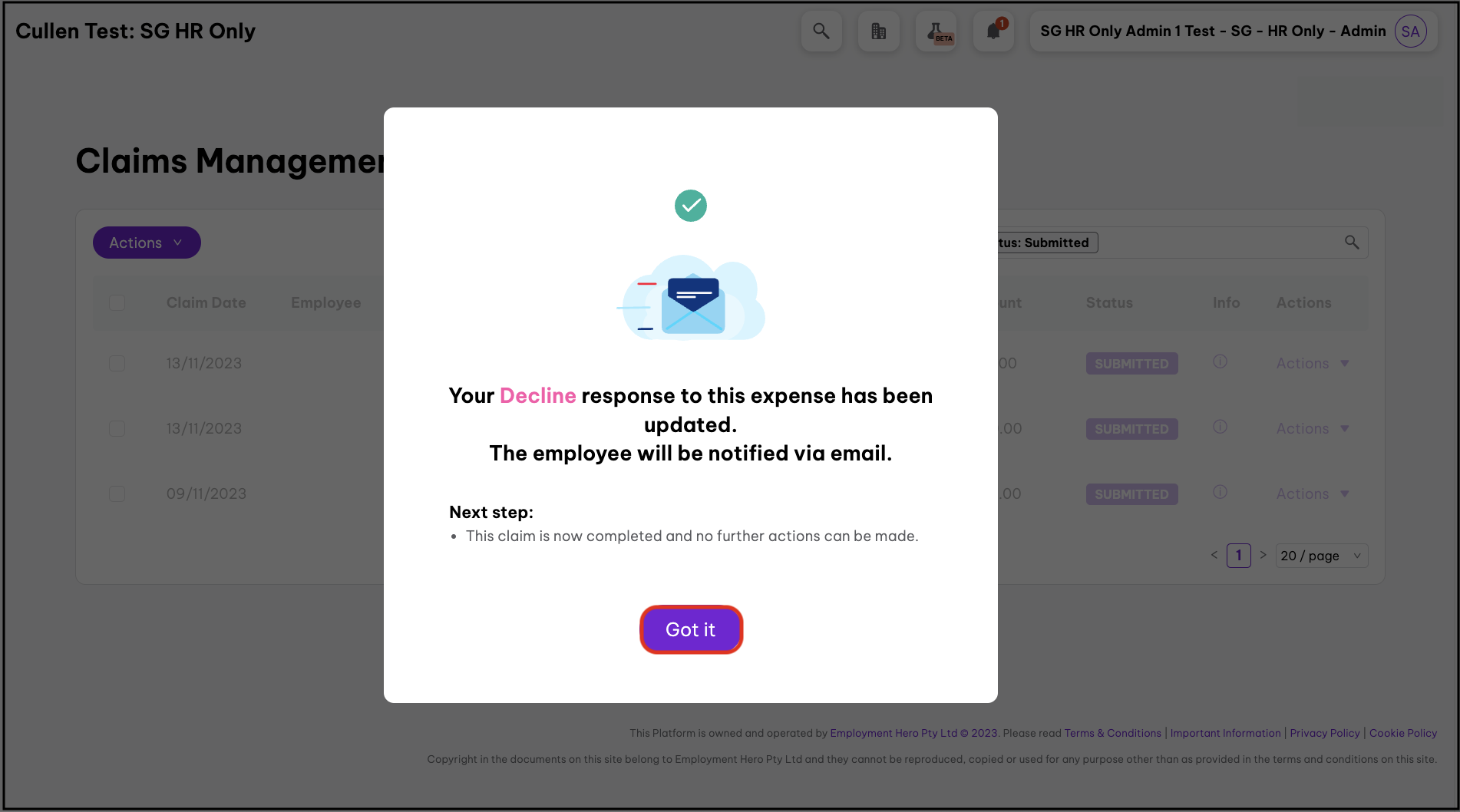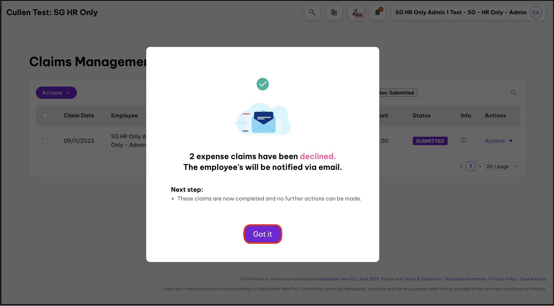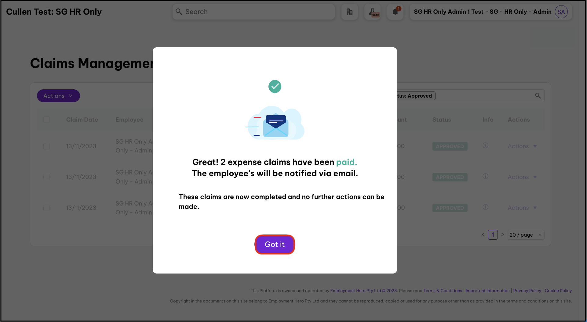 For HR and payroll connected organisations, a claim will sync to your payroll platform once it has been approved in the HR platform. It appears in the Expense Management page and will be paid in the next Pay Run. Once an expense is processed and the payslips are published, the expense locks in the HR platform.