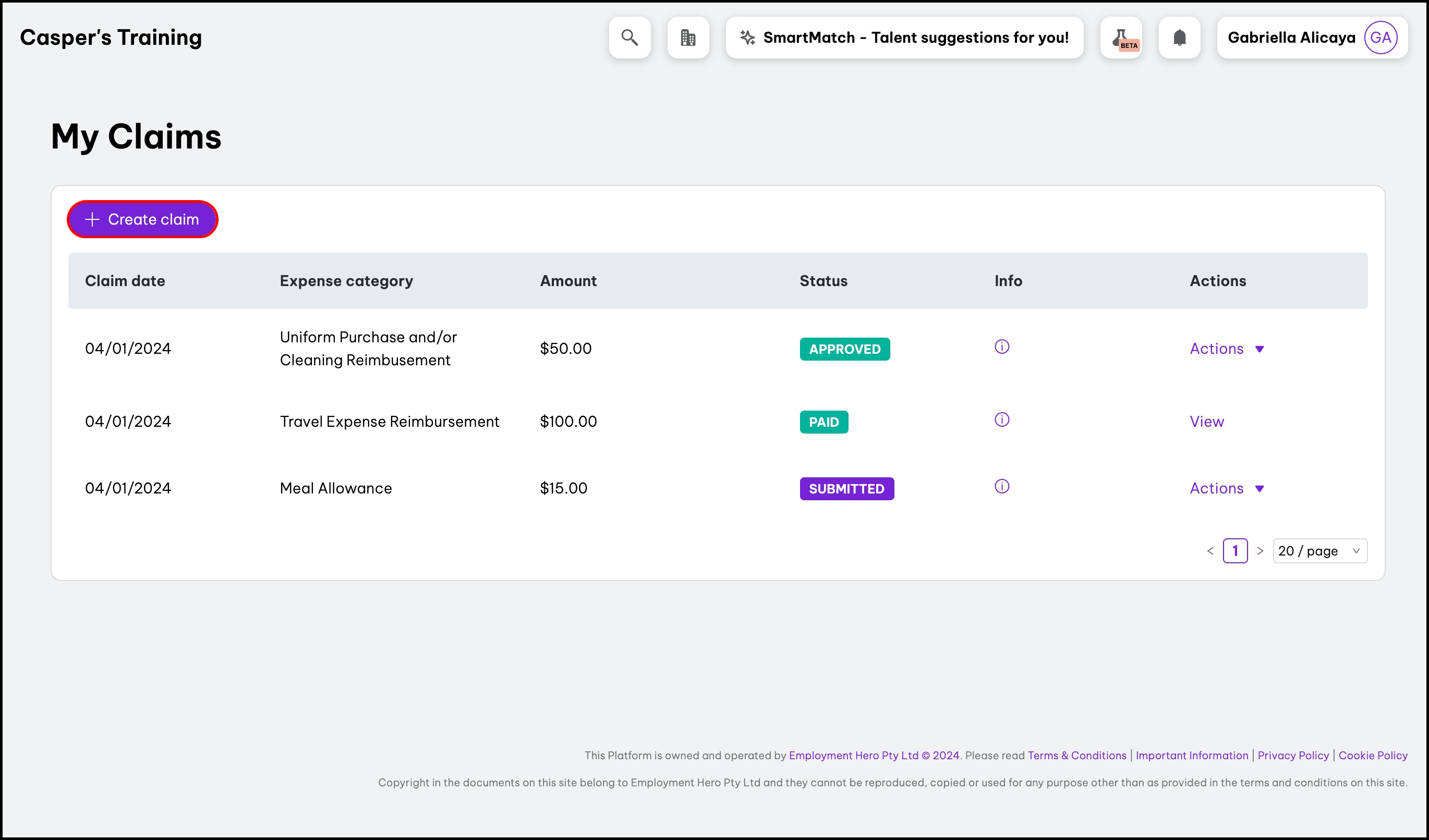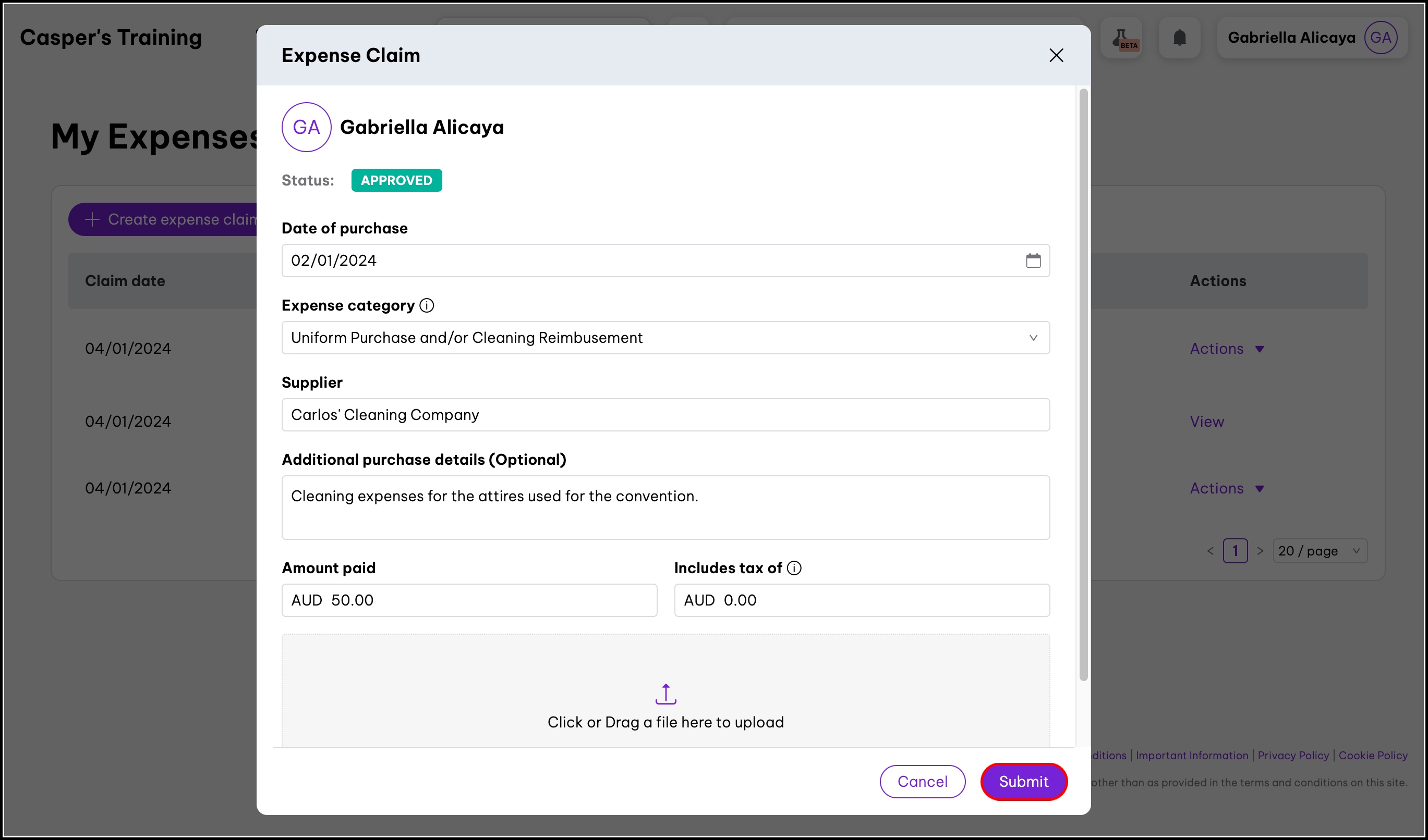 You can use the My Claims feature to send an expense request for approval, with the ability to specify the date of purchase, amount paid, and supplier, and attach any required receipts. The feature also lets you edit a claim and delete those that are no longer needed.