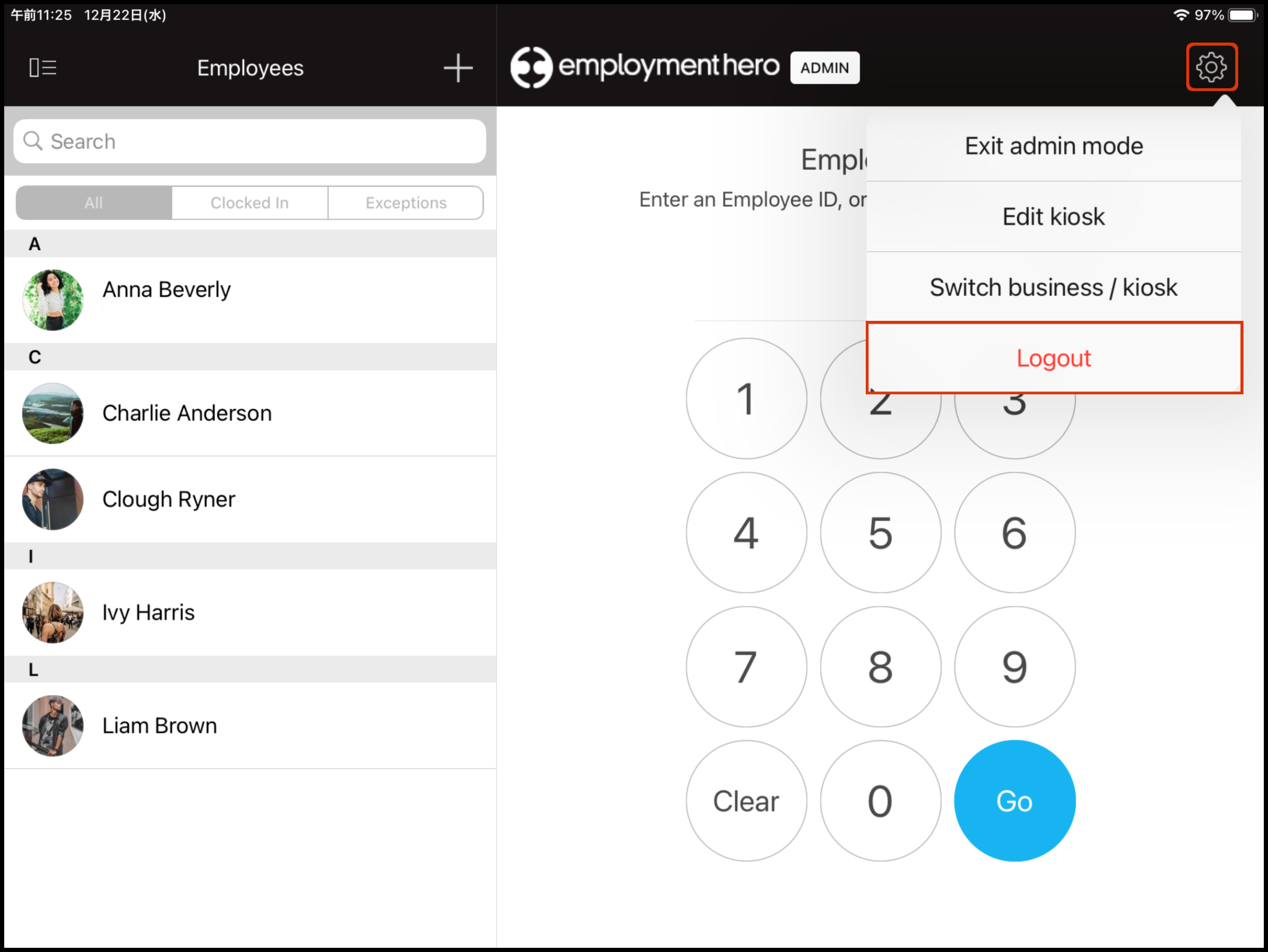 The Logout function on the Clock Me In App (downloadable for iPad users on the App Store) allows you to exit the current instance loaded on your iPad. You will need to have enabled Admin Mode first before you can access this feature.