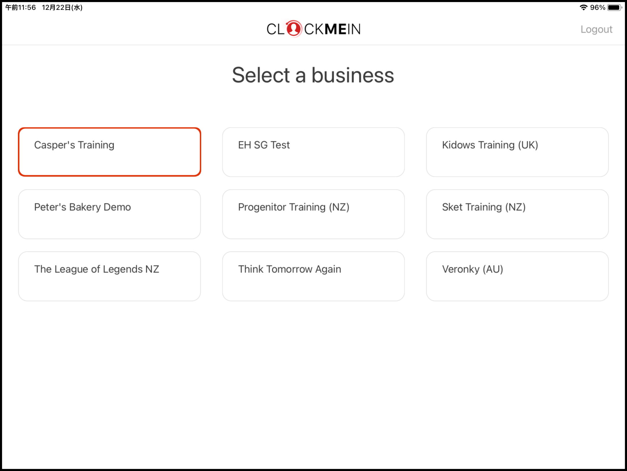 When first logging into the Clock Me In app (downloadable for iPad users on Apple's App Store), you will need to enter the username and password you would use to log into the payroll platform. You can then select your admin passcode, and what business and kiosk the app loads.