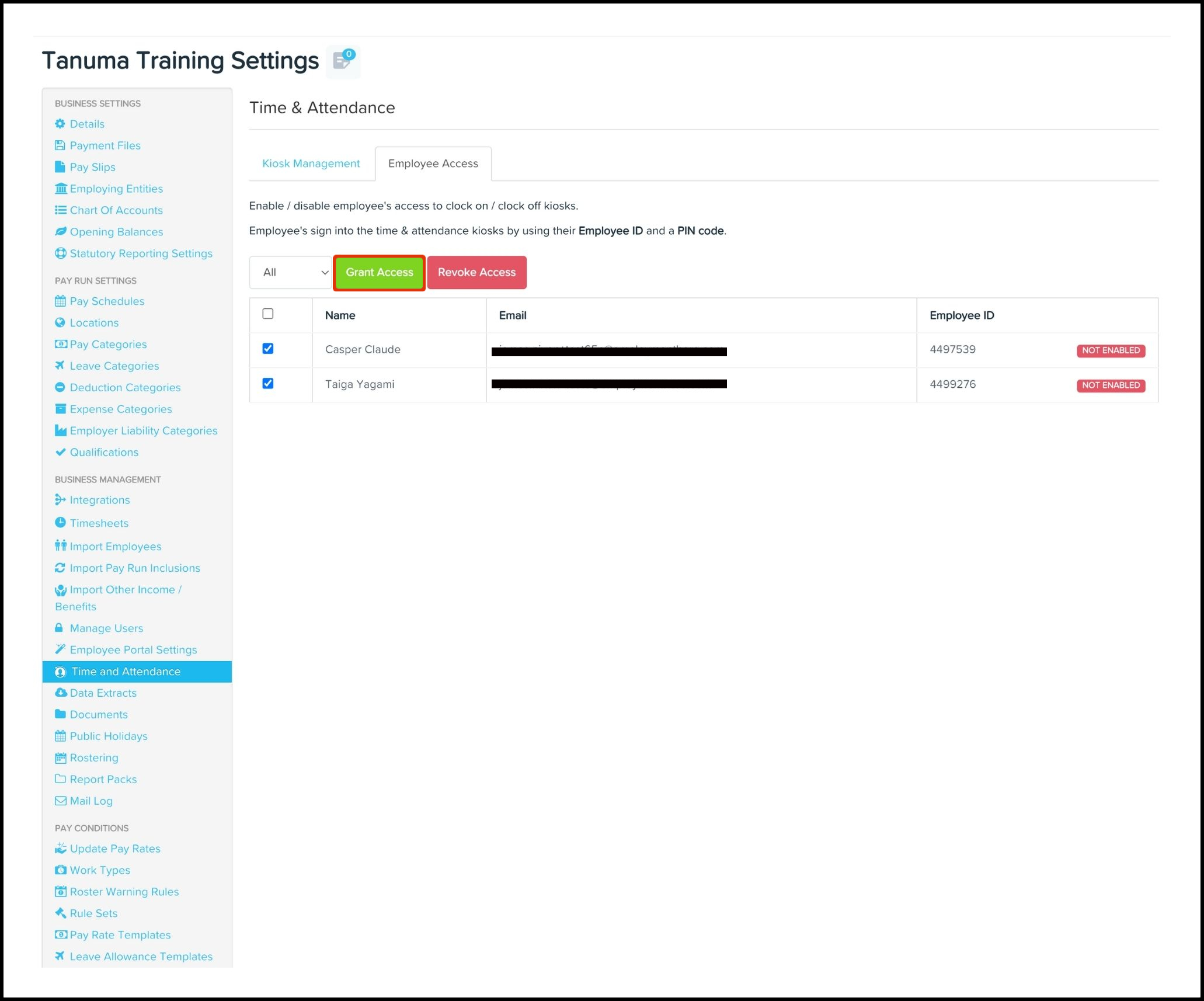 The Time and Attendance Access Management feature allows you to grant access in bulk to employees who need to use your Clock Me In iPad app (downloadable for iPad users on the App Store). You can also use this feature to revoke an employee's access if they no longer need to clock in for work.