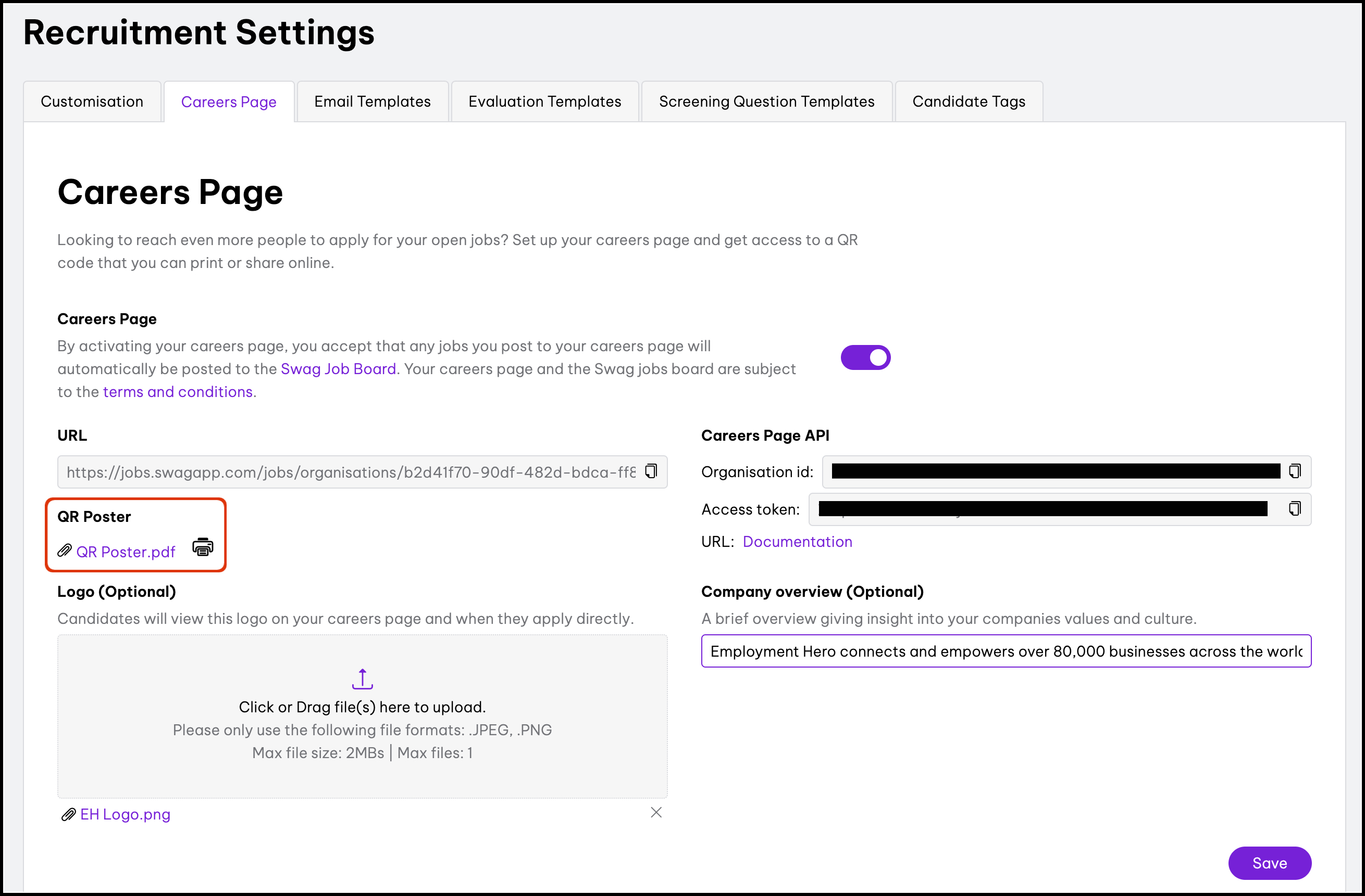 The Careers Page feature enables you to create a customised careers page where employees can view open roles and apply internally. You can personalise this page by adding your company logo or an overview. You also have the option to generate a poster with a QR code that both internal employees and external candidates can scan to access the careers page. For inspiration or to see what a completed careers page looks like, you can refer to the Employment Hero Careers page. We will enable the Careers Page by default. If you do not wish to activate your careers page, you will need to switch off the Careers Page toggle.