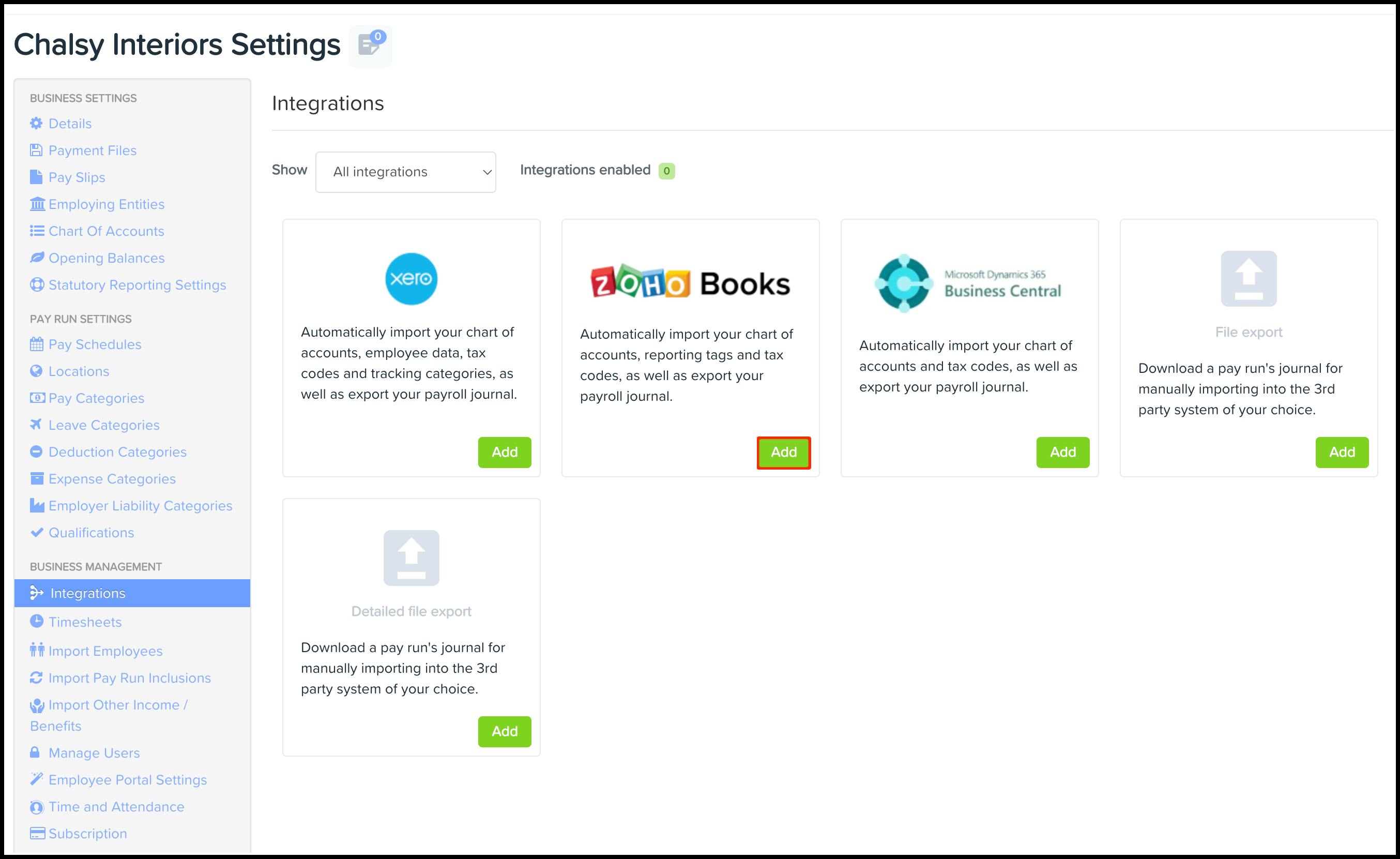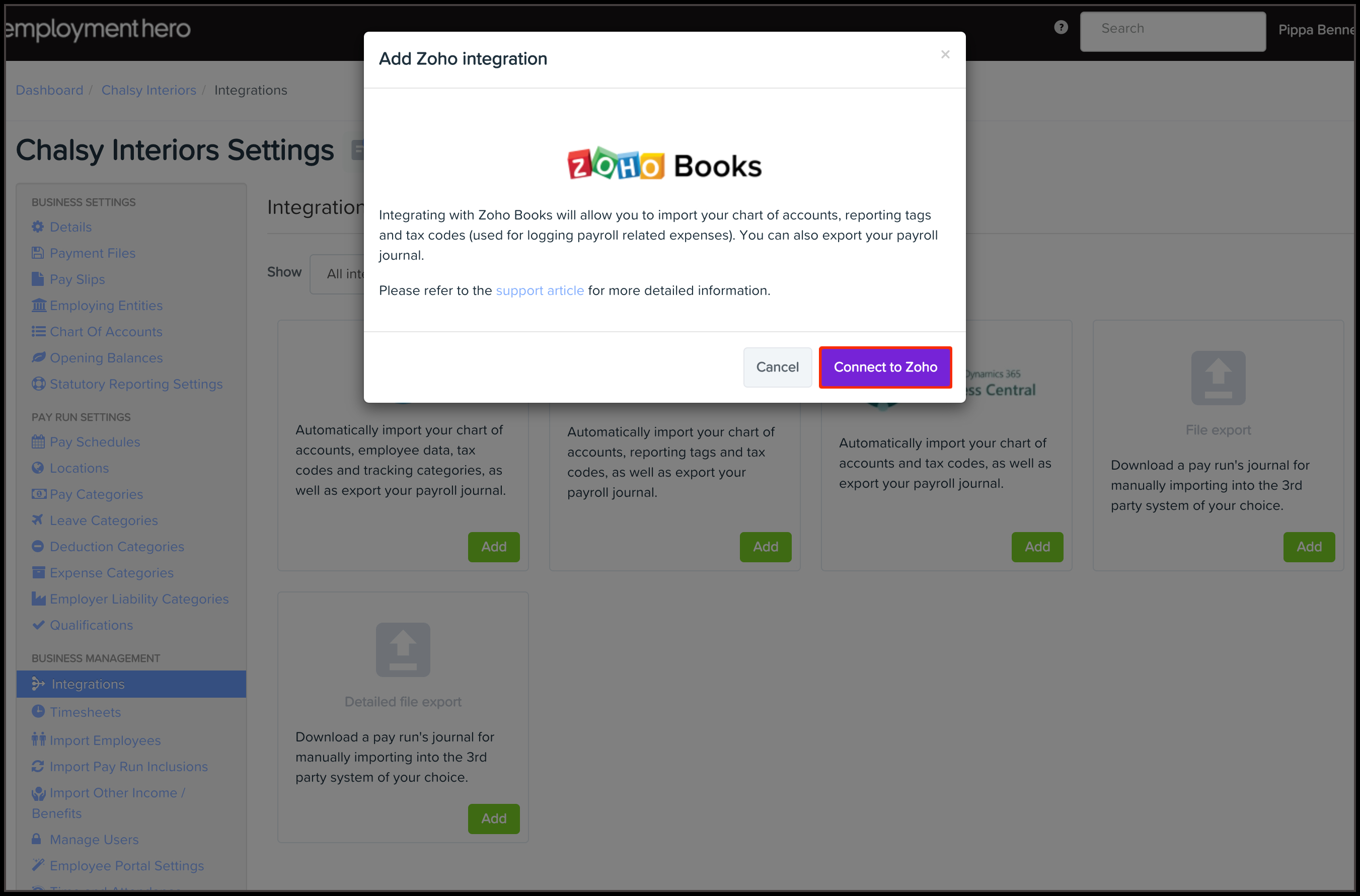 The below premises will walk you through how to connect your Zoho accounting platform with your EH payroll platform.