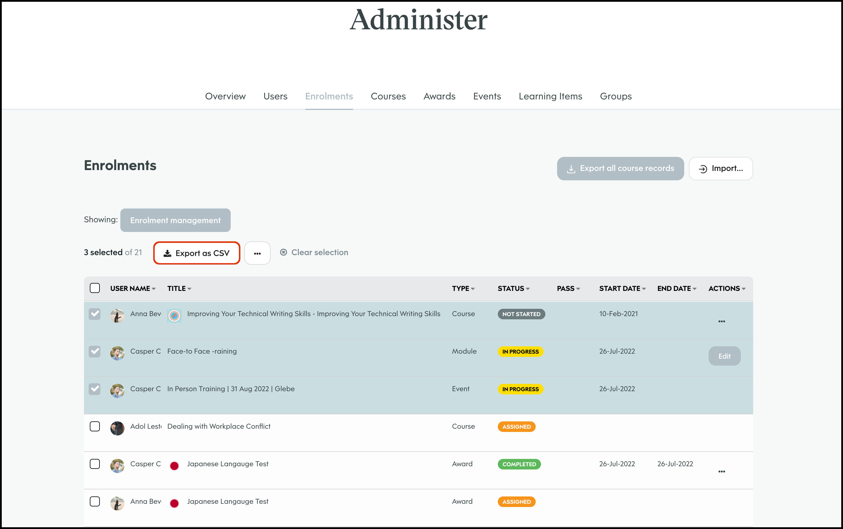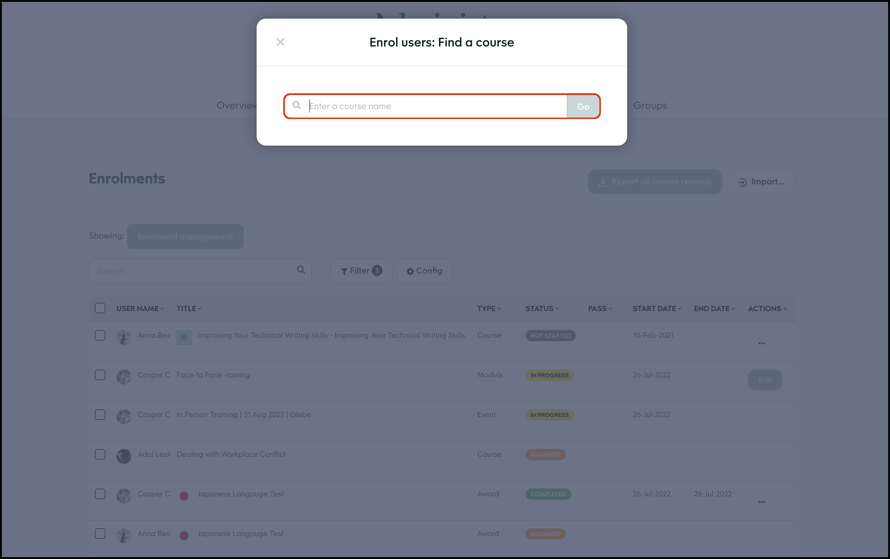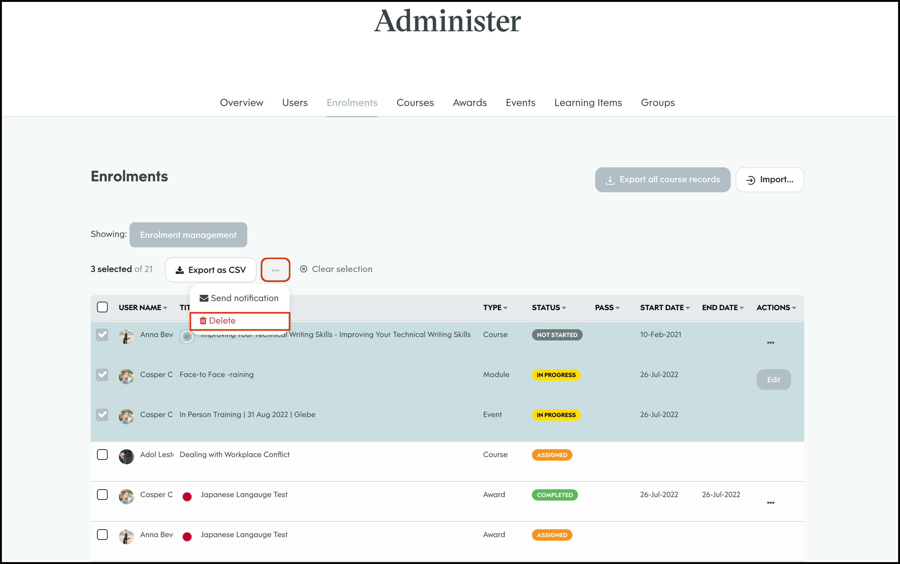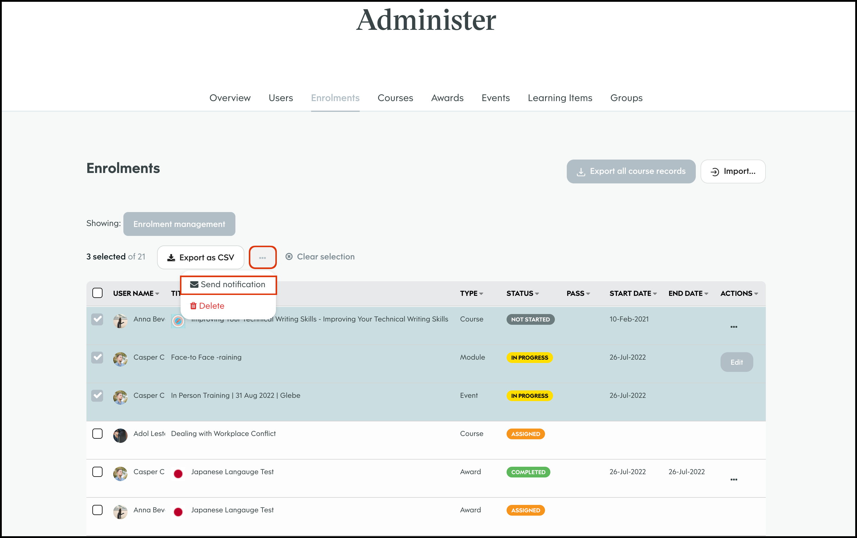 The Enrolment Management module allows you to select a course and bulk import users to assign to said learning material. You can then send out either an in platform notification or an email letting them know of their new job. You can also use this feature to export all your organisation's course records, edit a user's course enrolment details, and delete an entry that is no longer required.