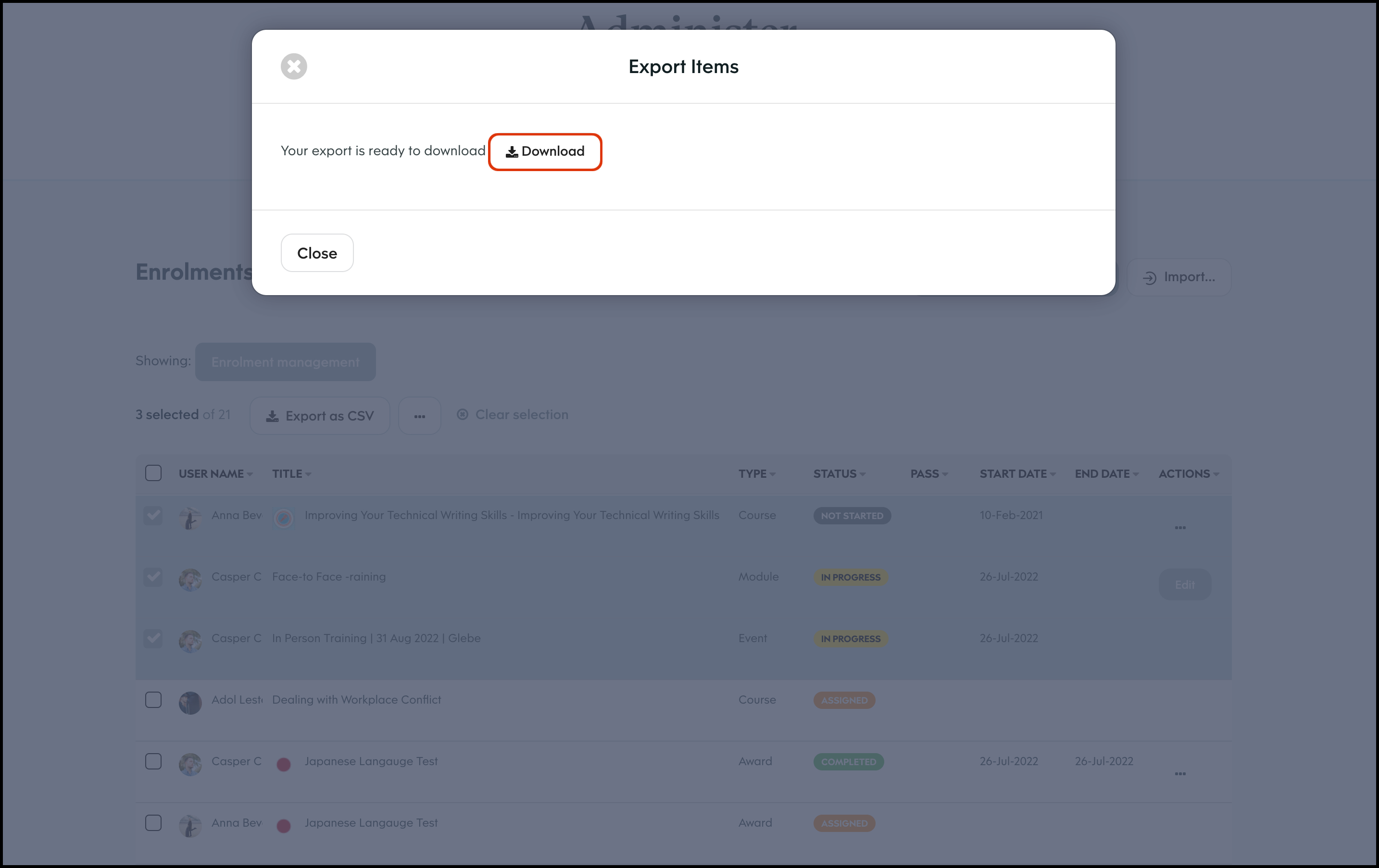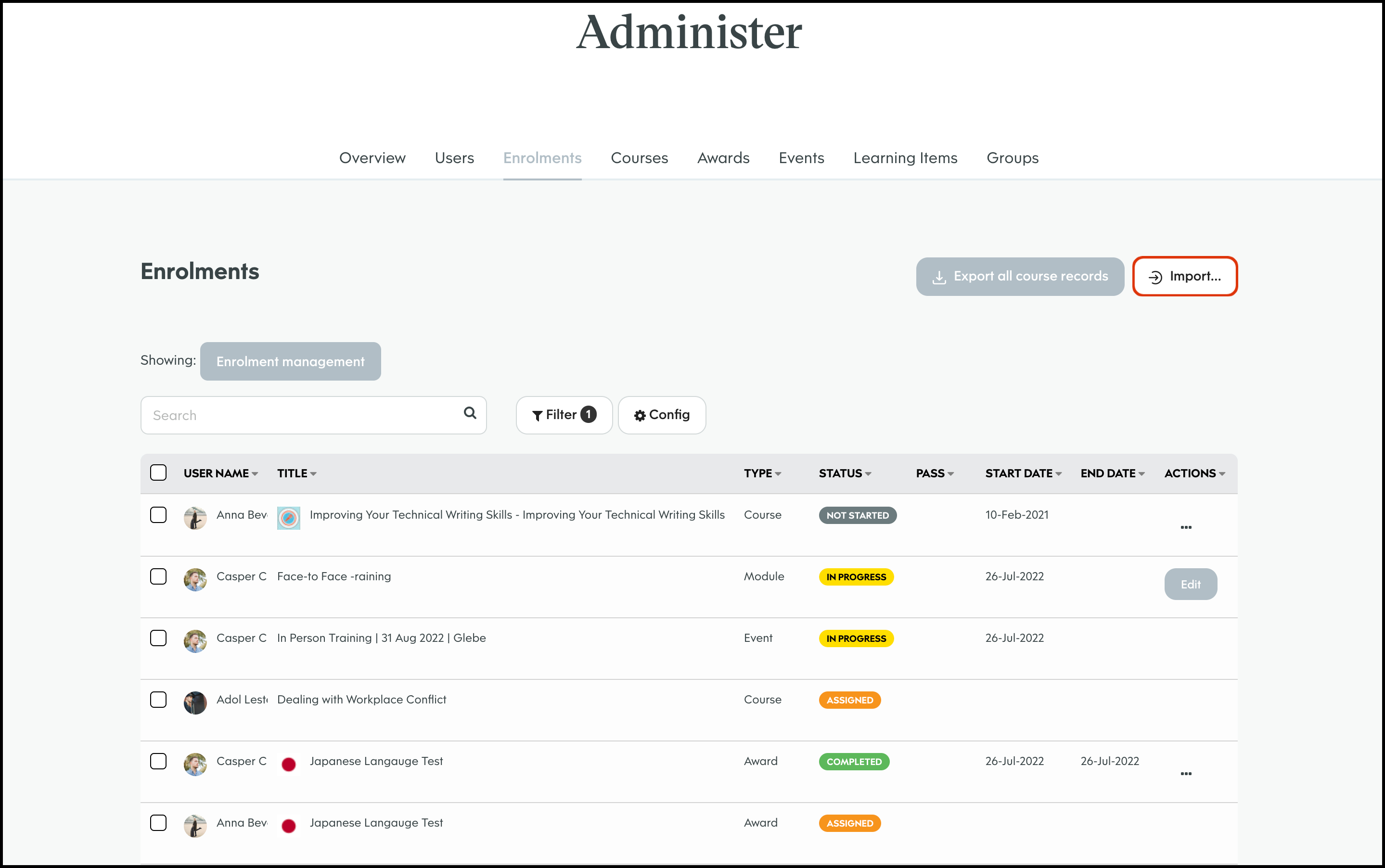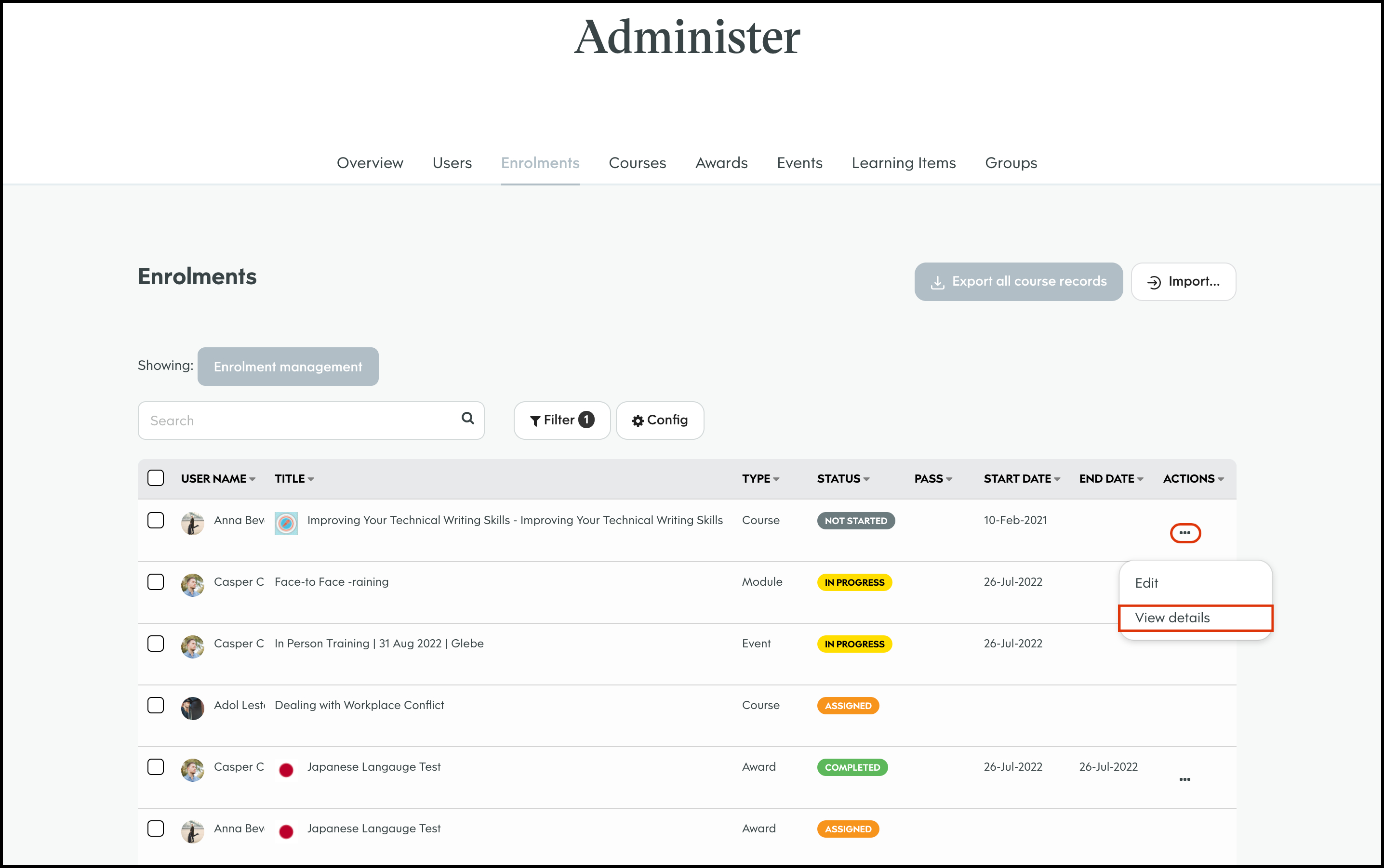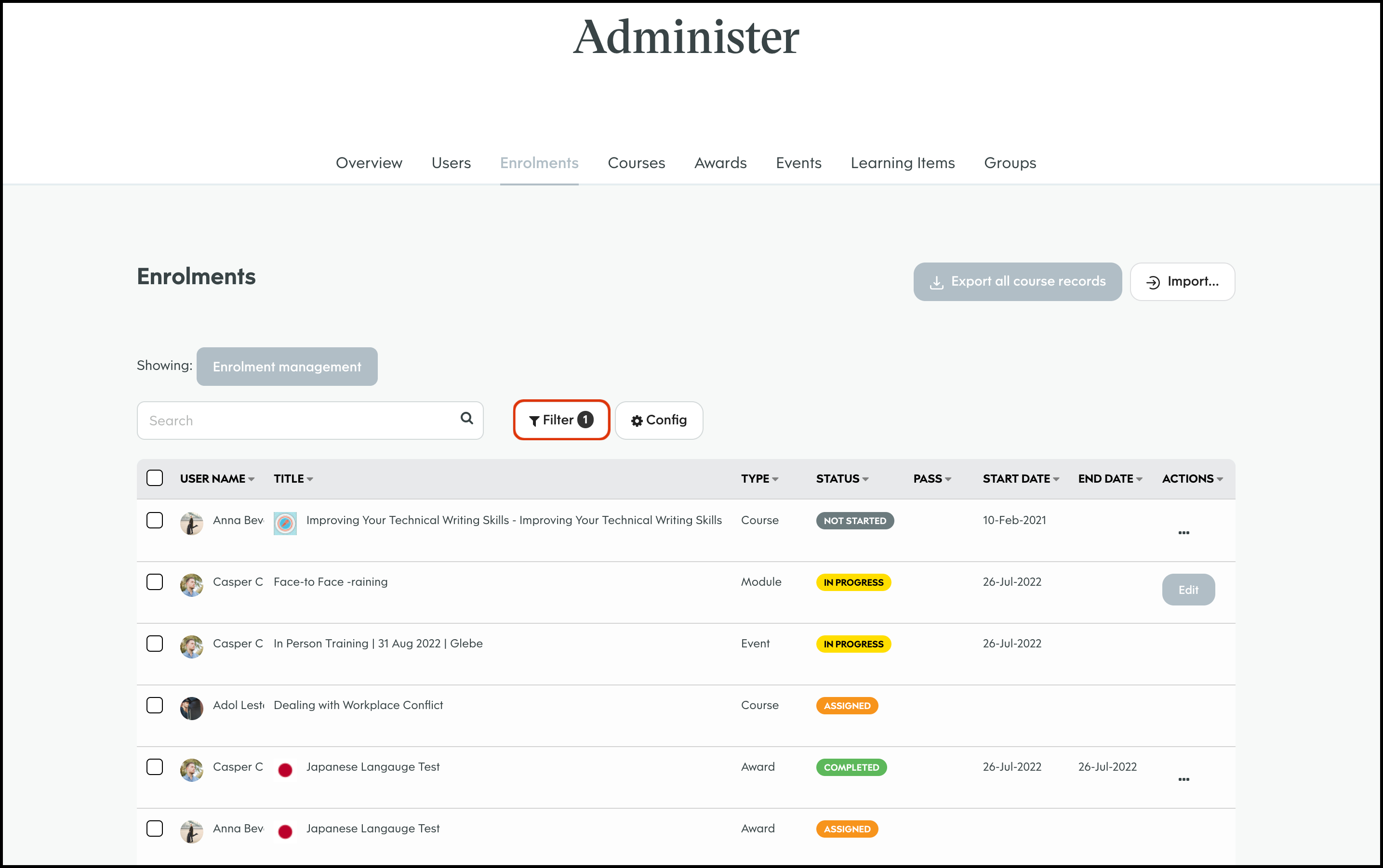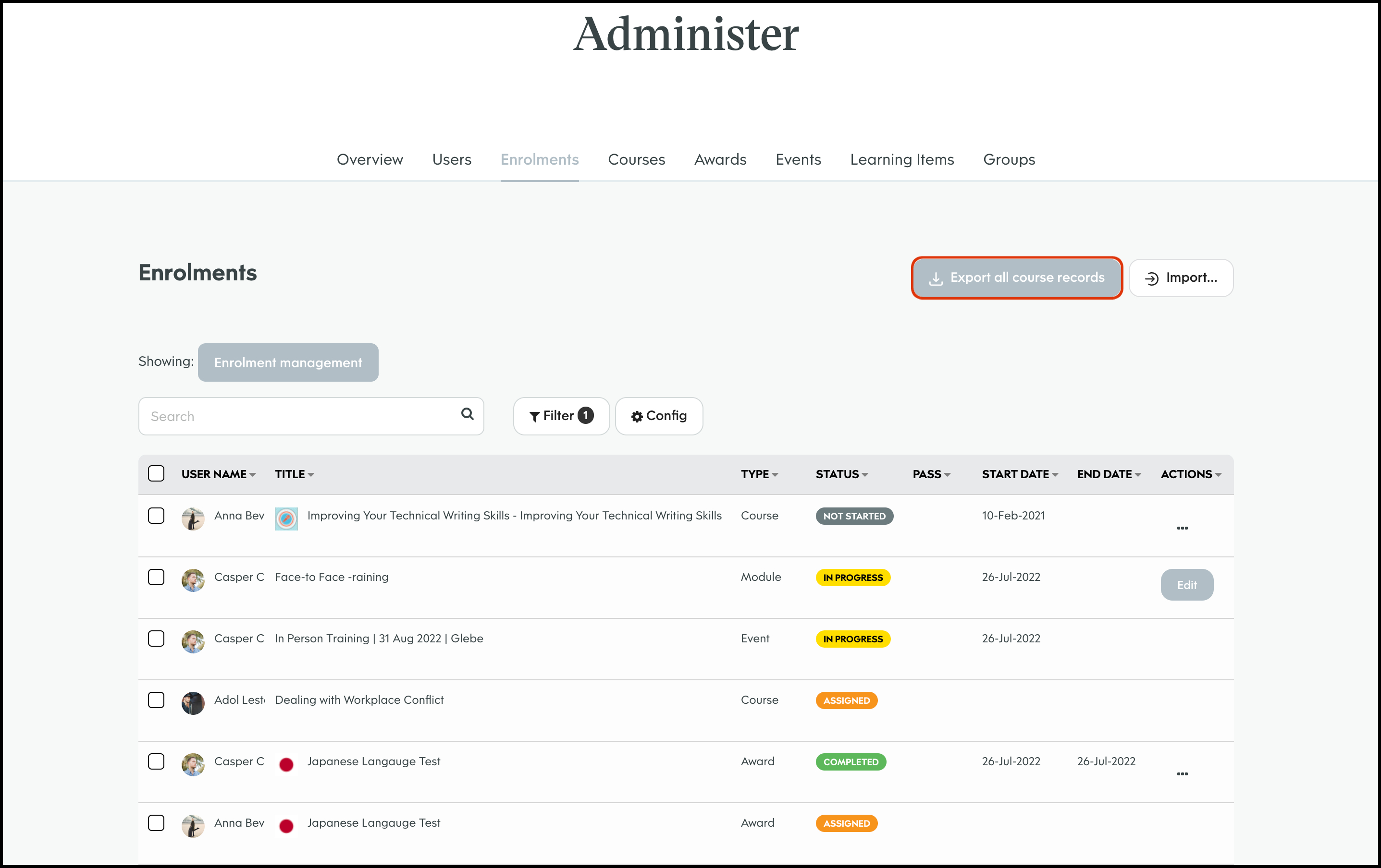 The Enrolment Management module allows you to select a course and bulk import users to assign to said learning material. You can then send out either an in platform notification or an email letting them know of their new job. You can also use this feature to export all your organisation's course records, edit a user's course enrolment details, and delete an entry that is no longer required.
