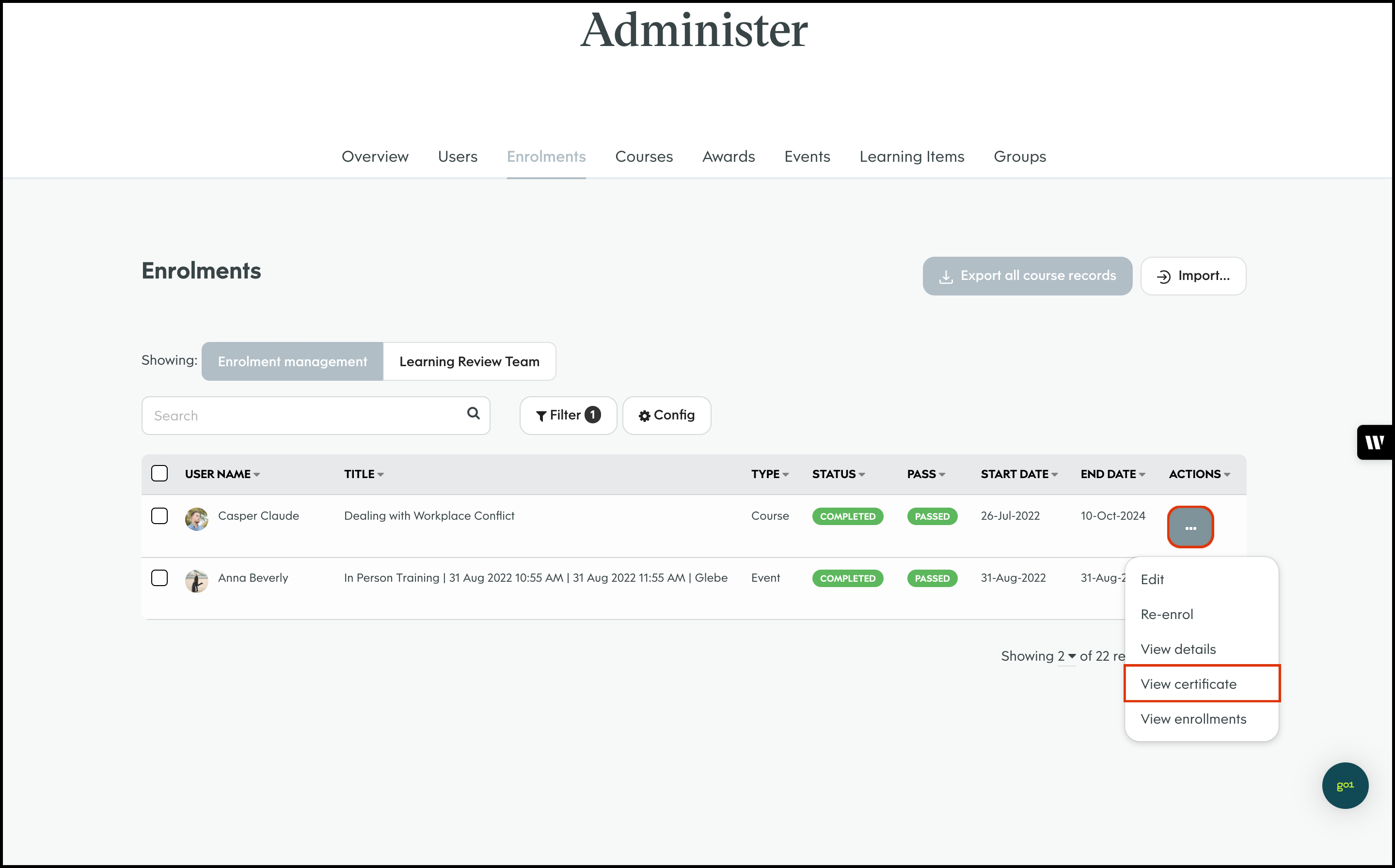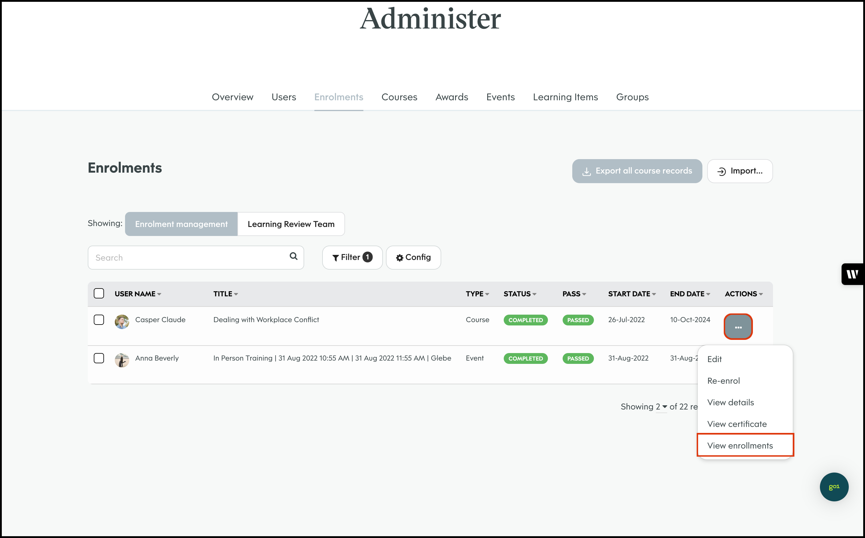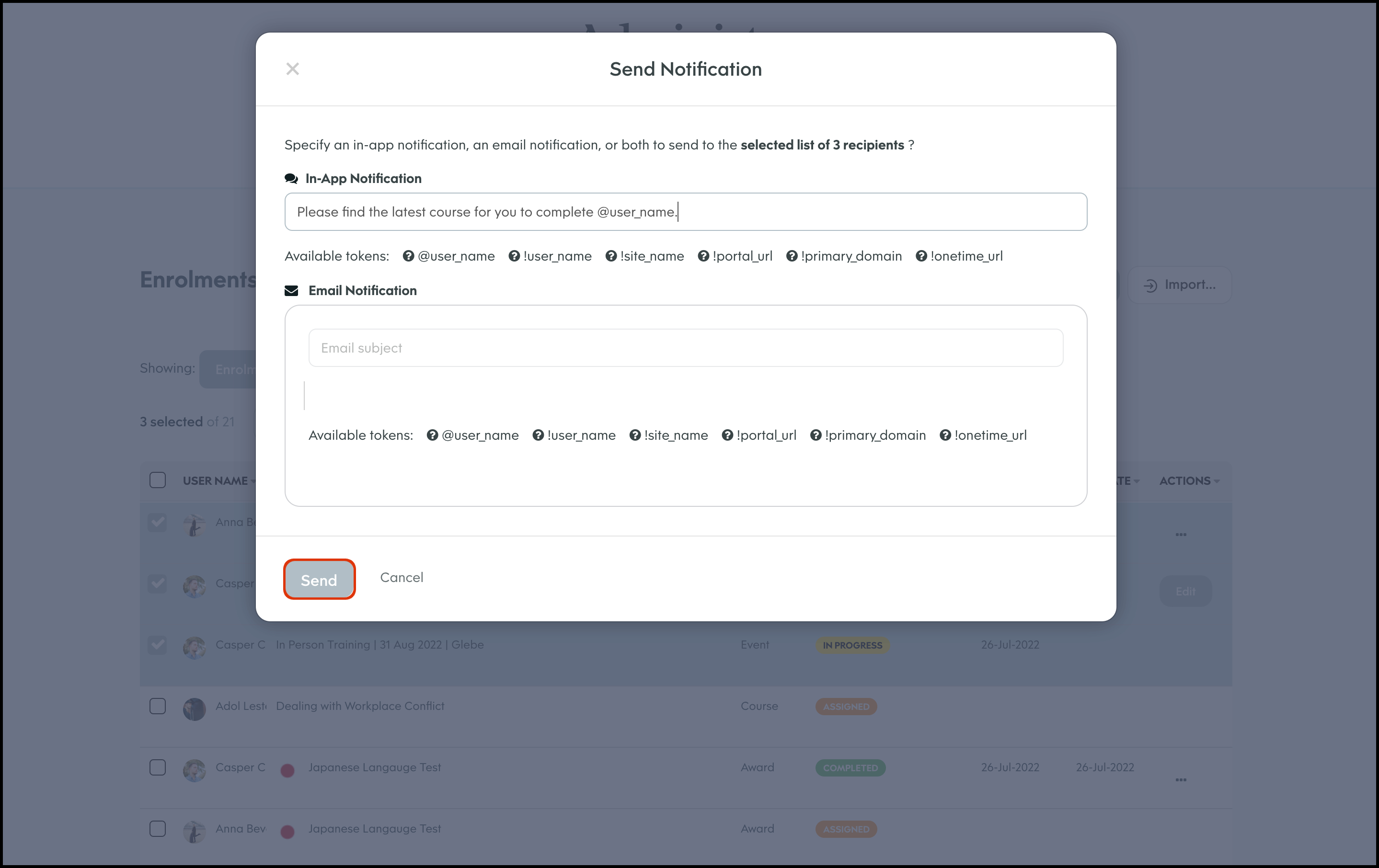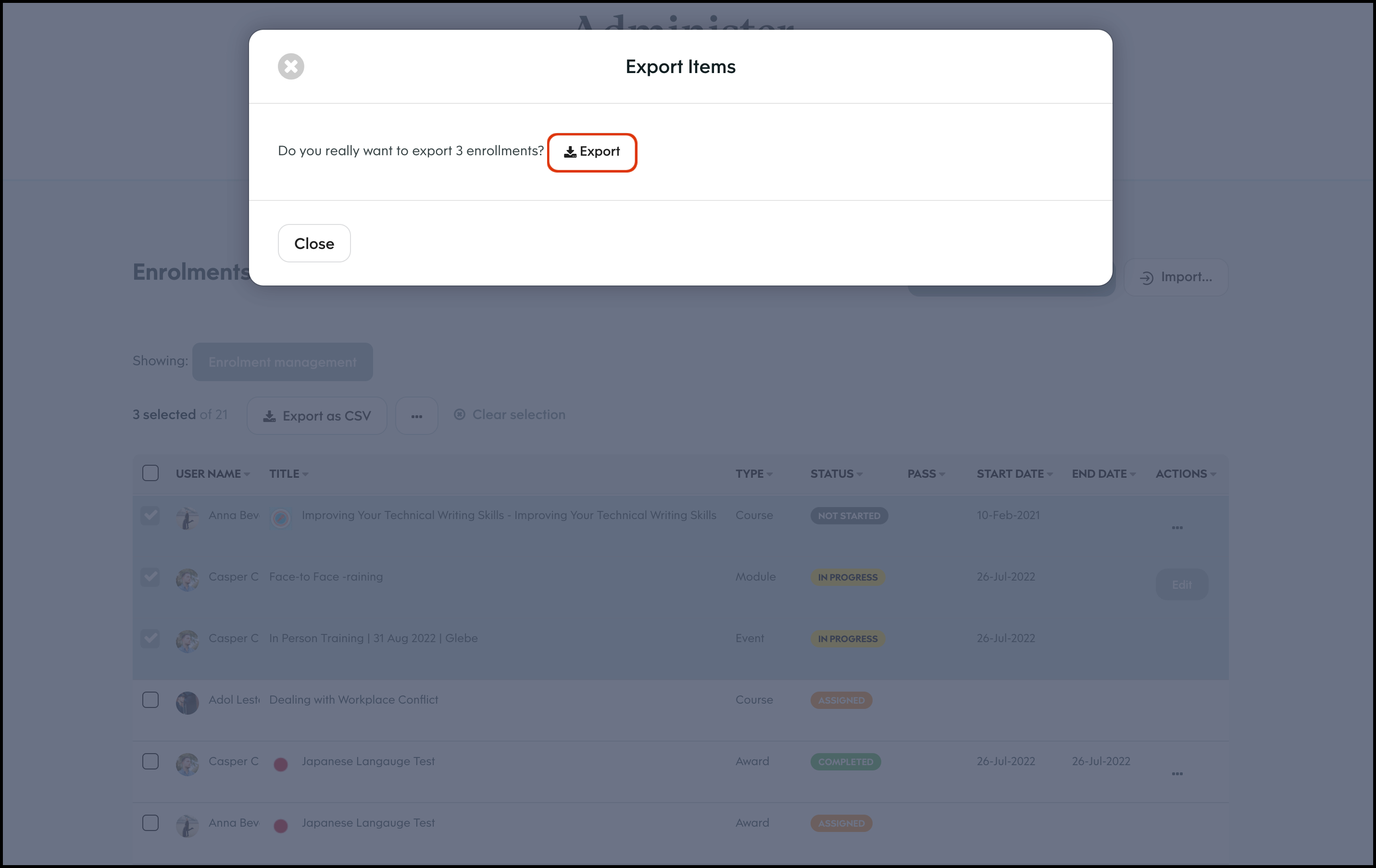 The Enrolment Management module allows you to select a course and bulk import users to assign to said learning material. You can then send out either an in platform notification or an email letting them know of their new job. You can also use this feature to export all your organisation's course records, edit a user's course enrolment details, and delete an entry that is no longer required.