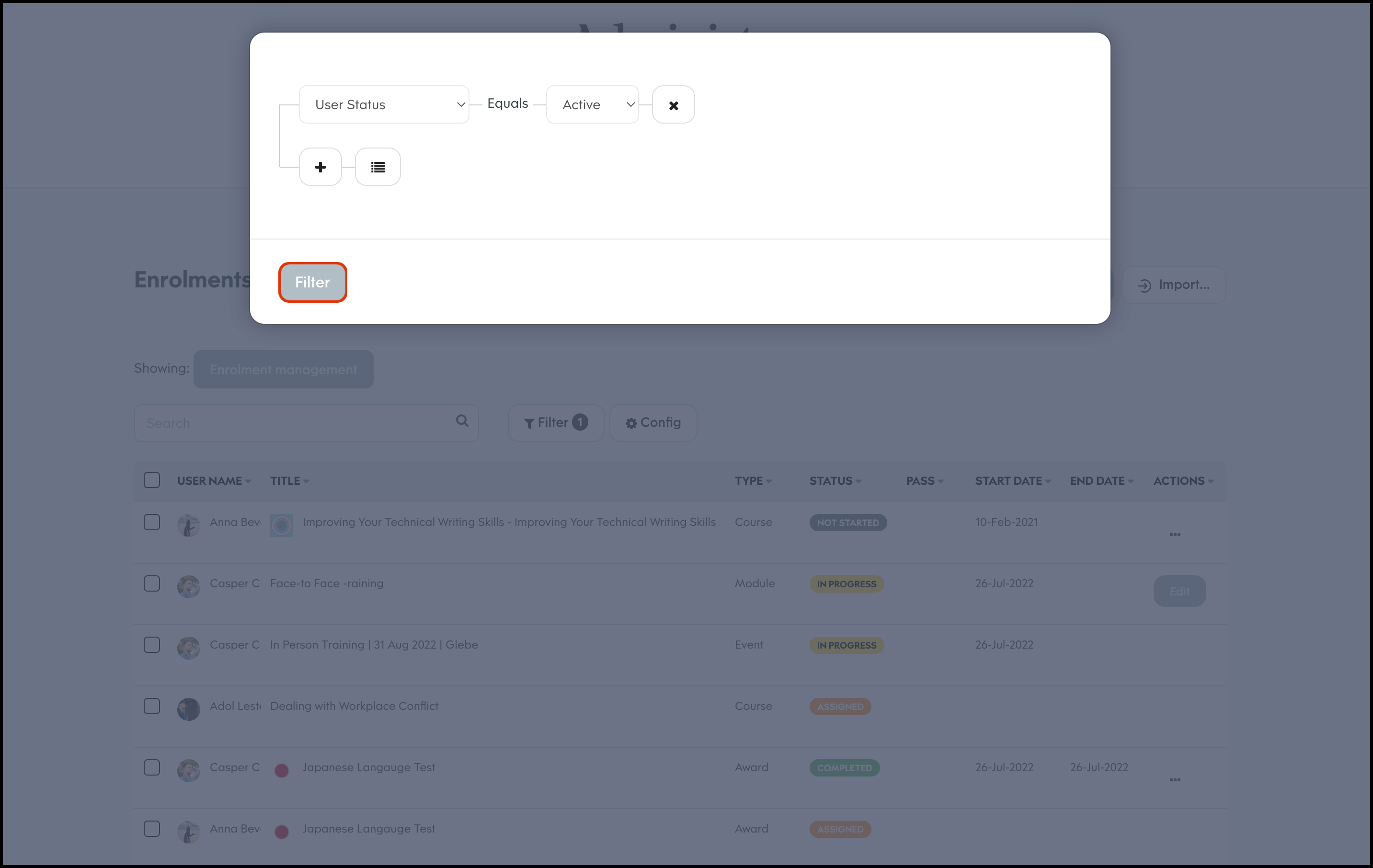 Filter displayed enrolments