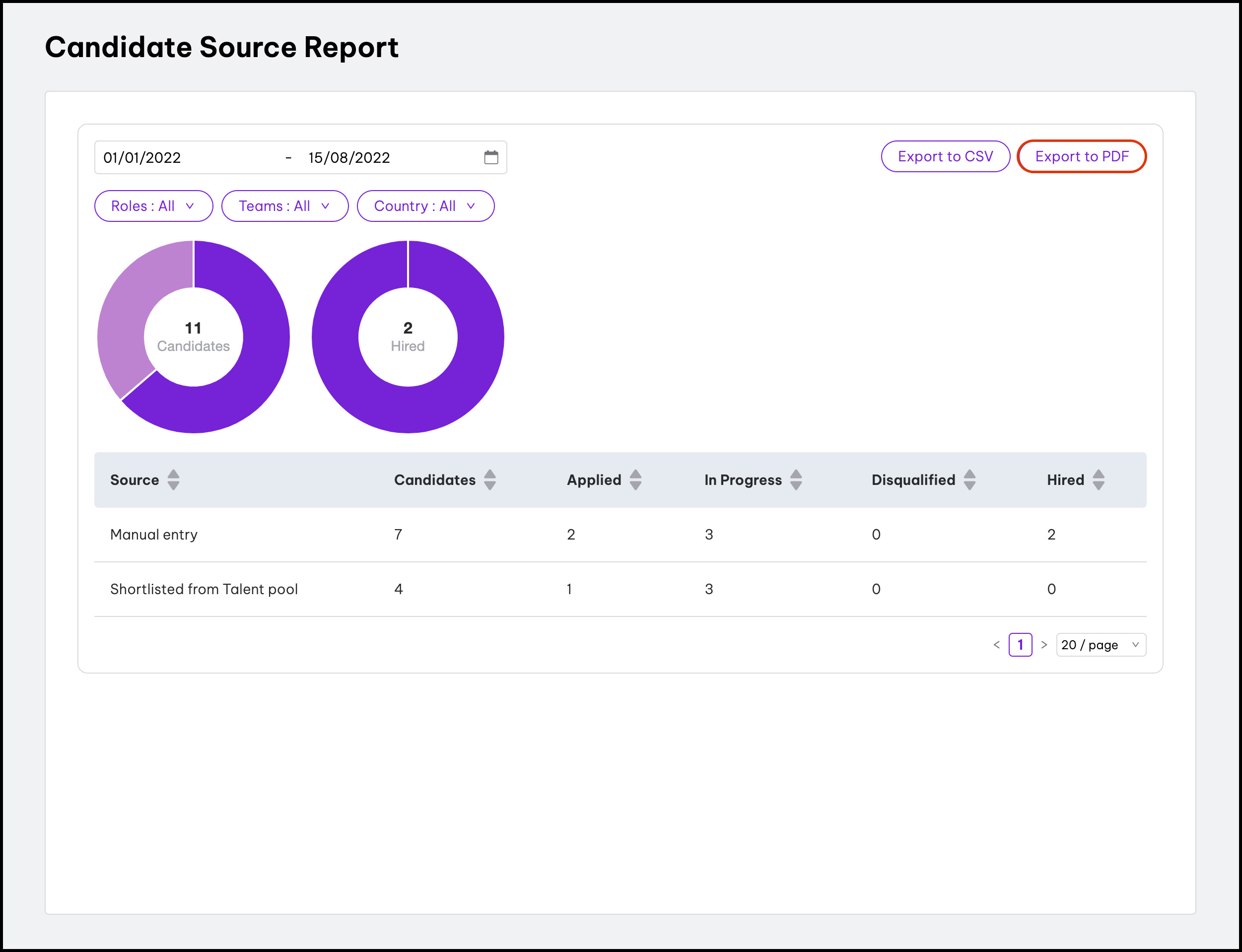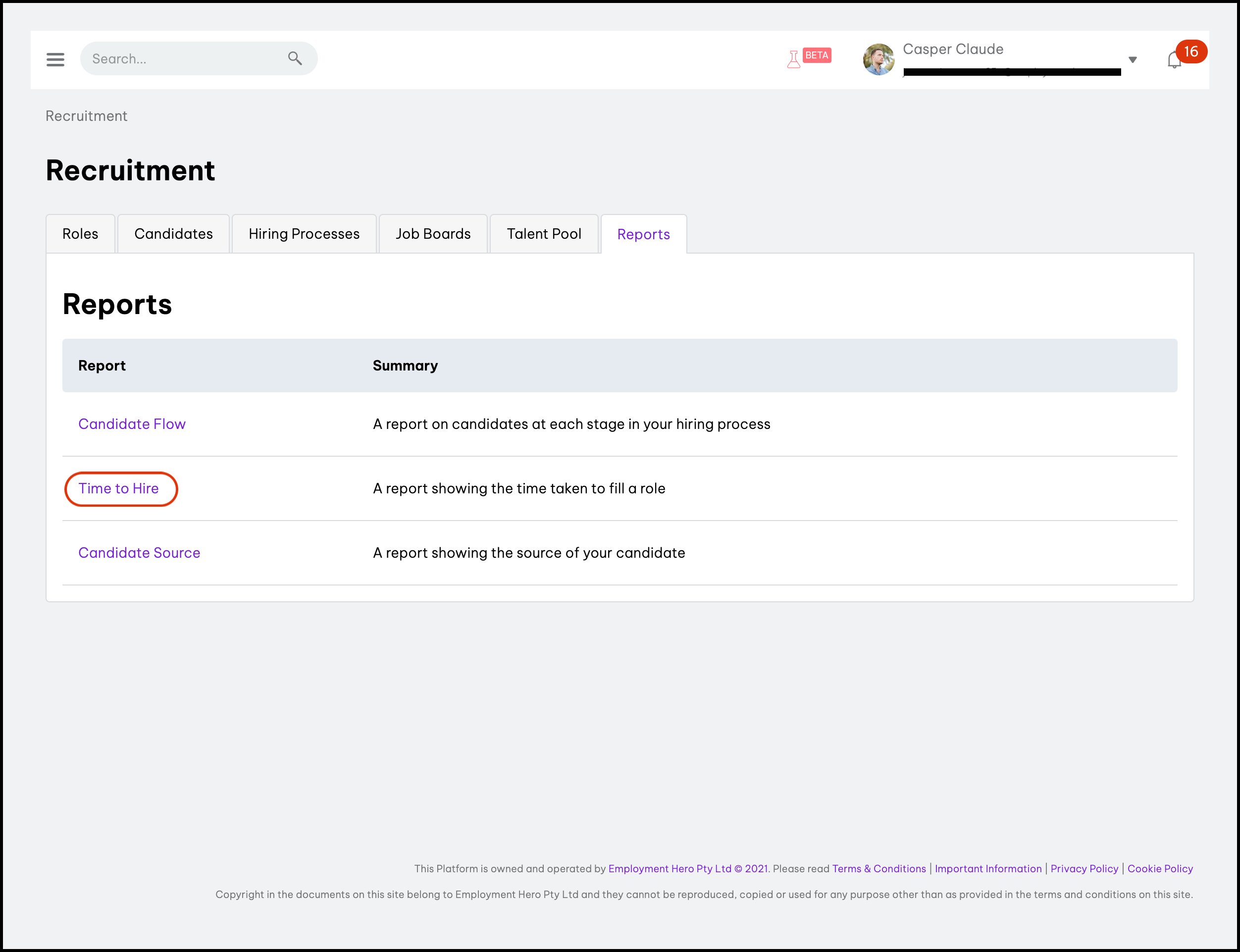 In Recruitment, you can create and download three reports to understand and gain insights into your organisation's recruitment process. These three are Candidate Flow, Time to Hire, and Candidate Source reports. You can also use this feature to download a CSV file of the data. This lets you load the report into a CSV-supported program like Microsoft Excel, or as a PDF document you can share with an external user.