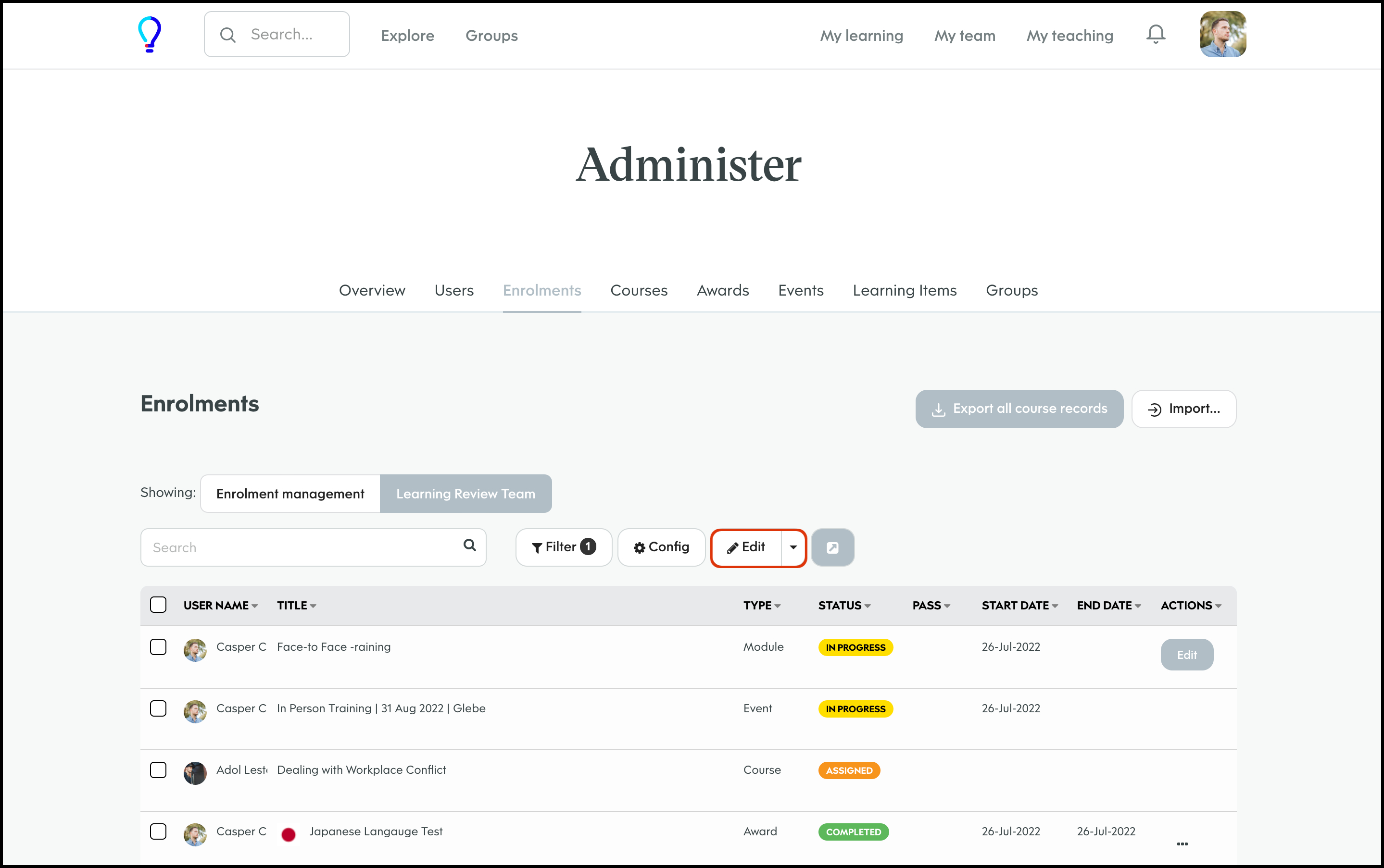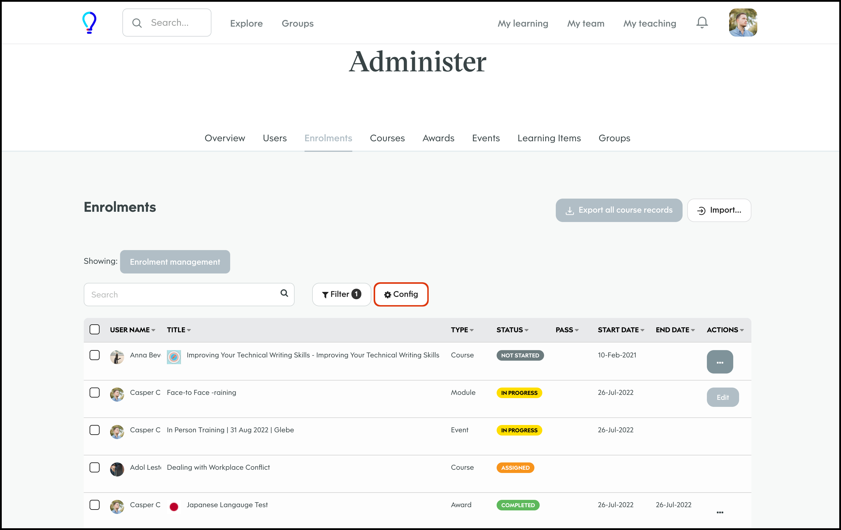 The Enrolment Management section lets you customise your report page by choosing to have the data shown in a table, calendar, or histogram. You can also customise what columns to include in each of these layouts and then save this view so you can access it again later. Finally, you can share this custom view with others on your learning platform, edit the information if it changes, and delete a record if it is no longer relevant.
