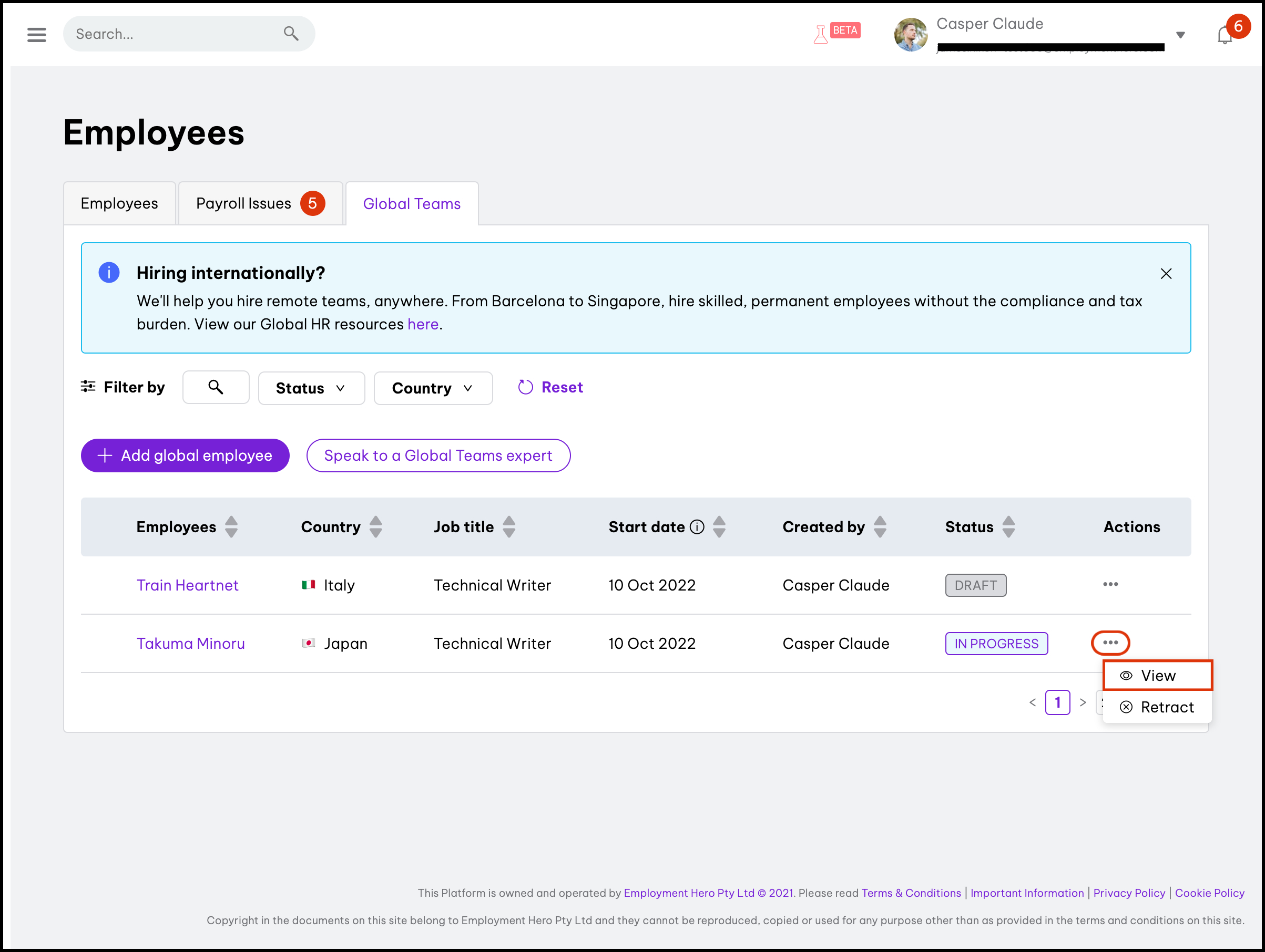 You can use the Onboarding Status page to see the status of your Global Teams employee request and how Employment Hero is progressing with your submission.