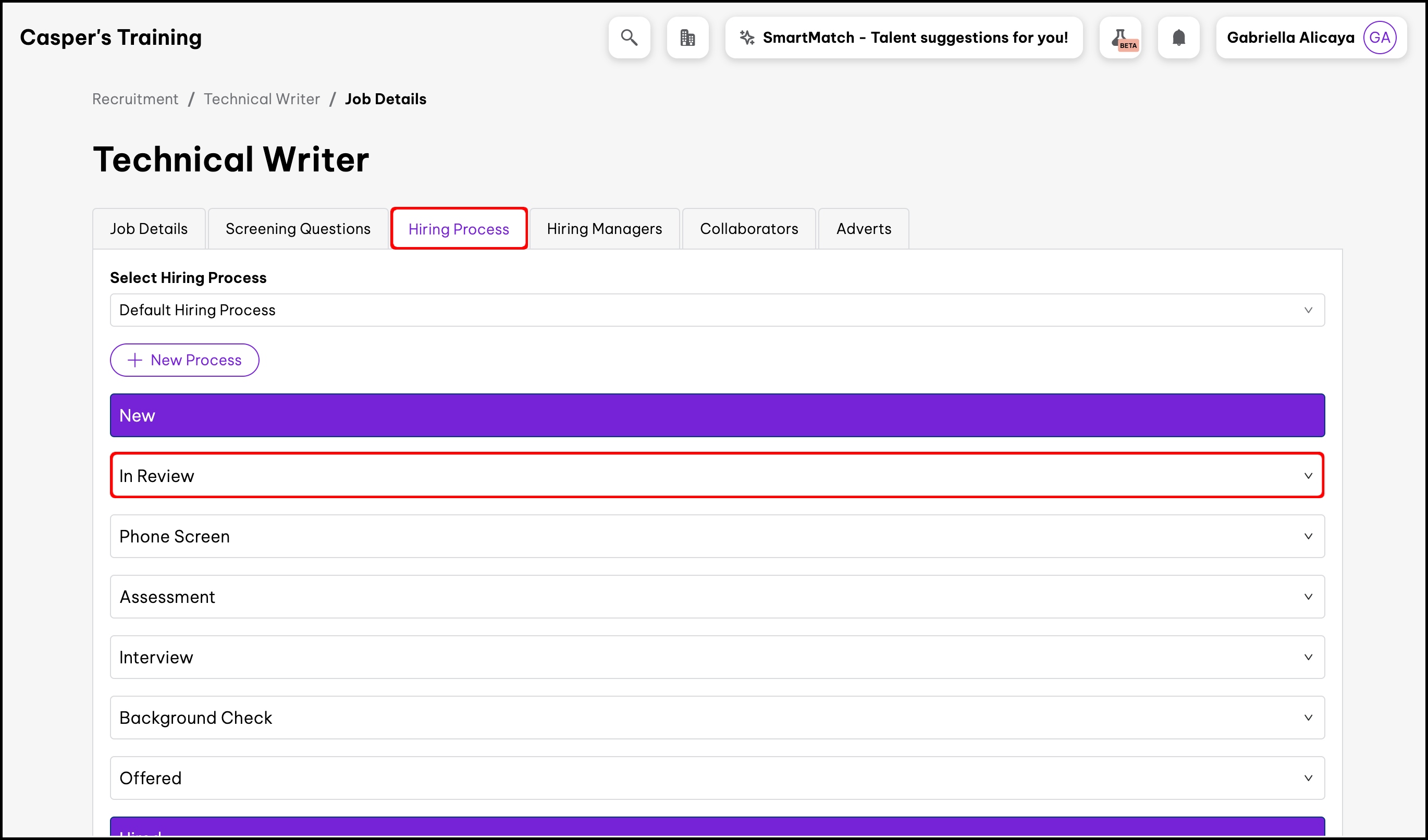screenshot of the open role, highlighting the hiring processes tab and a hiring phase