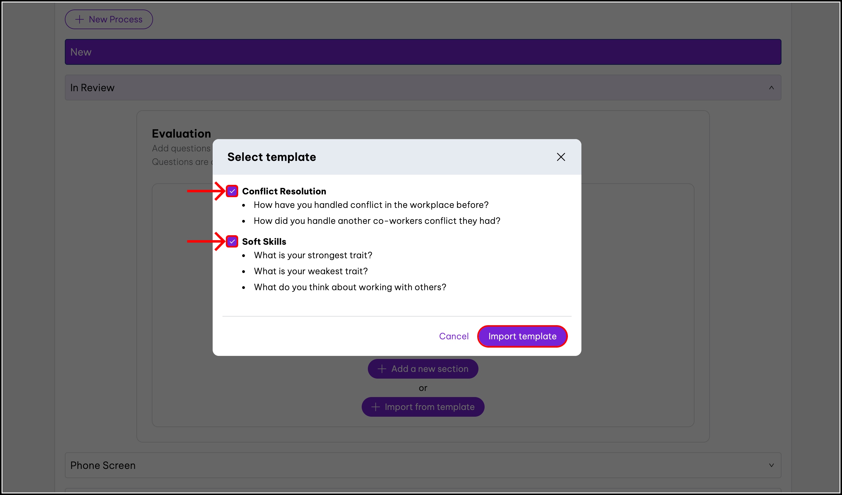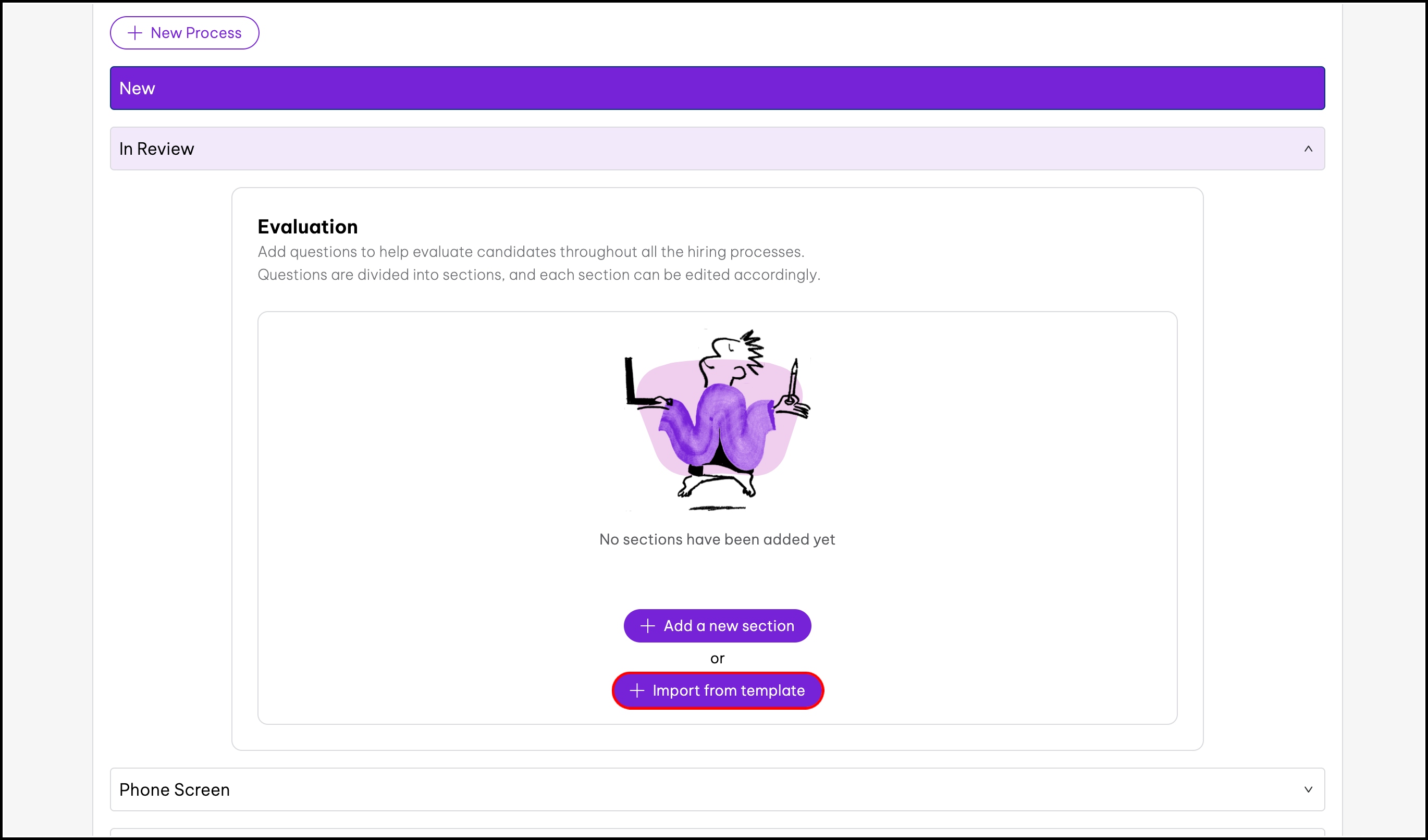 screenshot of the chosen hiring process, highlighting the import from template button