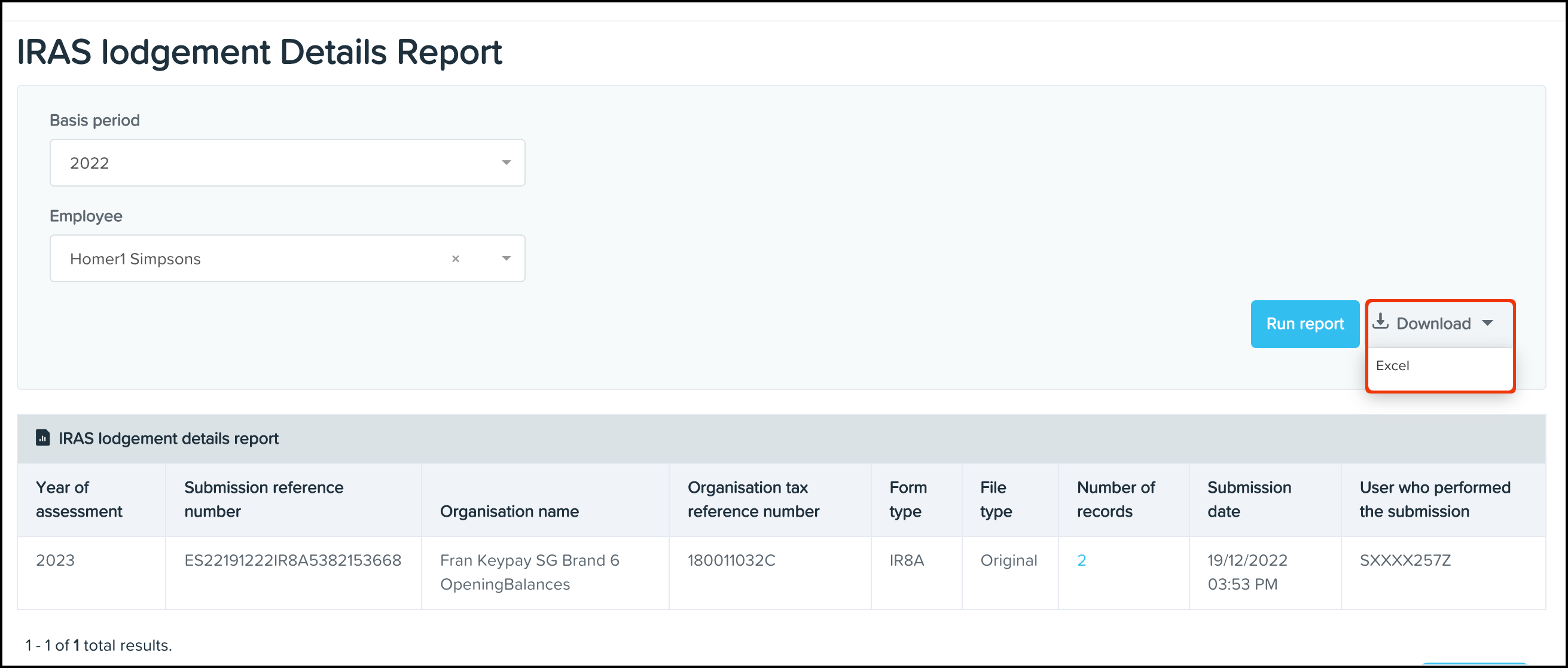 The IRAS lodgement details report lists the submission information for IRAS lodgements that have been submitted. The report allows users to check what submissions have been made, who completed these, and when.